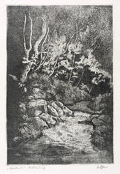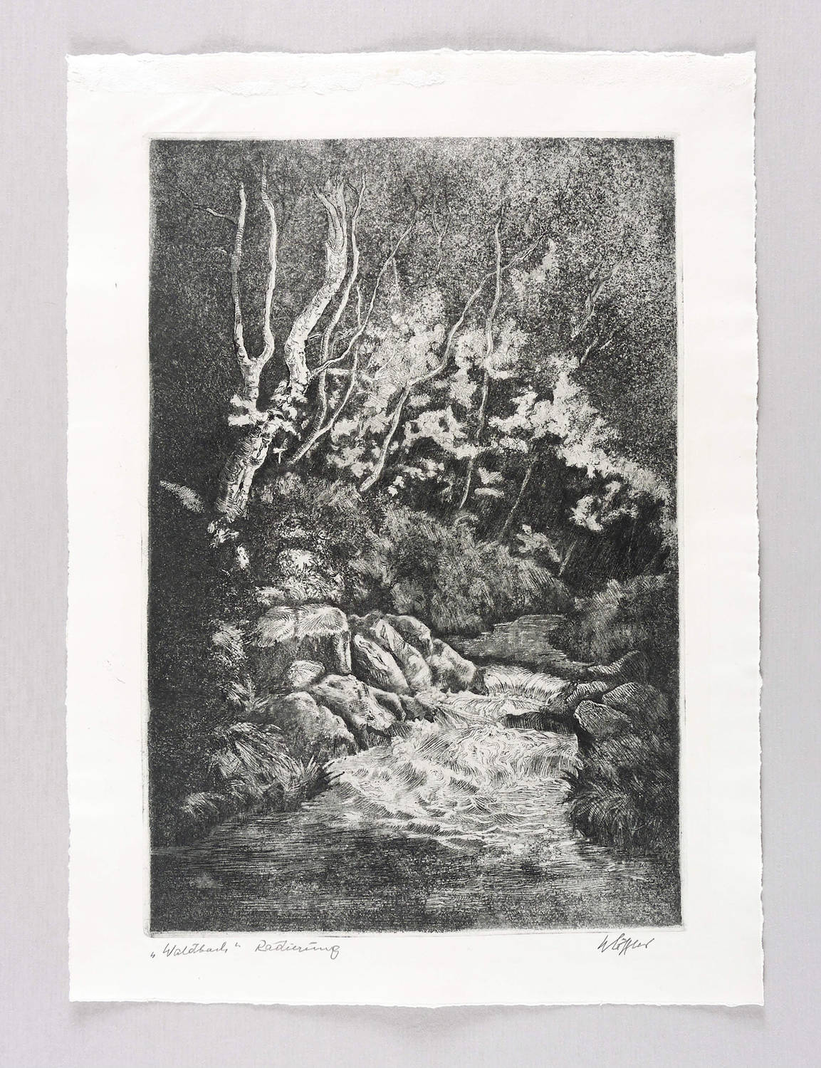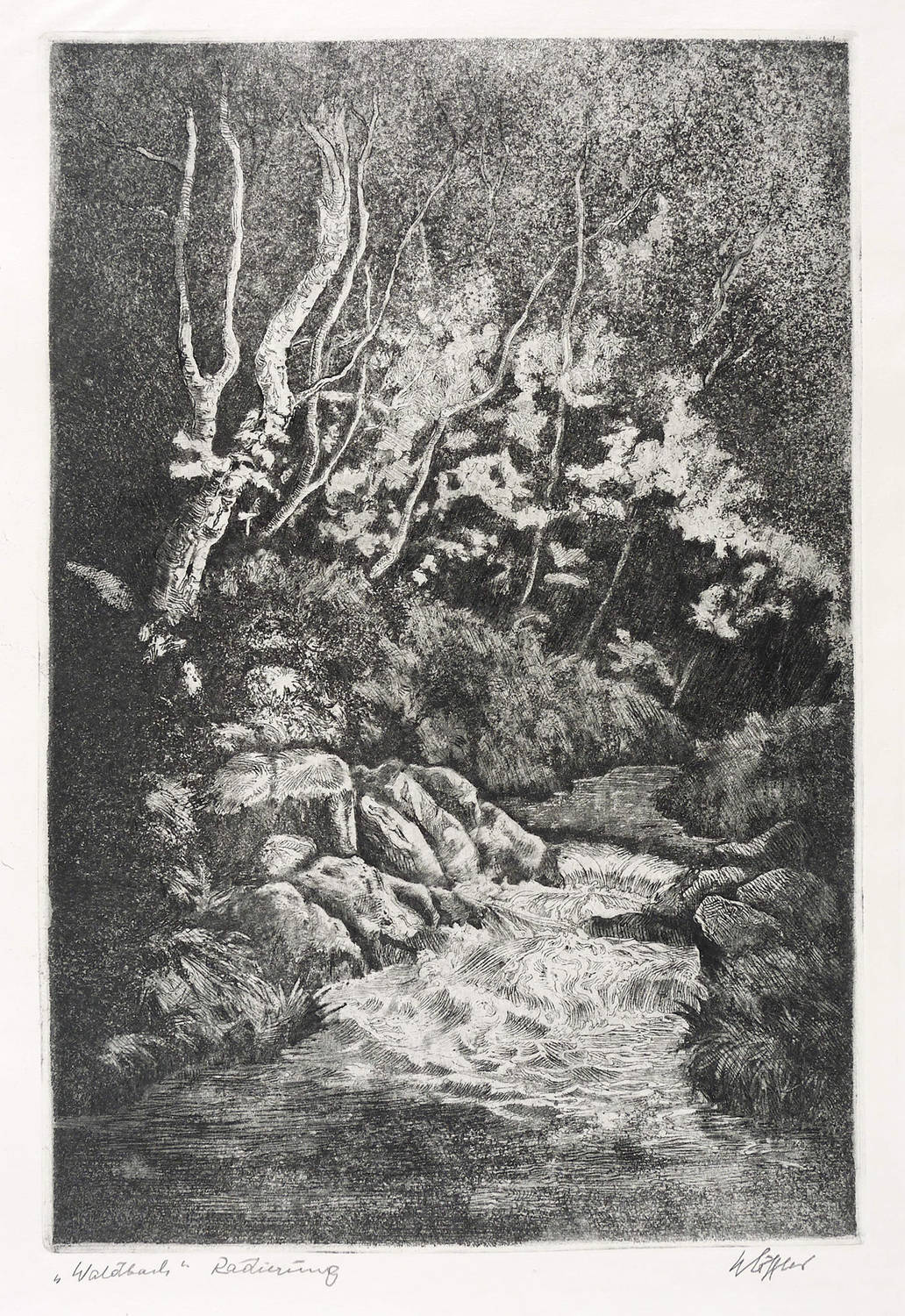 Rechts unten in Bleistift signiert und datiert, etwa: [W?] Löffler″. Links bezeichnet: ″Waldbach / Radierung″. – Sehr guter Zustand.