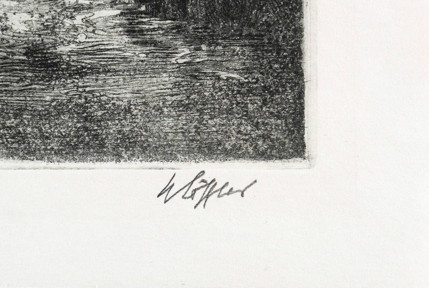 1970-1980. Radierung / Aquatinta & Strichätzung, in Schwarz, auf hellchamois Velin. – Originale Künstlergrafik, von W. Löffler. – 28,9 x 19,6 cm (Darstellung / Platte), 35 x 25 cm (Blatt).