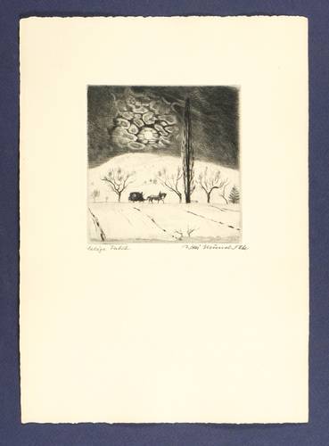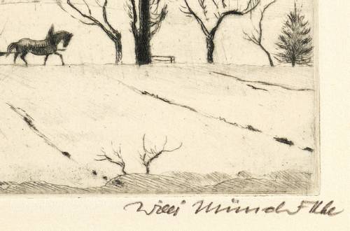 1920-1925. Radierung / Strichätzung & Kaltnadel, in Blauschwarz, auf hellgelbem Kupferdruckbütten. – Originale Künstlergrafik, von Willi Münch-Khe. – 10,3 x 10,0 cm (Darstellung / Platte), 27 x 19 cm (Blatt).