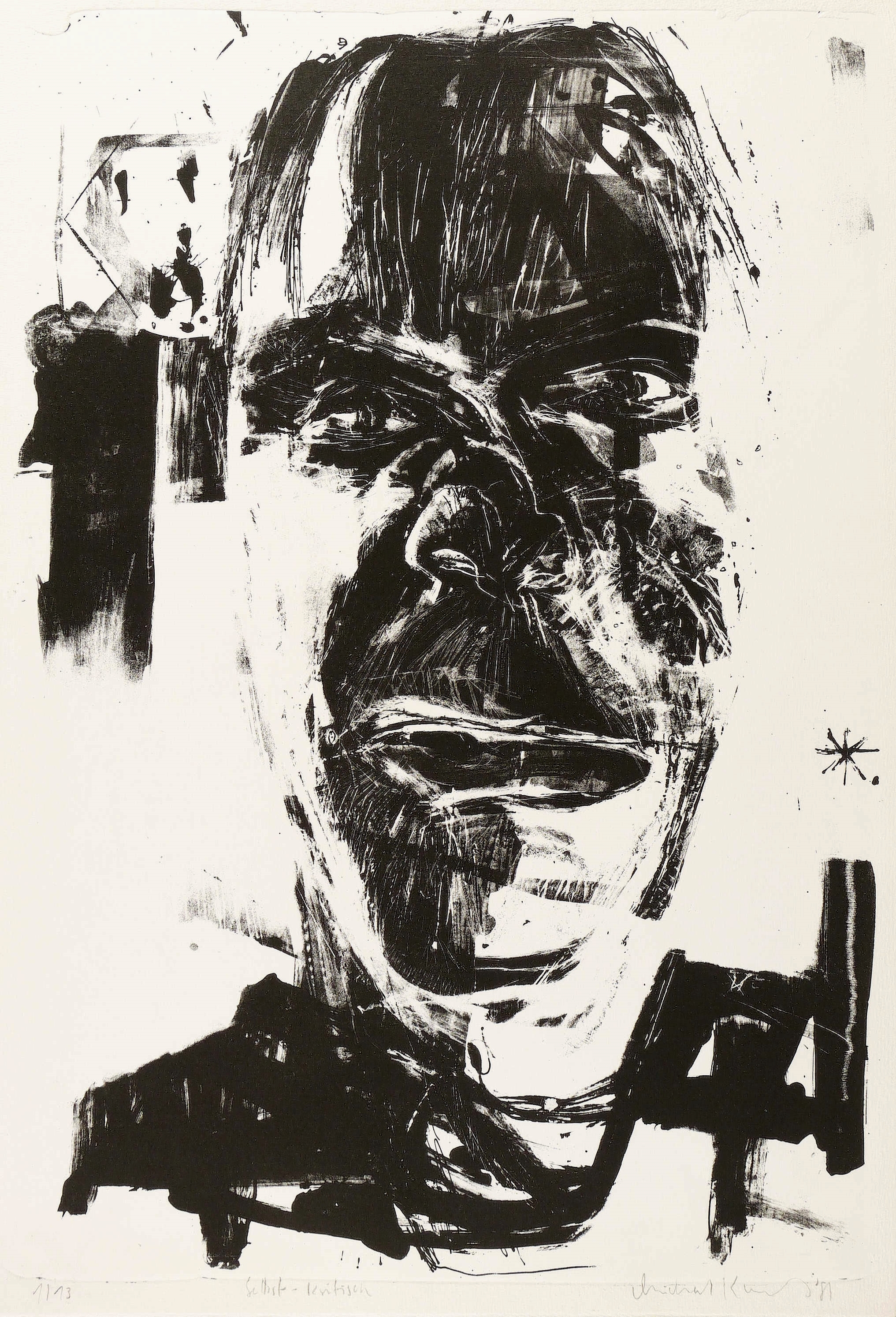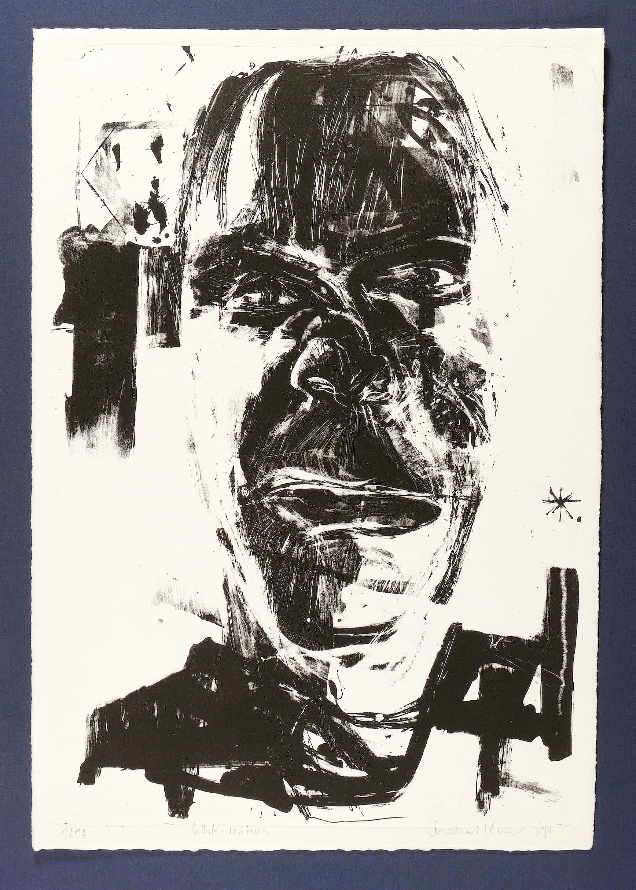 1985. Lithografie / Pinsellithografie, partiell geschabt, in Schwarz, auf weißem Büttenpapier. – Originale Künstlergrafik, von Michael Kunert. – Auflage Exemplar Nr. 1/13. – 53,8 x 38,0 cm (Darstellung / Stein), 57 x 39 cm (Blatt).