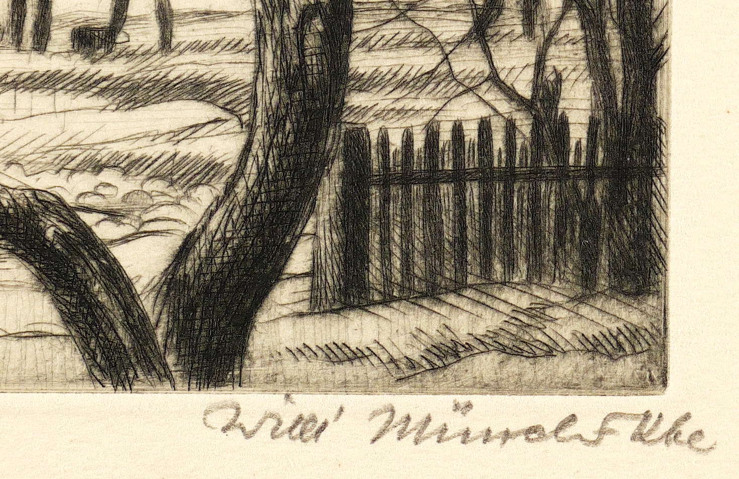 Um 1920. Radierung / Kaltnadel, in Schwarz, auf gelblichem Kupferdruckkarton. – Originale Künstlergrafik, von Willi Münch-Khe. – 10,1 x 12,5 cm (Darstellung / Platte), 19 x 27 cm (Blatt).