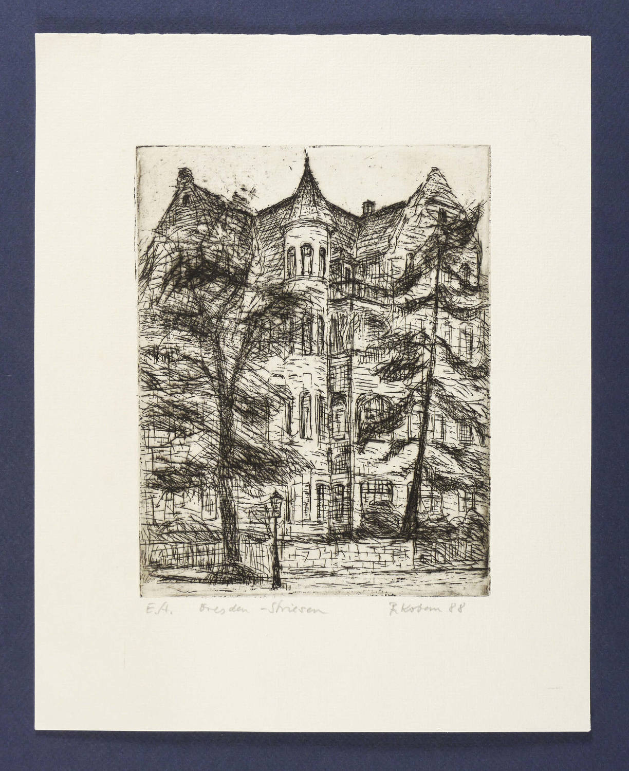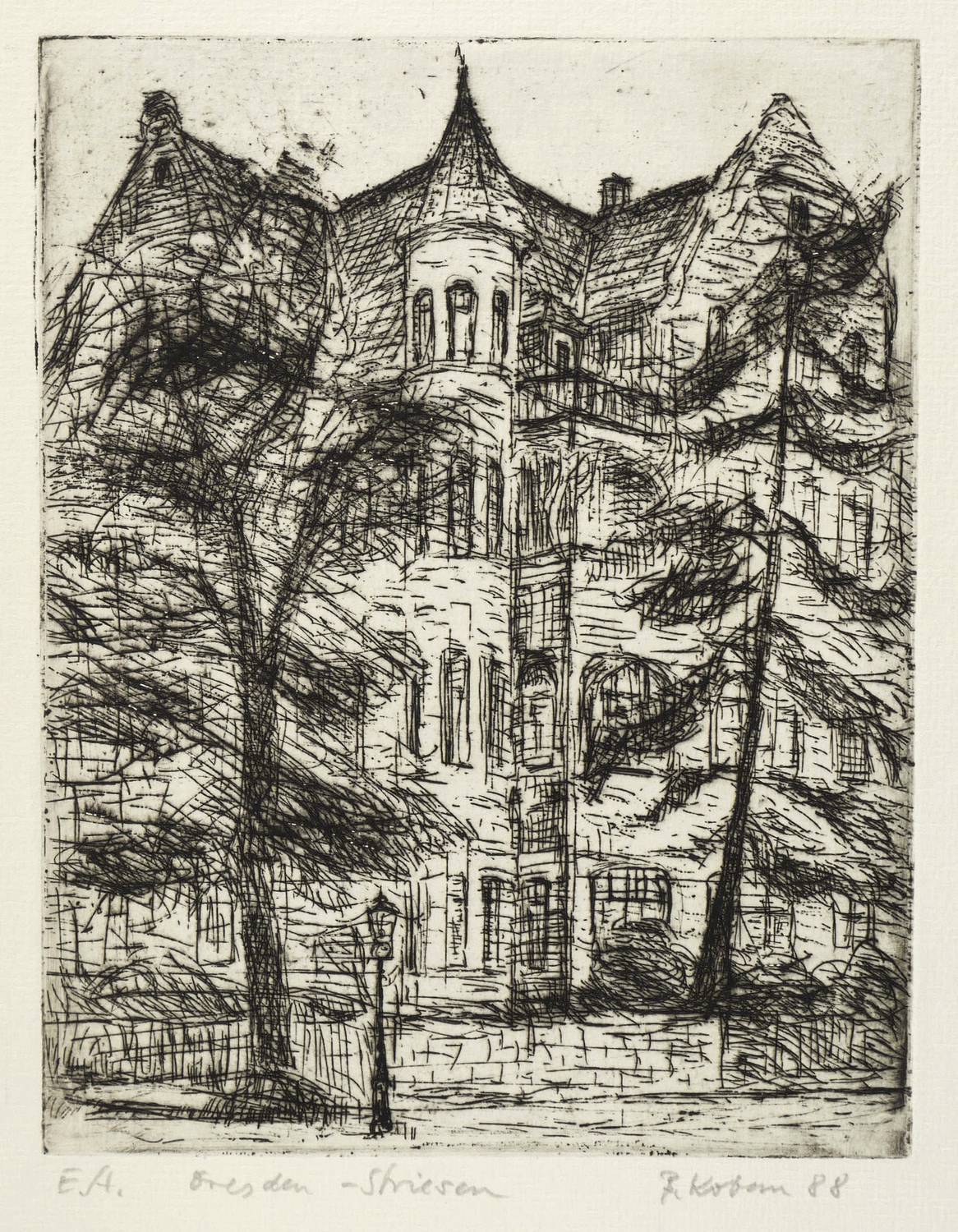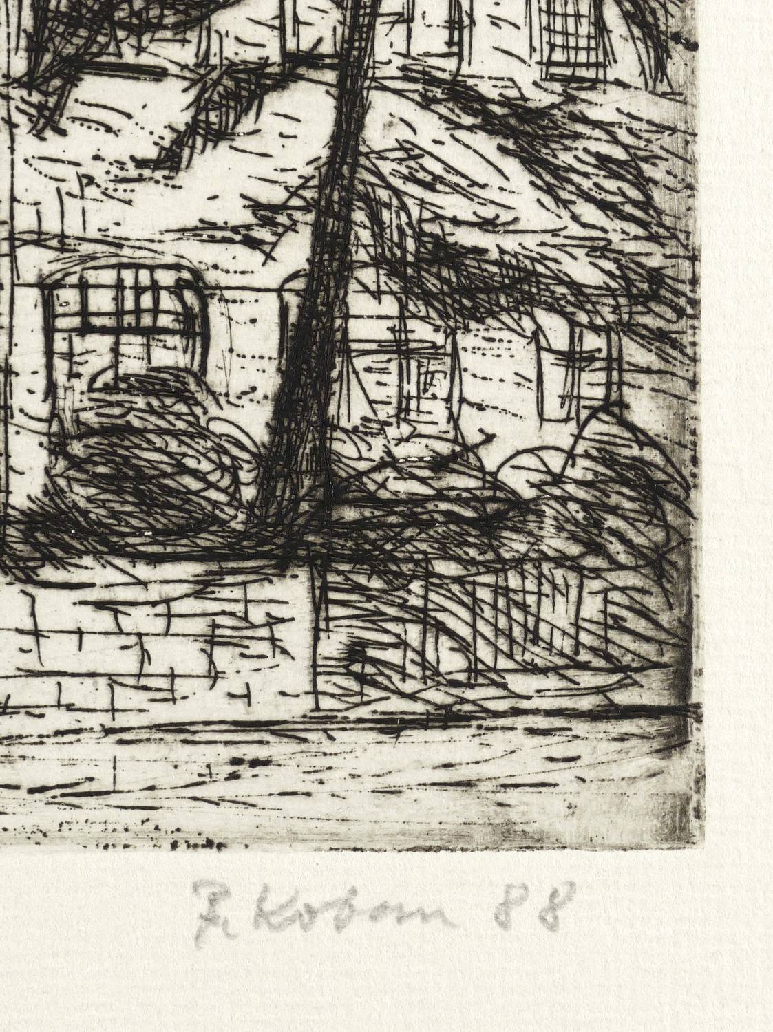 1988. Radierung / Strichätzung, mit Plattenton, in Schwarz, auf Hahnemühle-Bütten. – Originale Künstlergrafik, von Bernhard Koban. – Künstlerexemplar (e.a.). – 20,0 x 15,5 cm (Darstellung / Platte), 31 x 25 cm (Blatt).