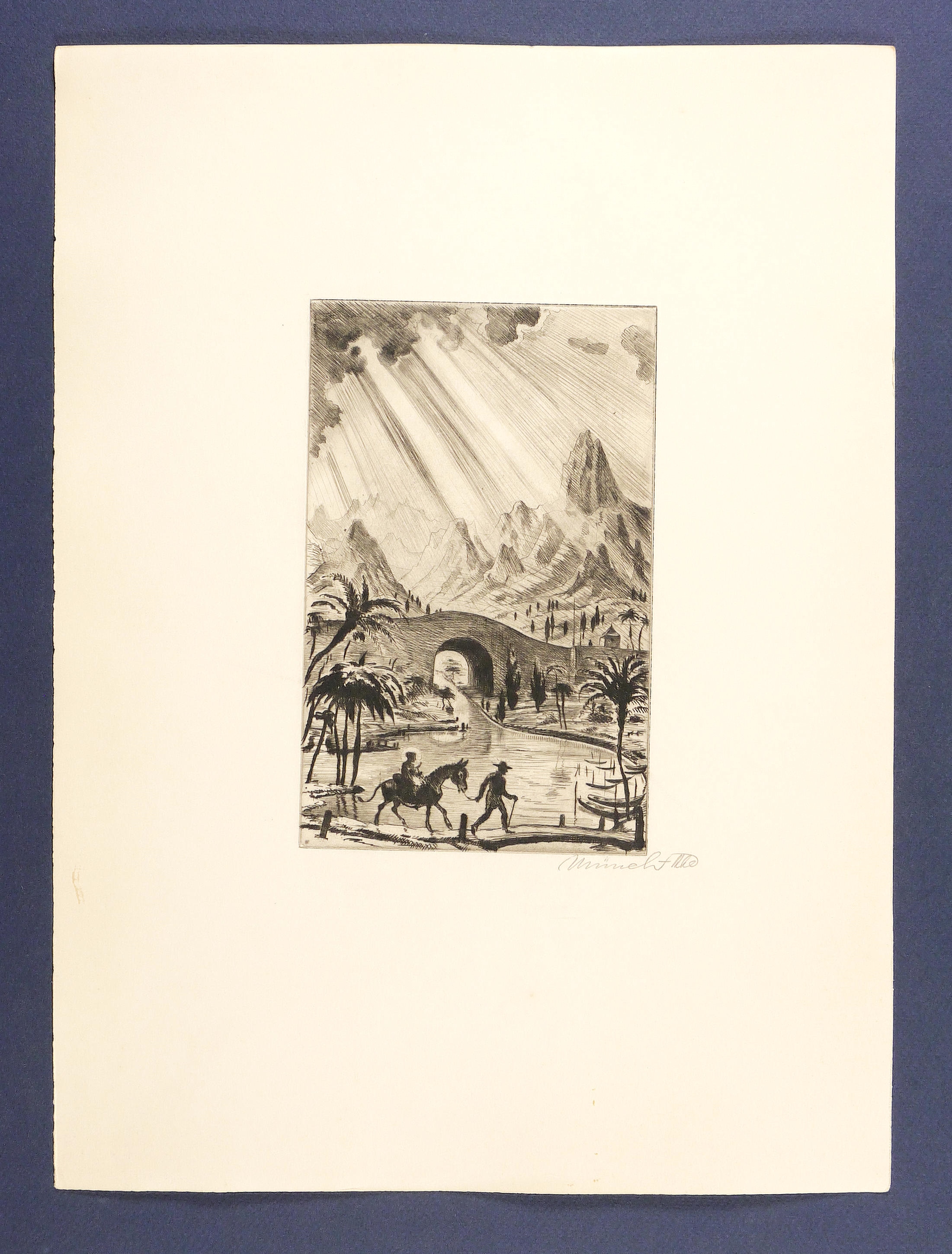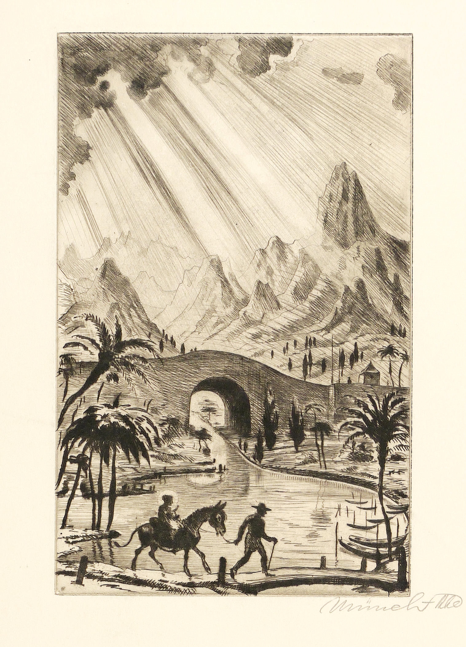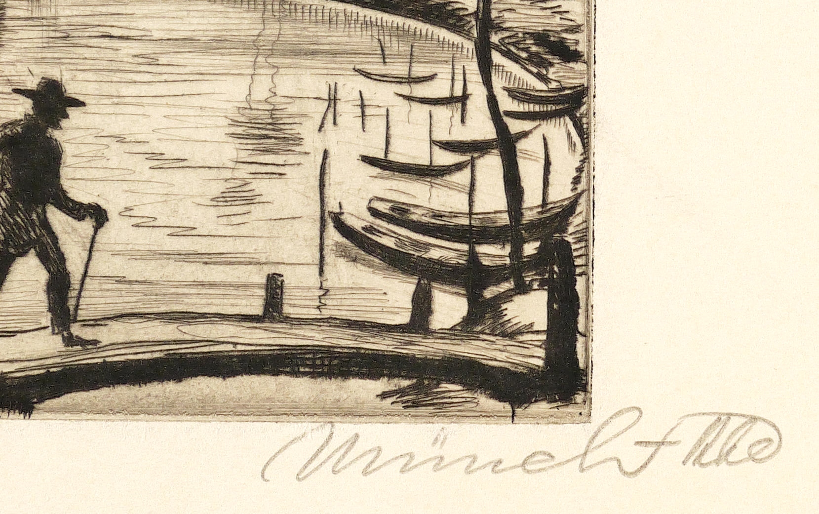 1922. Radierung / Kaltnadel, in Schwarz, auf glattem gelblichem Büttenkarton. – Originale Künstlergrafik, von Willi Münch-Khe. – 19,8 x 12,6 cm (Darstellung / Platte), 42 x 31 cm (Blatt).