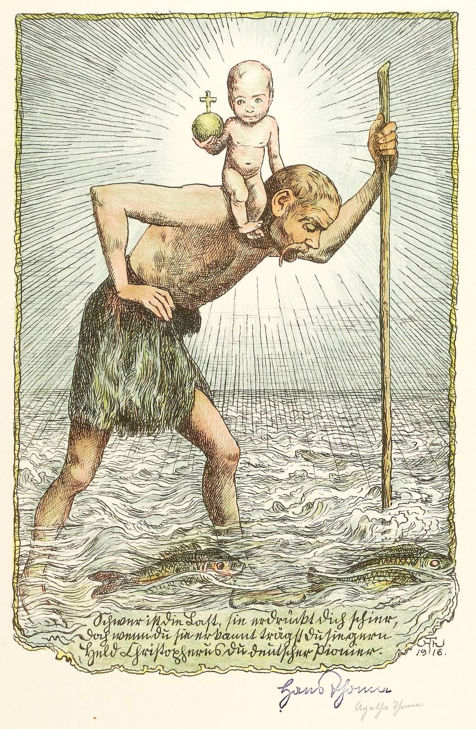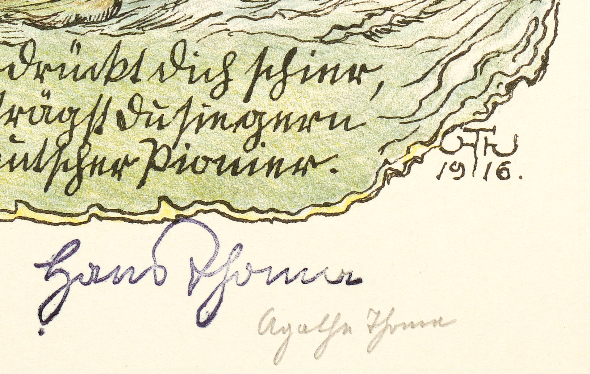 1916. Farblithografie / Kreide- & Federlithografie, in 4 Farben, auf hellgelbem Karton. – Von Hans Thoma. – 30,5 x 20,5 cm (Darstellung / Druckbild), 42 x 30 cm (Blatt).