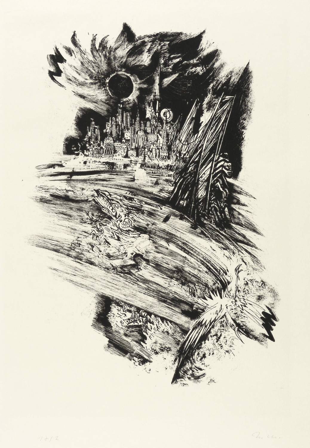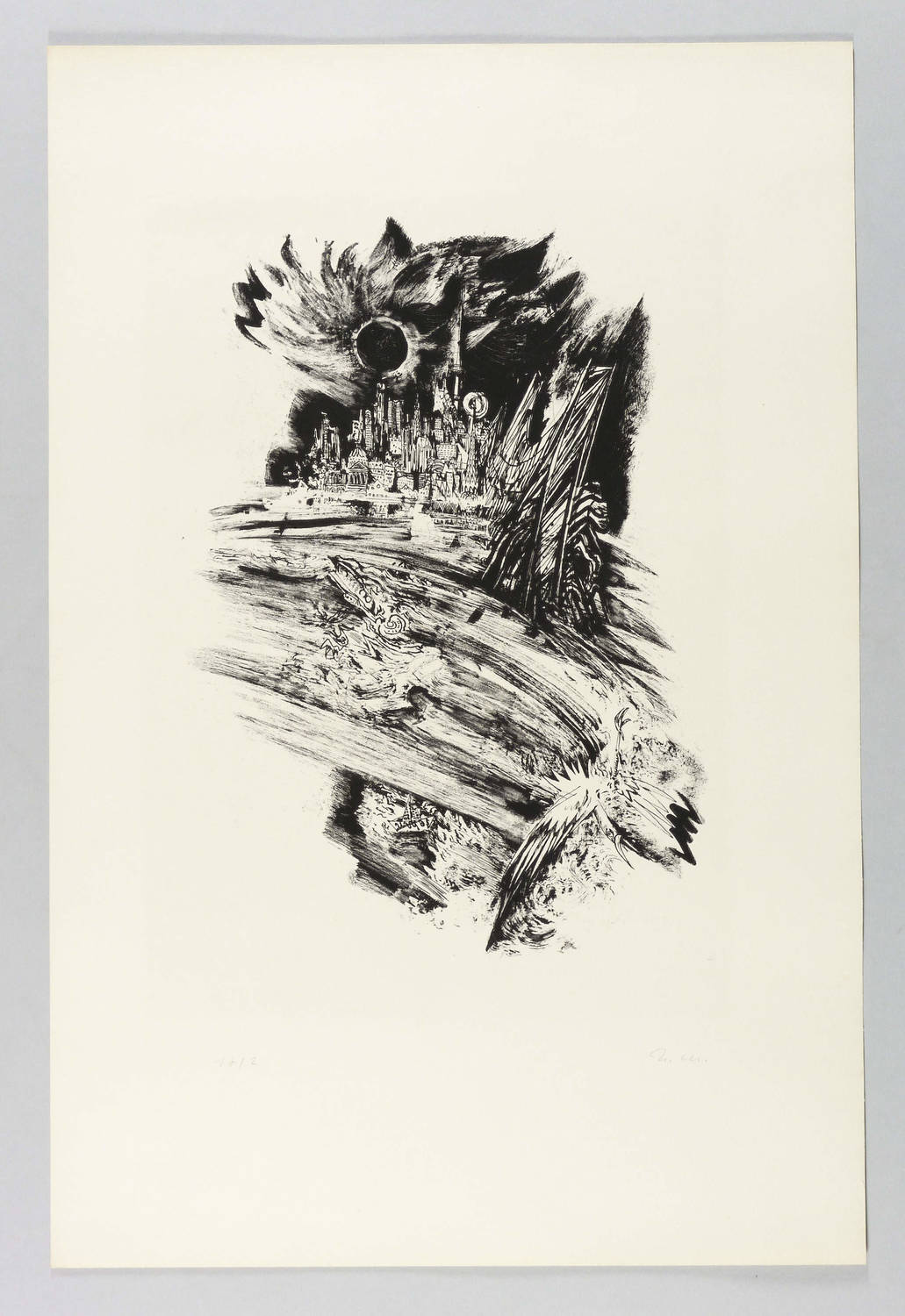 1969. Lithografie / Kreide-, Pinsel- & Federlithografie, partiell geschabt, in Schwarz, auf hellgelbem Karton. – Originale Künstlergrafik, von Ursula Mattheuer-Neustädt. – Auflage Exemplar Nr. 2/17. – 37,5 x 24,0 cm (Darstellung / Druckbild), 60 x 40 cm (Blatt).