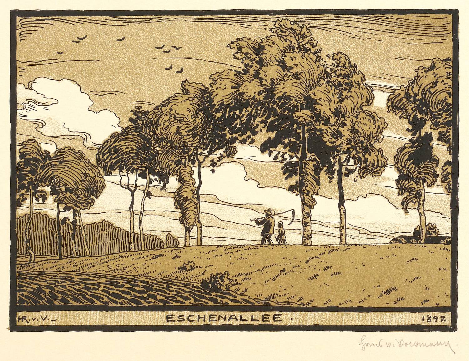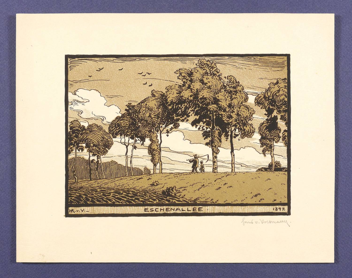 Rechts unten in Bleistift signiert: ″Hans v. Volkmann″. Im Stein unten Monogramm. Titel und Jahr: ″HR. v. V. / ESCHENALLEE / 1897.″ Verso Stempel Künstlerbund Karlsruhe, Verlag der G. Braun'schen Hofbuchdruckerei mit handschriftlicher Katalognummer ″11″. – Sehr gut erhalten.