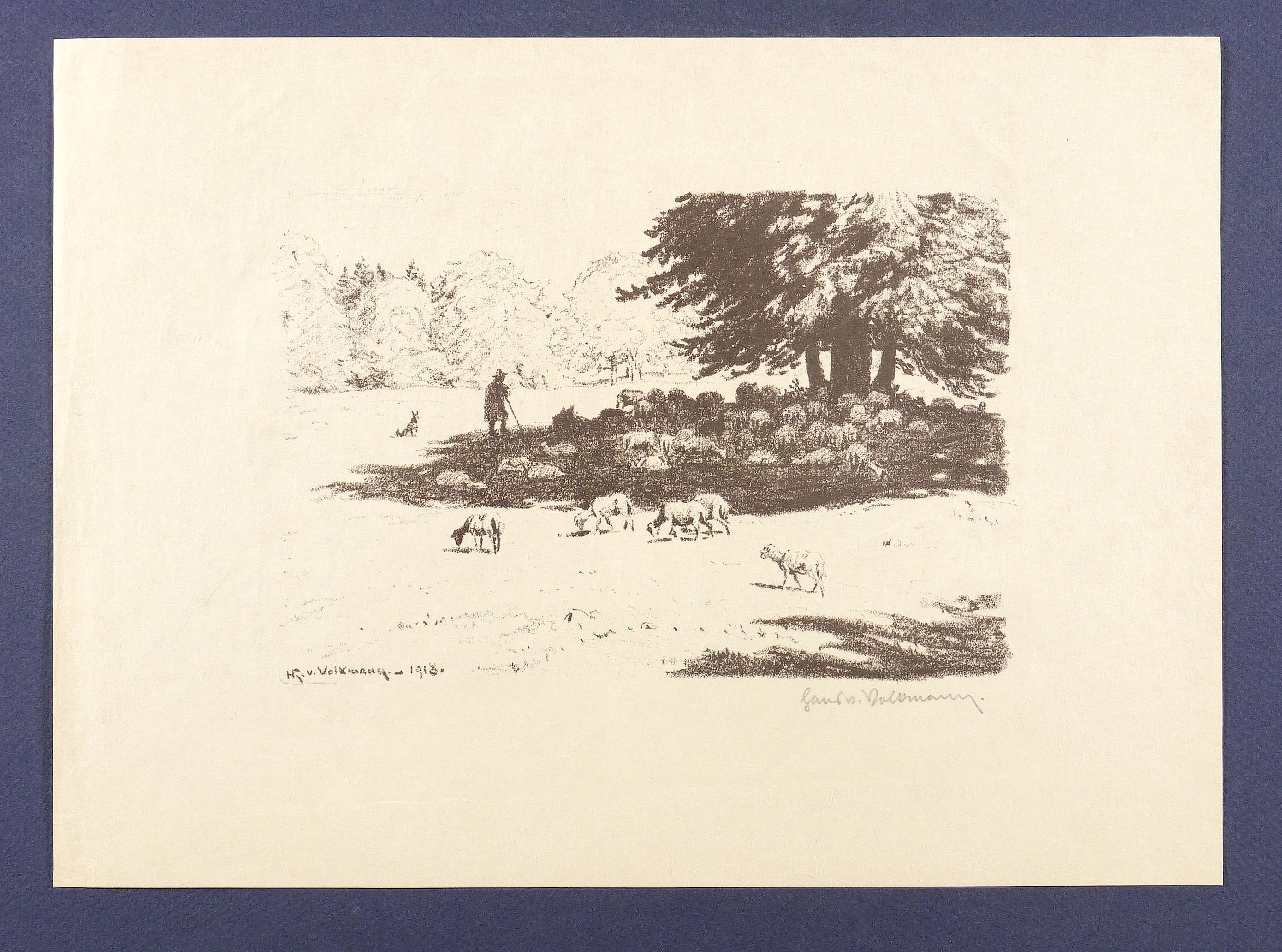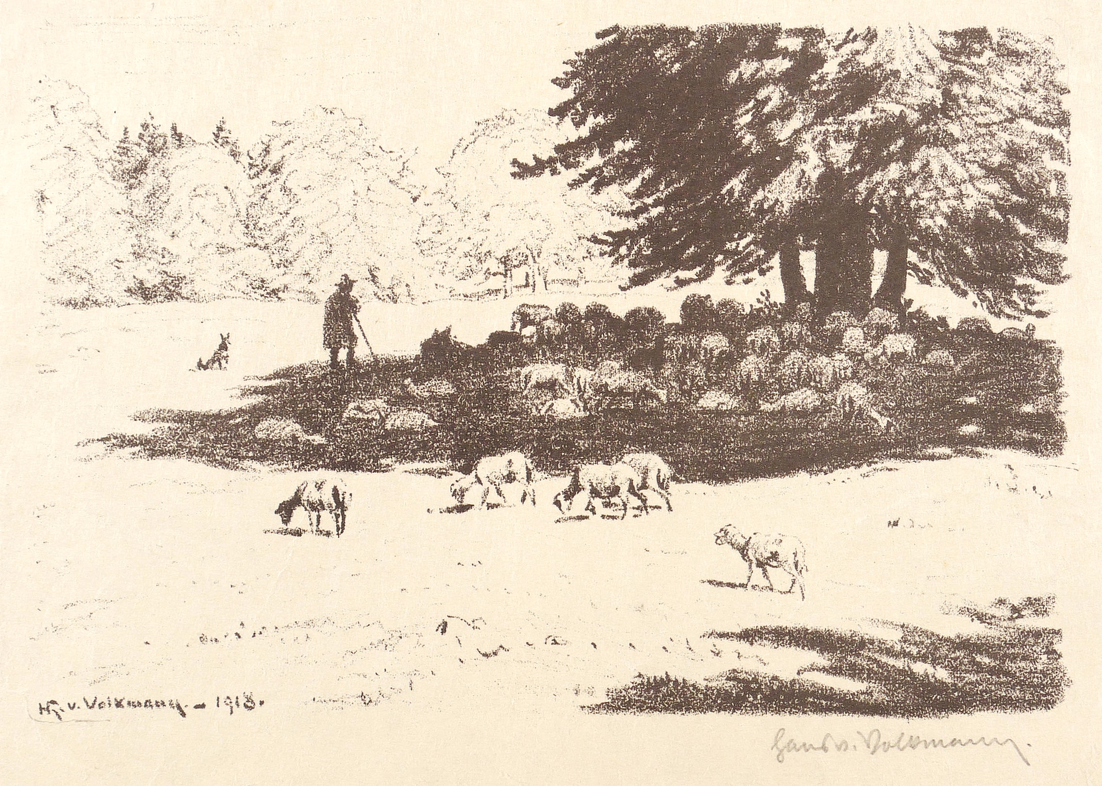 Rechts unten in Bleistift signiert: ″Hans v. Volkmann.″ Im Stein links unten Signatur und Jahr: ″HR. v. Volkmann. - 1918.″ – Geringfügig knickspurig im Blattrand. Sonst gut erhalten.