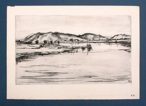 In der Platte monogrammiert unten rechts. Außerhalb der Platte in Bleistift signiert unten rechts. Am Blattrand rechts unten gestempelt ″FK″, mittig in Bleistift monogrammiert und links unten bezeichnet ″Selbstdruck″. – Blattrand etwas knickspurig und angeschmutzt. Am oberen Blattrand kleiner Einriß. Dieser verso hinterlegt. Insgesamt noch gut bis mangelhaft erhalten.