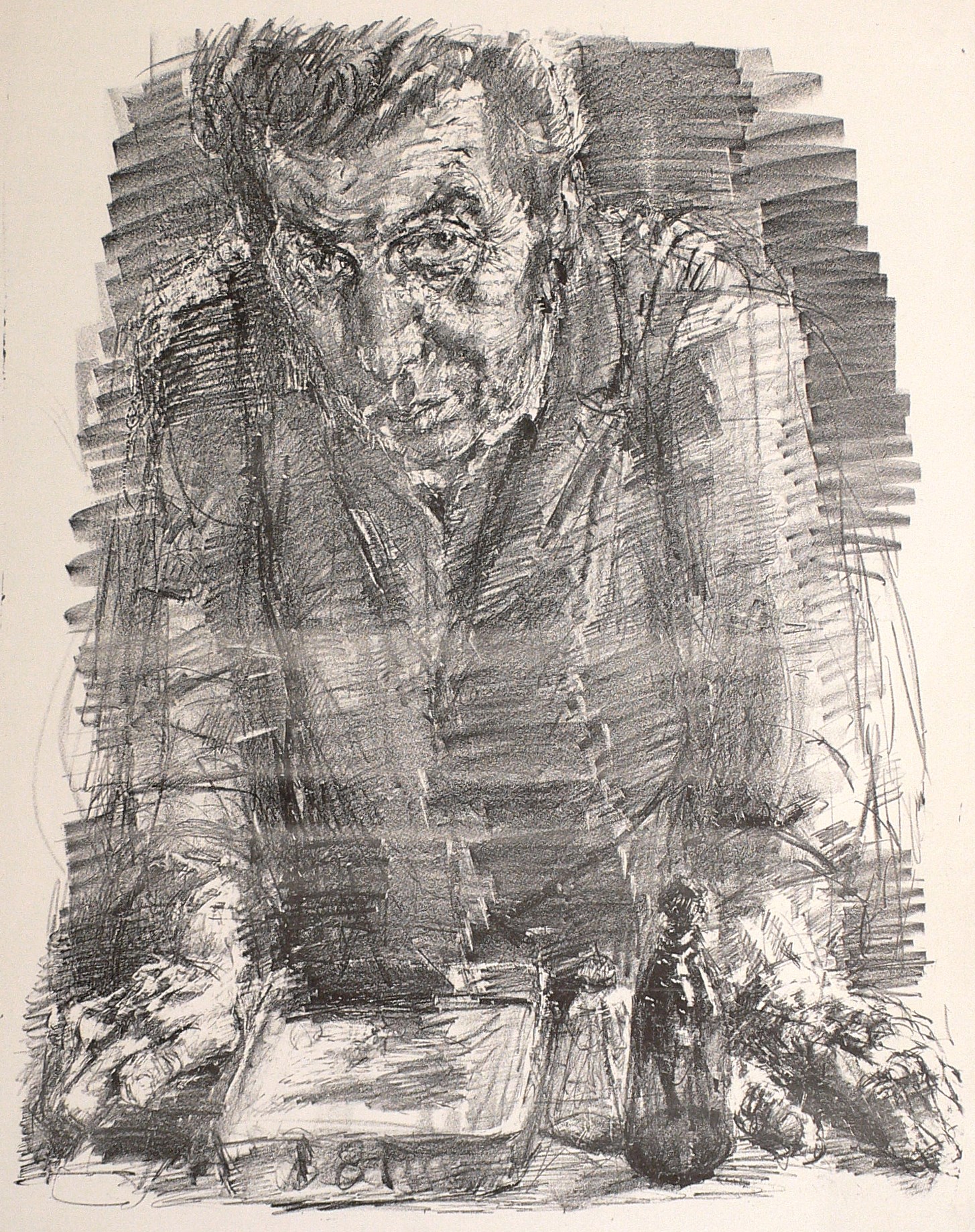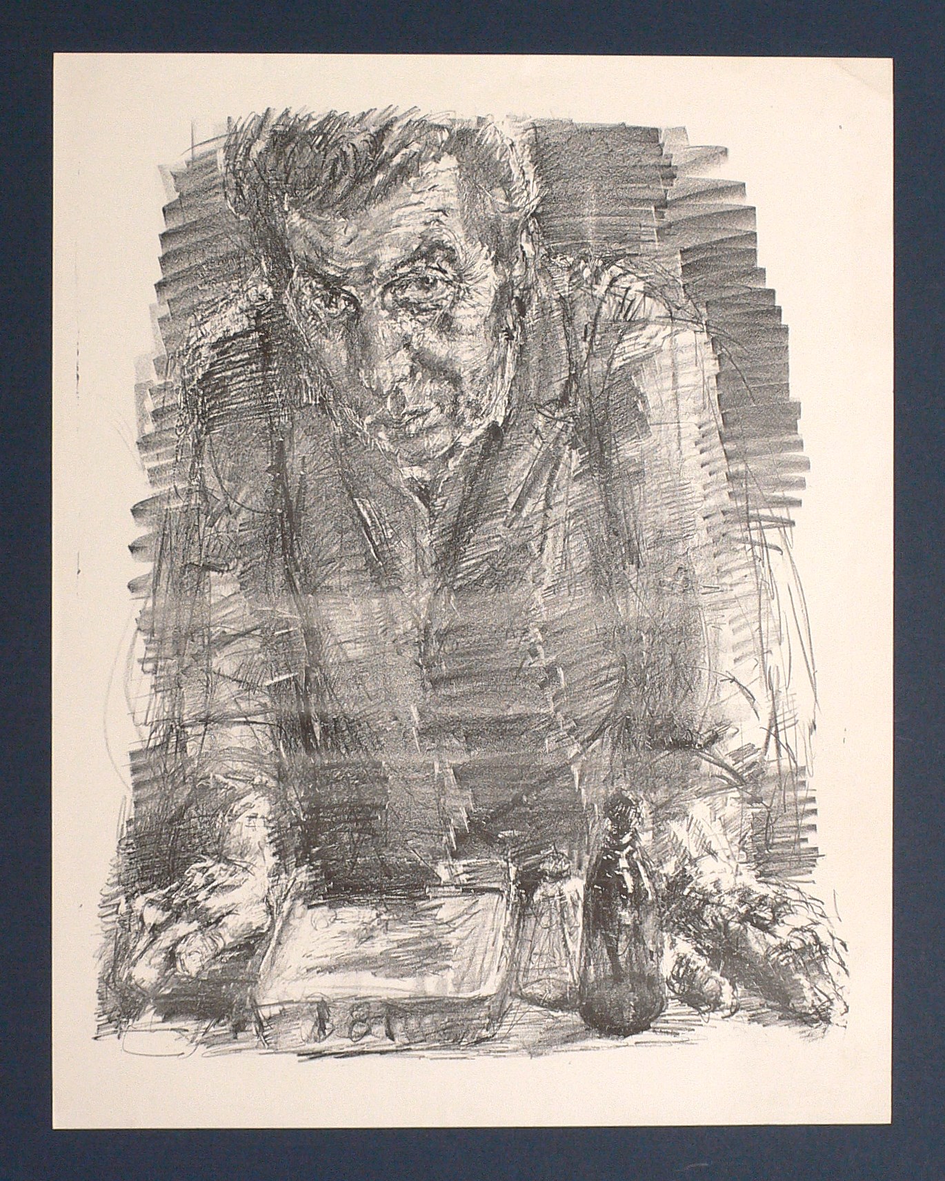 Nicht näher bezeichnet. Verso von fremder Hand in Bleistift betitelt. – Porträt des bekannten Leipziger Steindruckers Horst Arloth. Arloth wurde 1925 in Niedergrunstedt bei Weimar geboren. Im Anschluss an seine Ausbildung zum Steindrucker übernahm er 1950 die Lithografische Werkstatt der Hochschule in Weimar. Nach deren Schließung wechselte er 1954 an die Hochschule für Grafik und Buchkunst Leipzig (HGB), wo er bis 1989 äußerst erfolgreich in der Lehre tätig war. Neben den Arbeiten von Bernhard Heisig druckte er auch die lithografischen Werke von Werner Tübke, Gerhard Altenbourg, Willi Sitte, Wolfgang Peuker, Arno Rink, Rolf Münzner, Dietrich Burger und Irmgard Horlbeck-Kappler. – Blattrand atelierspurig. Oben rechts Eselsohr. Minimal gebräunt. Guter Gesamtzustand.