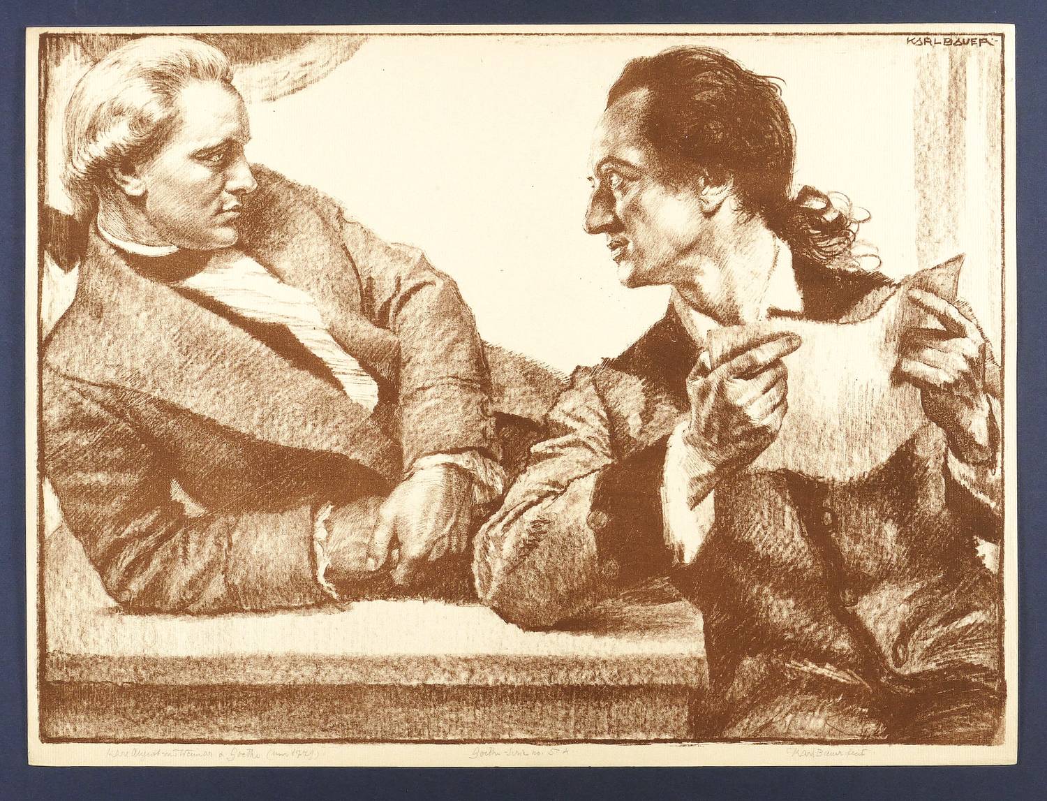 Links unten in Bleistift signiert und datiert: ″Karl Bauer fecit.″ Rechts Titel: ″Karl August von Weimar & Goethe (um 1779). / Goethe-Serie No. 5. A.″ Im Stein zusätzliche Signatur rechts oben. Verso Stempel der Kunstdruckerei Künstlerbund Karlsruhe (KKK) mit der handschriftlichen Katalog-Nr. ″107″. – Schmalrandig. Die Ecken minimal bestoßen. Insgesamt gut erhalten.