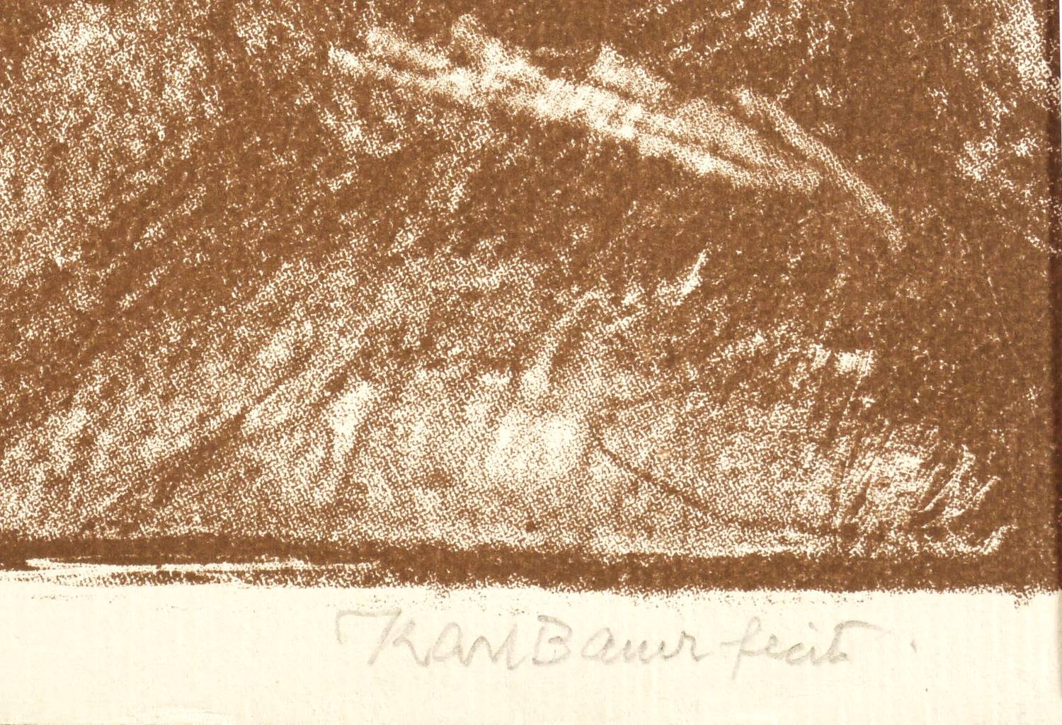 Um 1910. Lithografie / Pinsel- & Kreidelithografie, partiell geschabt, in Braun, auf Büttenkarton. – Originale Künstlergrafik, von Karl Bauer. – 46,3 x 63,0 cm (Darstellung), 48,5 x 64,5 cm (Blatt).