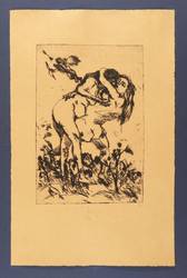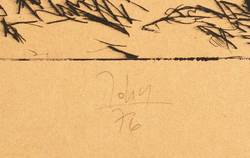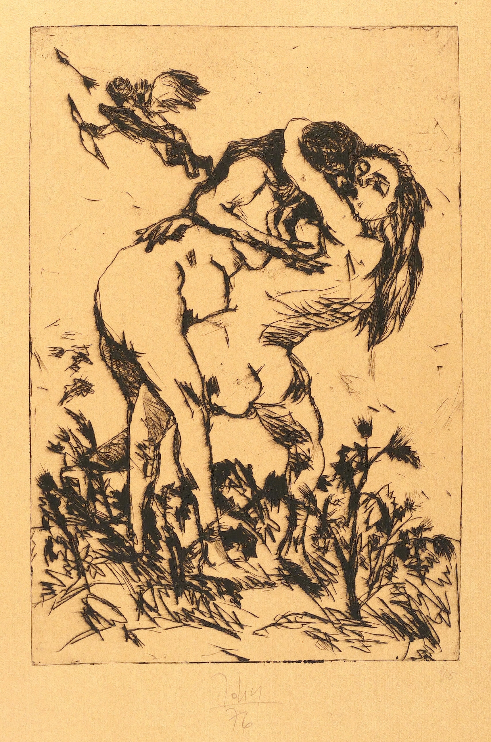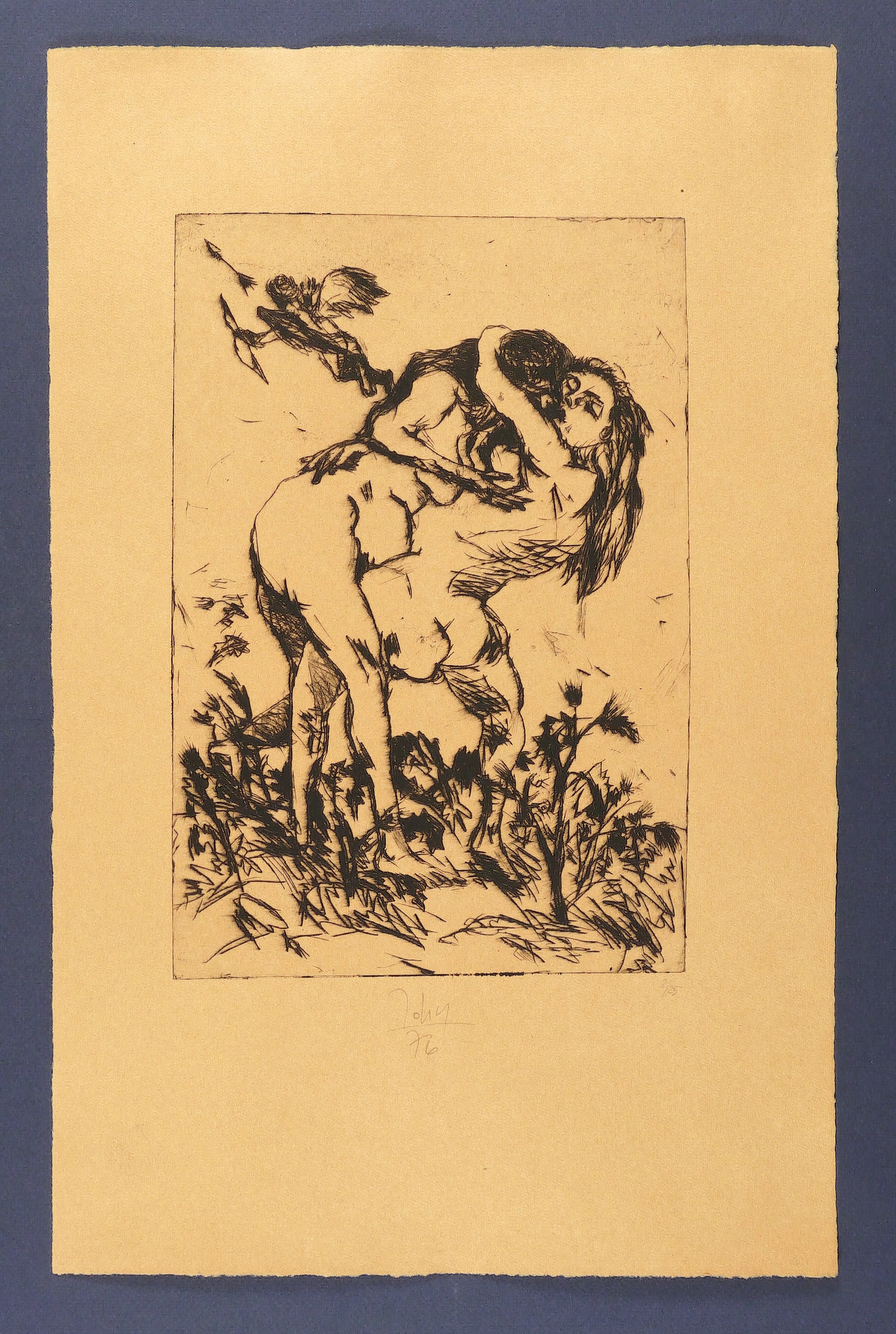 1976. Radierung / Kaltnadel, in Schwarz, auf orangem Büttenpapier. – Originale Künstlergrafik, von Joachim John. – Auflage Exemplar Nr. 8/25. – 29,8 x 20,2 cm (Darstellung / Platte), 48 x 31 cm (Blatt).