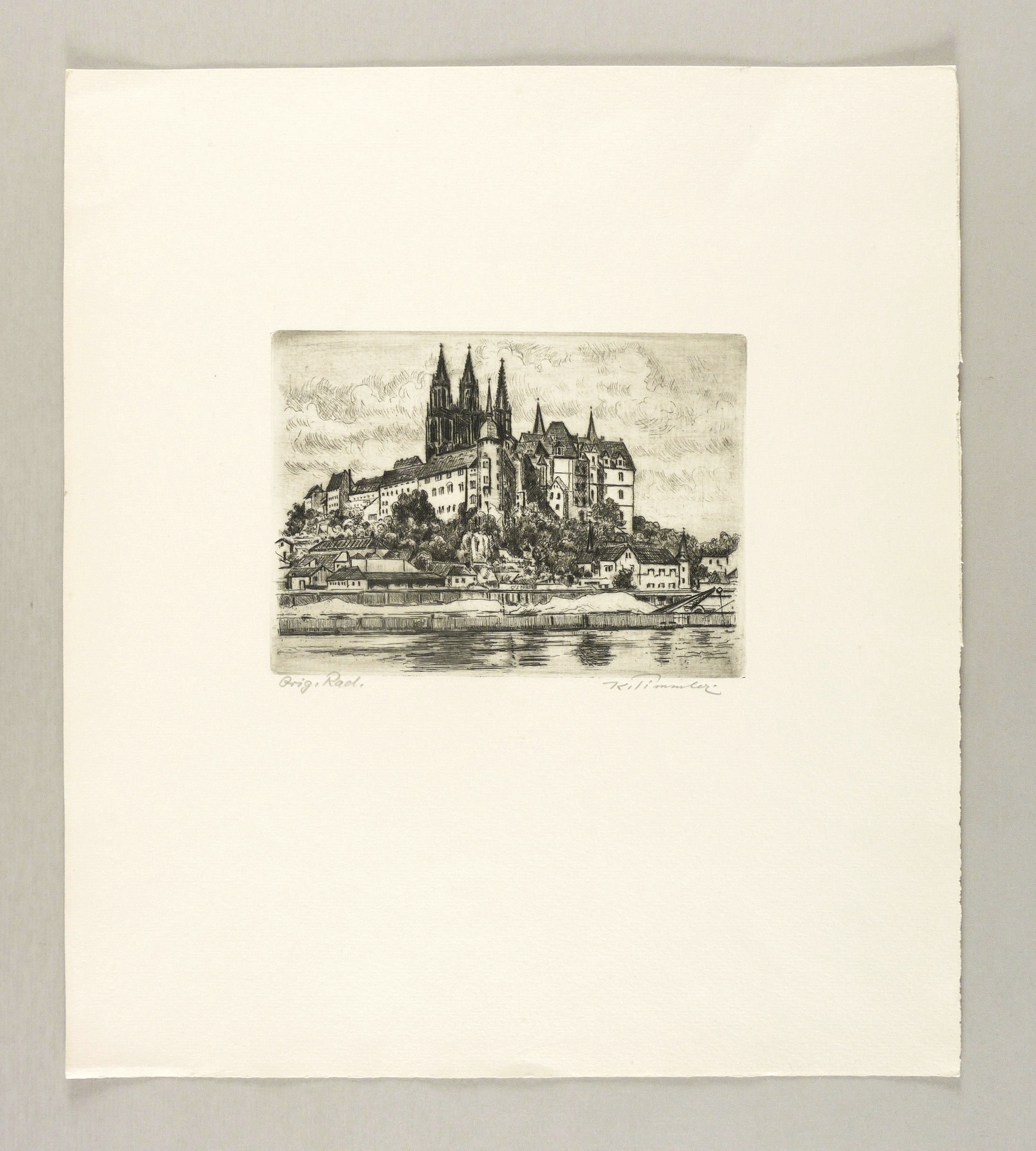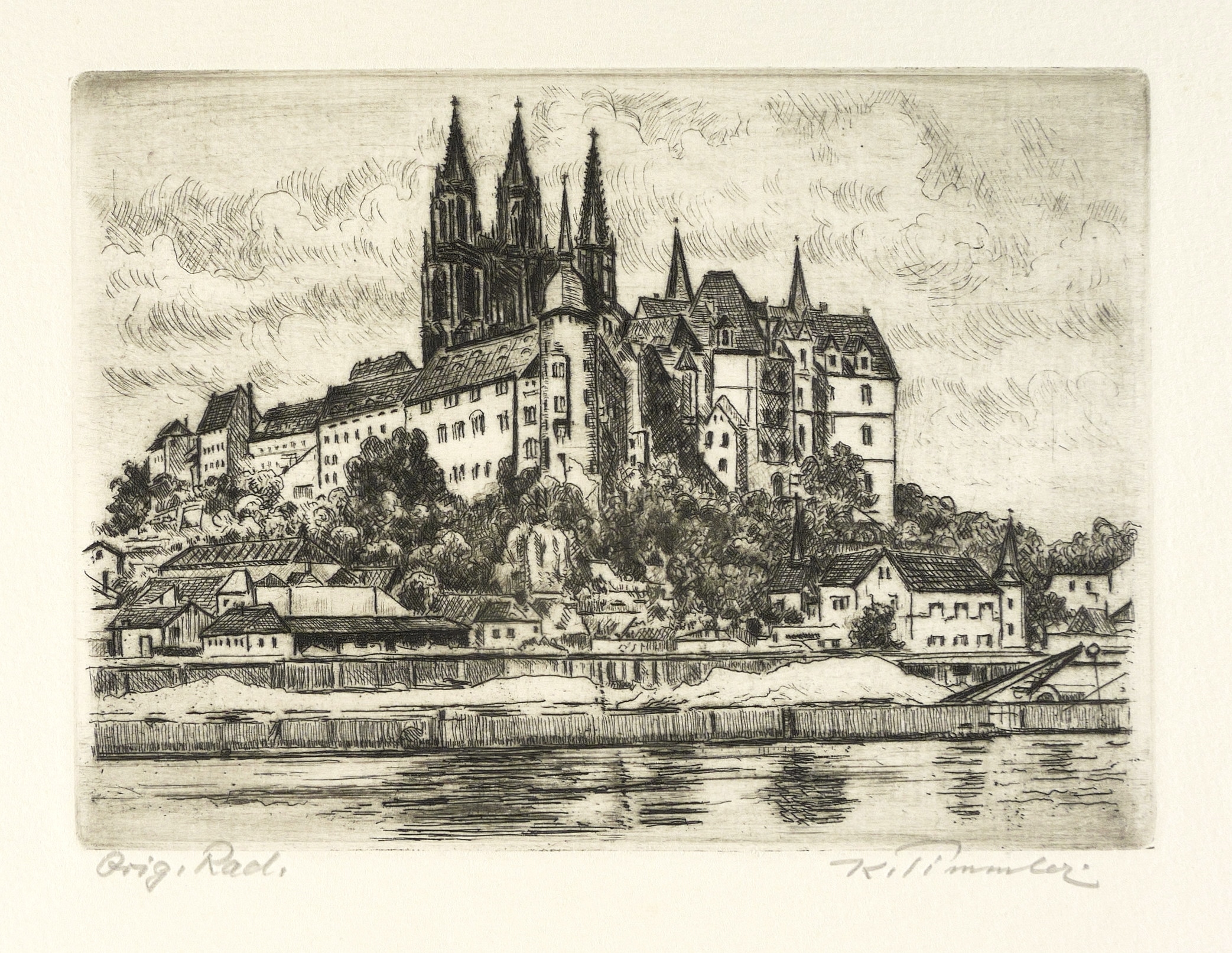 1950-1960. Radierung / Strichätzung, mit Plattenton, in Schwarz, auf hellchamois Weißenborn. – Originale Künstlergrafik, von Karl Timmler. – 12,9 x 17,7 cm (Darstellung / Druckbild), 38 x 34 cm (Blatt).