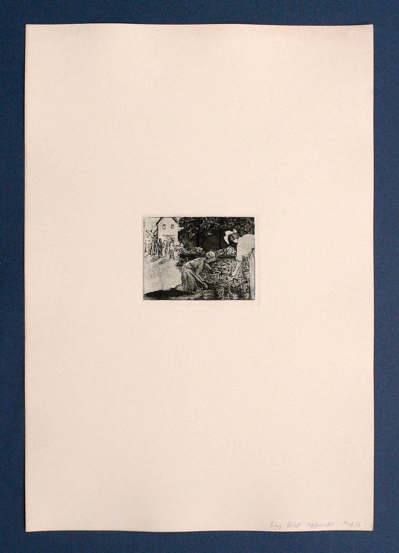 1908. Radierung / Vernis mou & Aquatinta, in Schwarz, auf gelblichem Velin. – Originale Künstlergrafik, von Margarete Geibel. – 8,5 x 11,2 cm (Darstellung), 9,0 x 11,8 cm (Platte), 51 x 35 cm (Blatt).