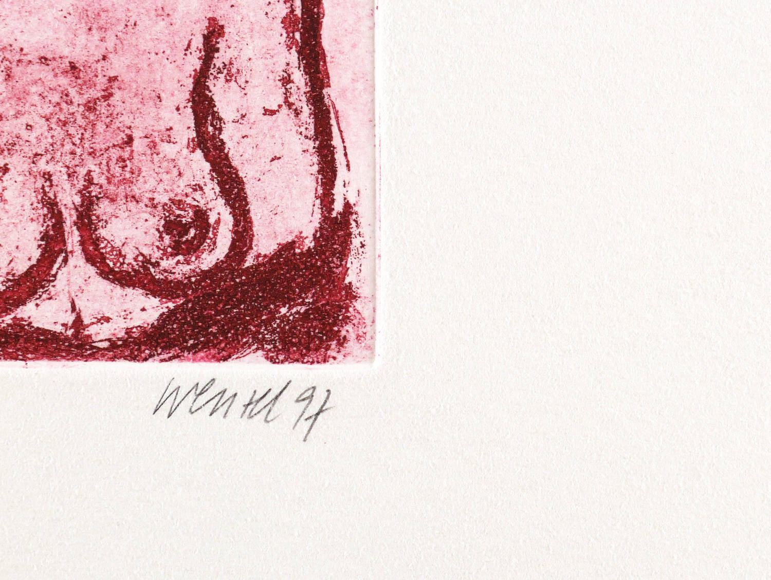 1997. Radierung / Reservage, in Rot, mit Plattenton, auf starkem hellchamois Bütten. – Originale Künstlergrafik, von Jürgen Wenzel. – Auflage Exemplar Nr. 16/25. – 11,0 x 8,3 cm (Darstellung / Platte), 19 x 27 cm (Blatt).