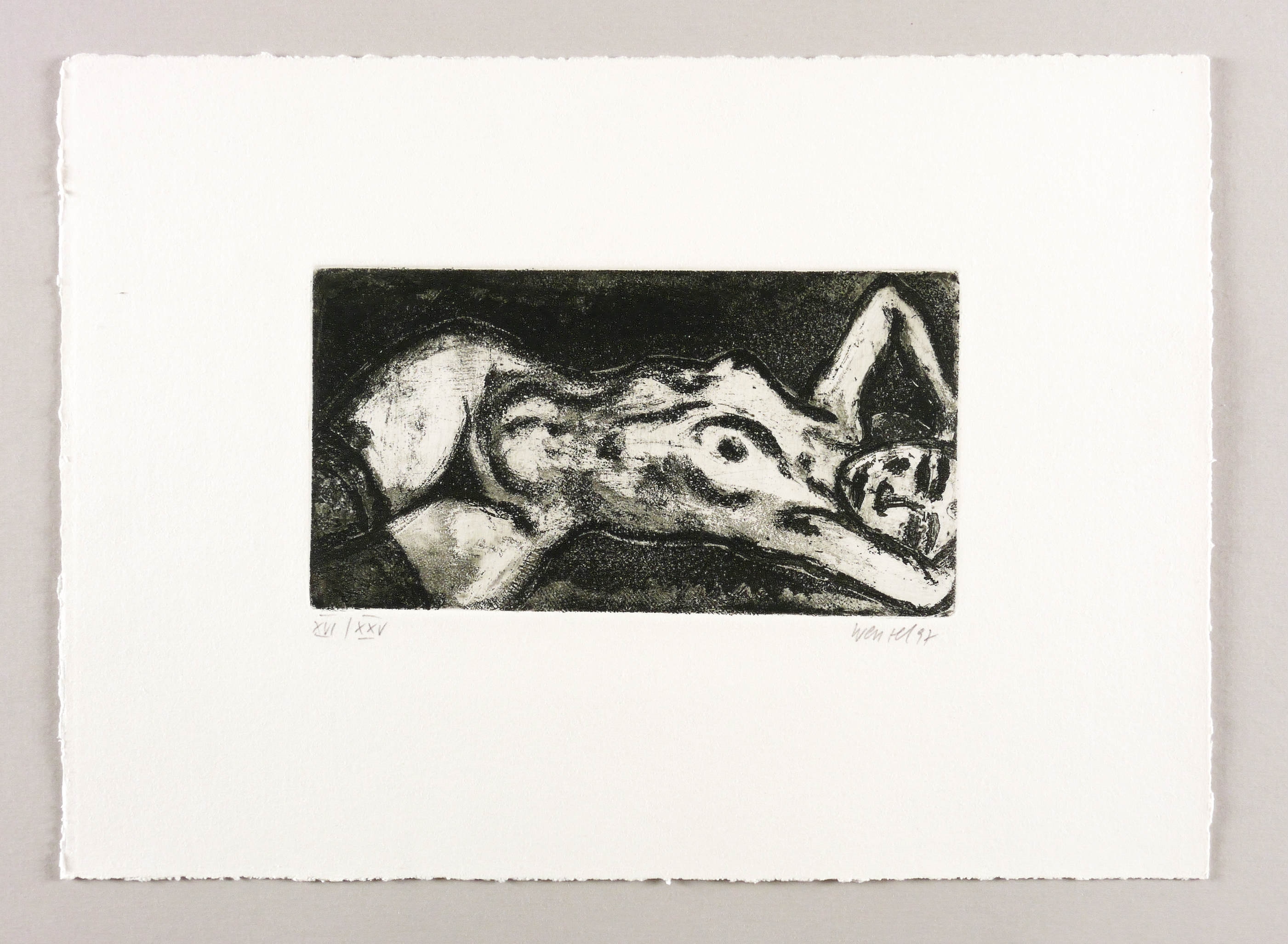 1997. Radierung / Reservage & Aquatinta, in Schwarz, auf kräftigem hellchamois Bütten. – Originale Künstlergrafik, von Jürgen Wenzel. – Auflage Exemplar Nr. 16/25. – 11,4 x 21,2 cm (Darstellung / Platte), 27 x 38 cm (Blatt).