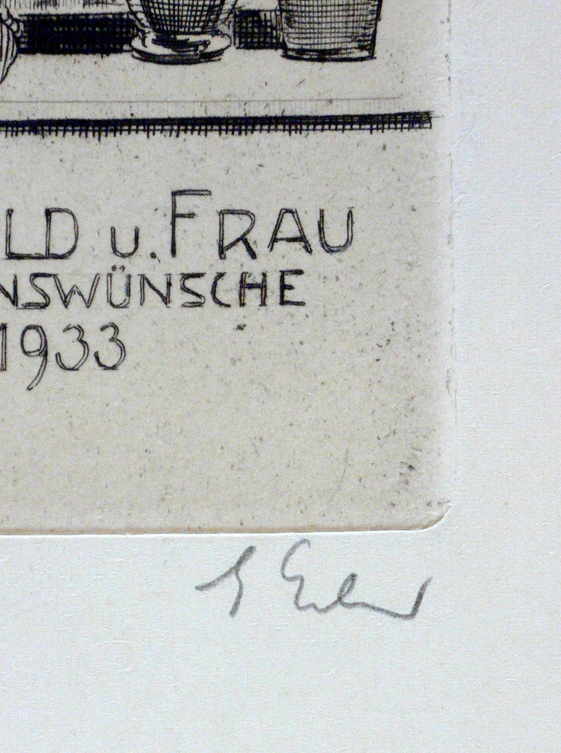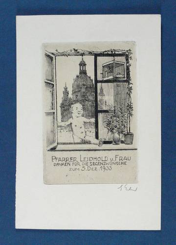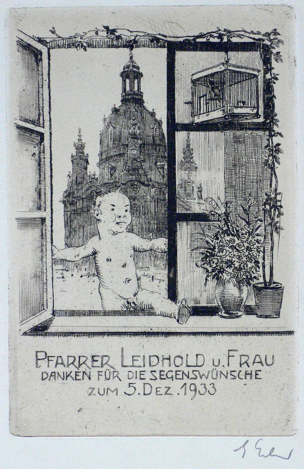 Rechts unten in Bleistift signiert. In der Darstellung unten mittig bezeichnet und datiert: ″Pfarrer Leidhold u. Frau danken für die Segenswünsche zum 5. Dez. 1933″. – Papier etwas gebräunt. Die Blattkanten marginal bestoßen. Guter Erhaltungszustand.