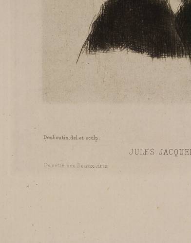 Aus: Gazette des Beaux-Arts (Paris: Gazette des Beaux-Arts 1869-1888). – Außerhalb der Darstellung typografisch signiert links unten "Desboutin, del. et sculp." sowie mittig betitelt. Weiter unten links bezeichnet "Gazette de beaux-Arts" und rechts "Imp. Vve. A. Cadart. Paris." – Papier leicht gebräunt und minimal stockfleckig. Die Ecke oben links minimal knickspurig. Verso Reste einer ehemaligen Montierung. Insgesamt gut erhalten.
