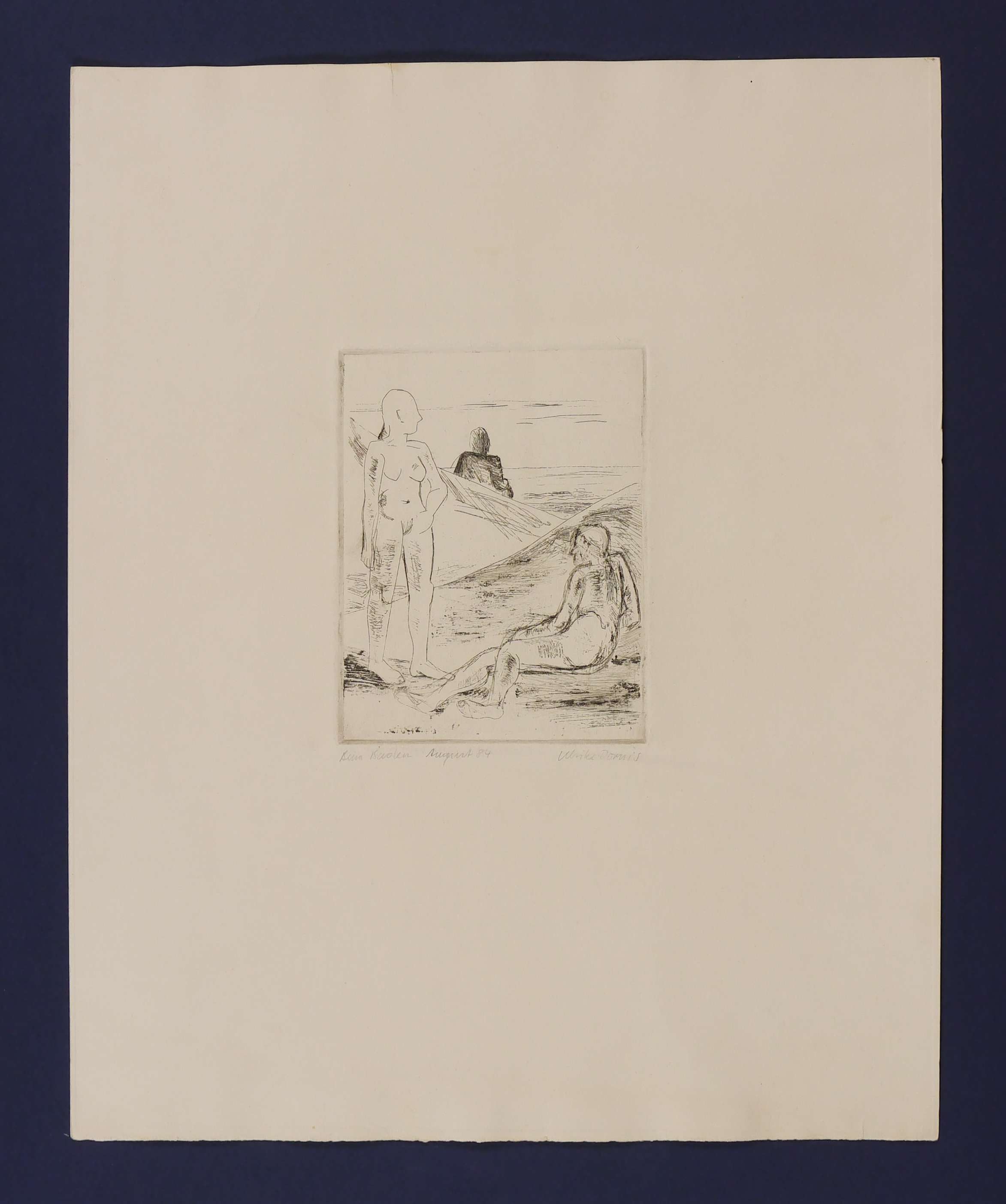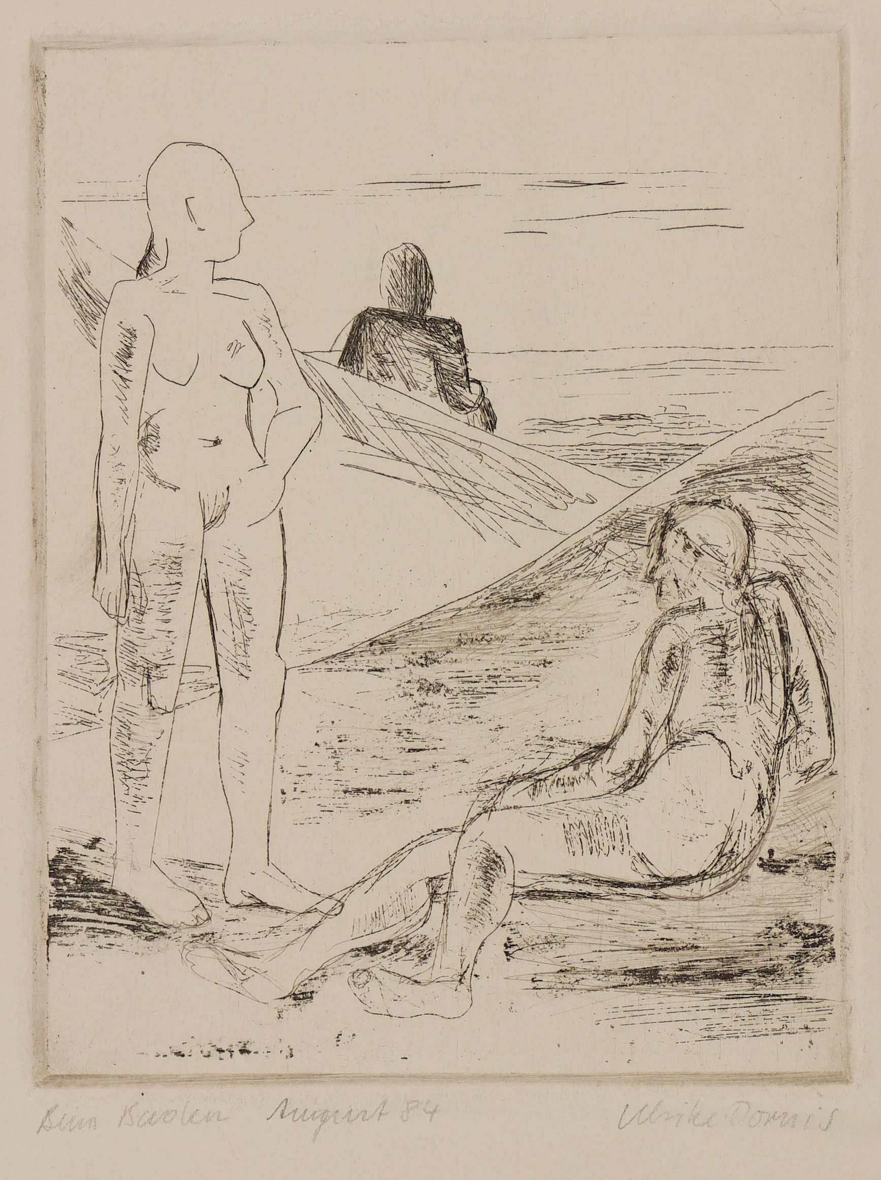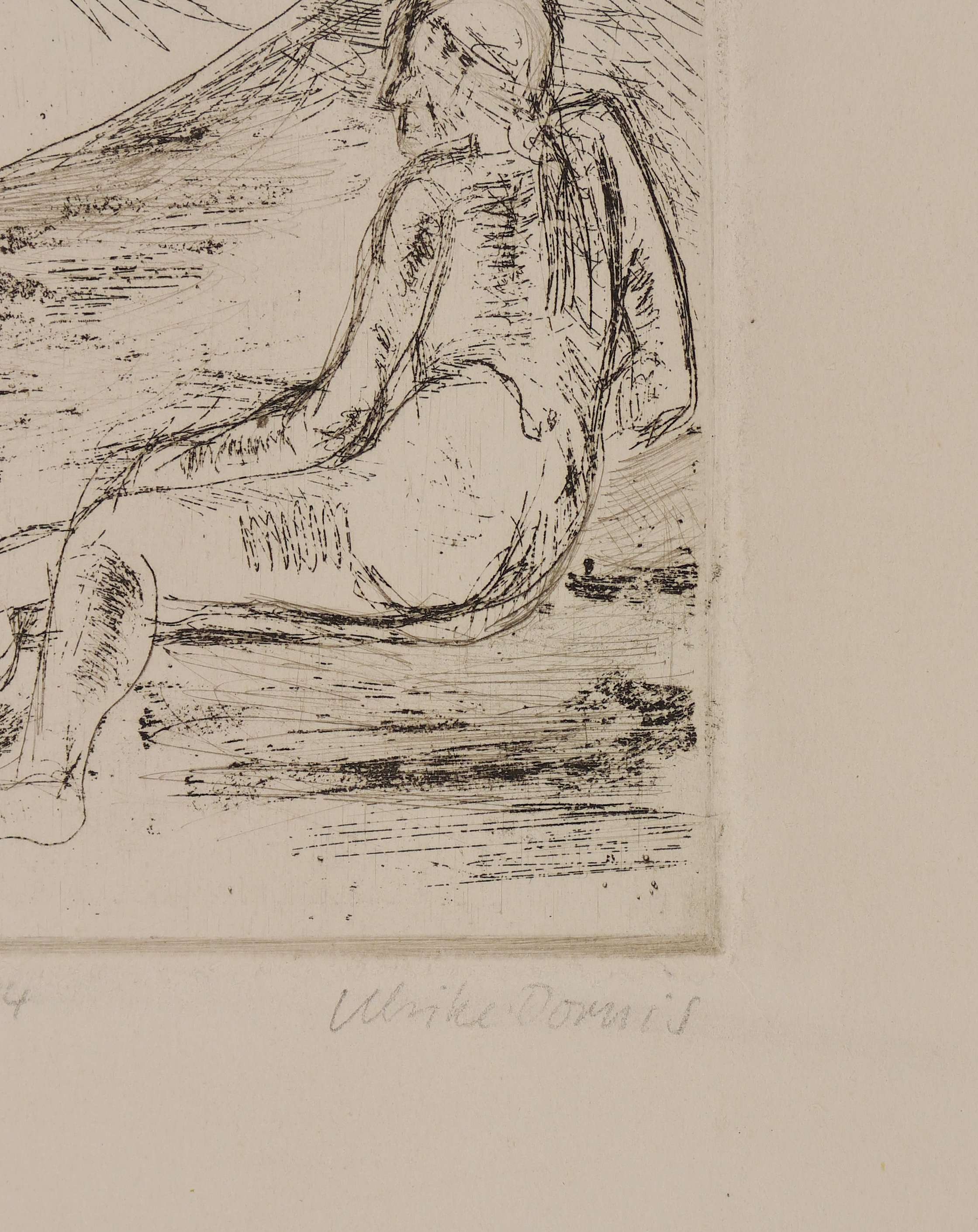 1984. Radierung / Reservage & Kaltnadel, in Schwarz, auf gelblichem Velin. – Originale Künstlergrafik, von Ulrike Dornis. – 13,5 x 10,8 cm (Darstellung / Platte), 37,5 x 30,5 cm (Blatt).