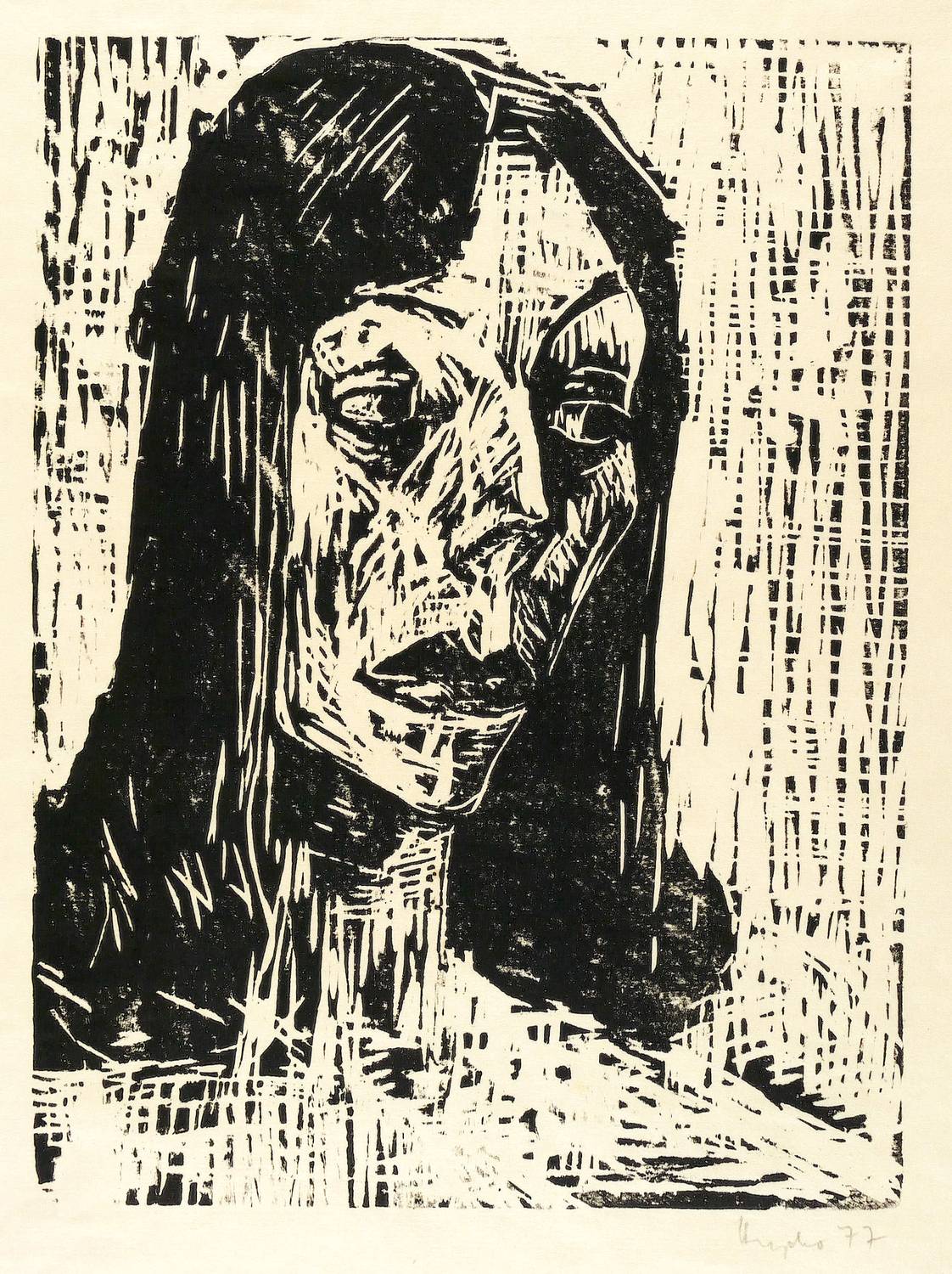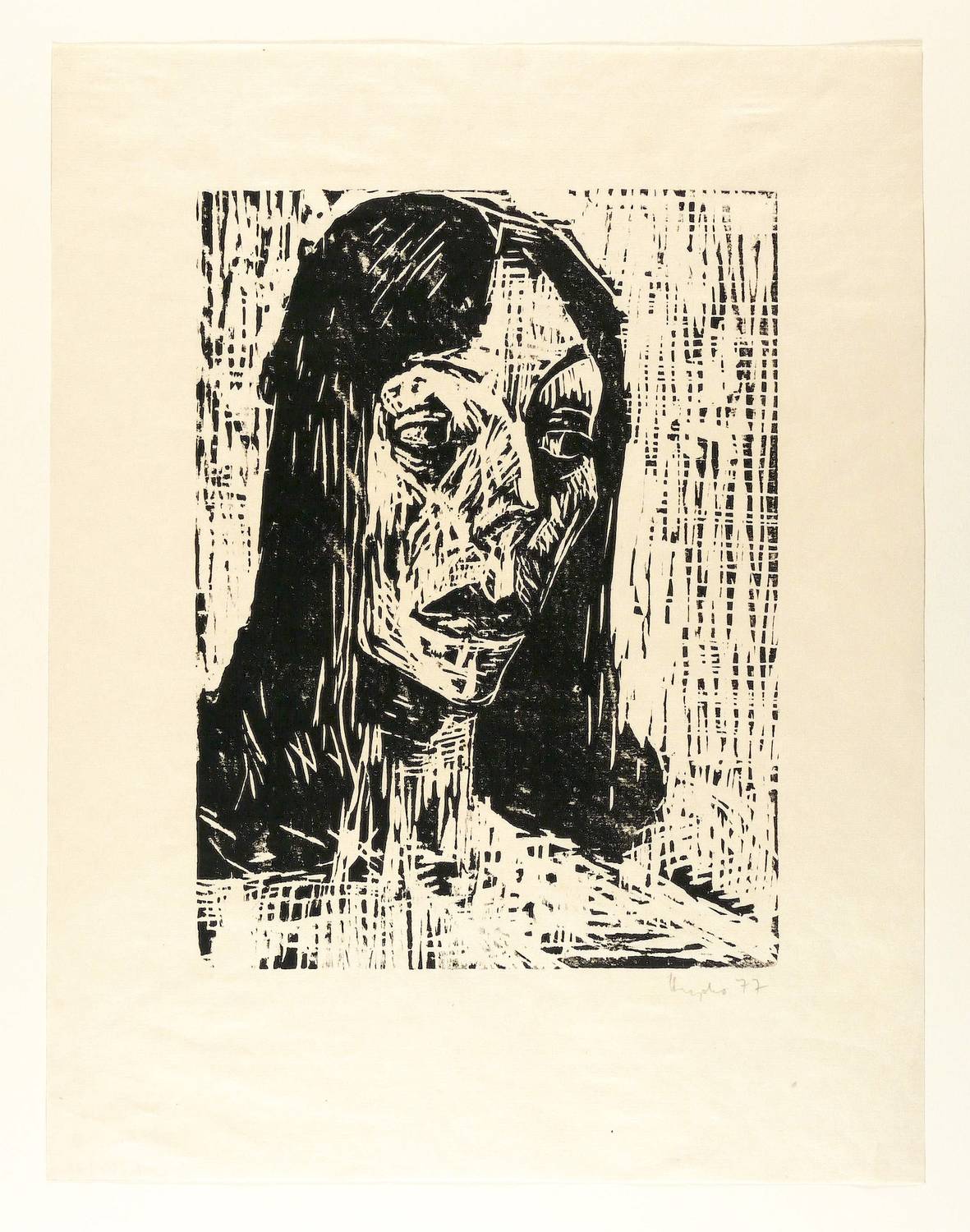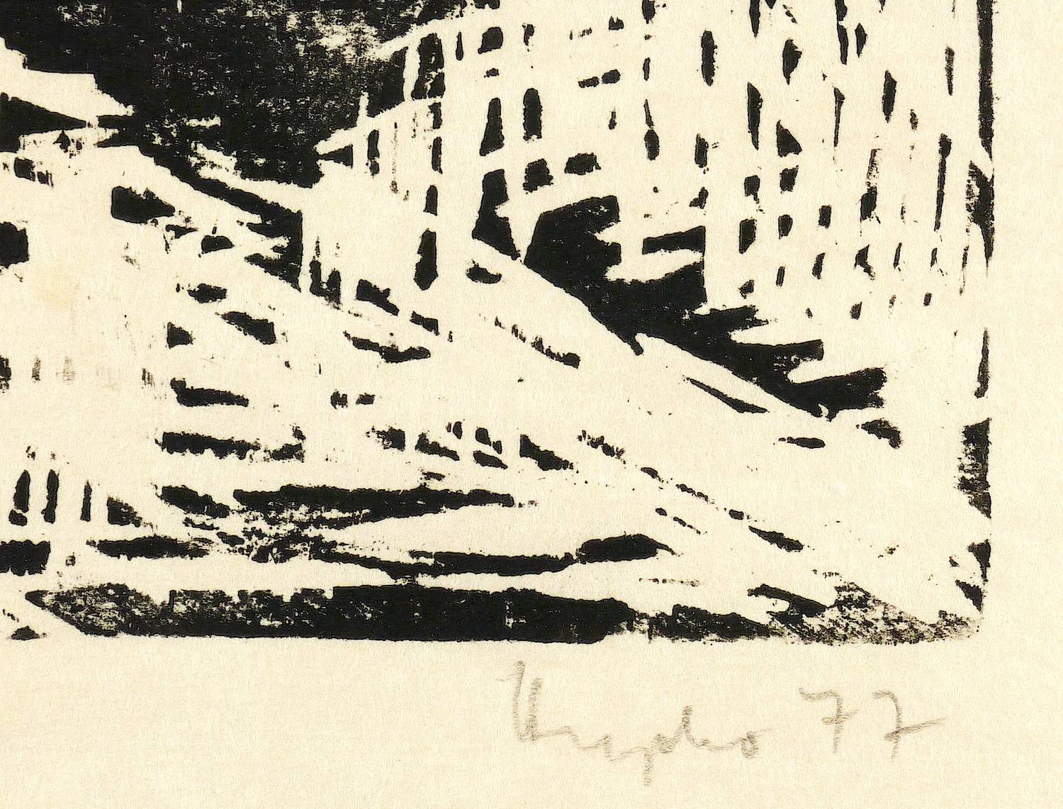 1977. Holzschnitt, in Schwarz, auf grobfasrigem Japanbütten. – Originale Künstlergrafik, von Ruth Heyder. – 35,8 x 26,7 cm (Darstellung / Druckstock), 53 x 41 cm (Blatt).
