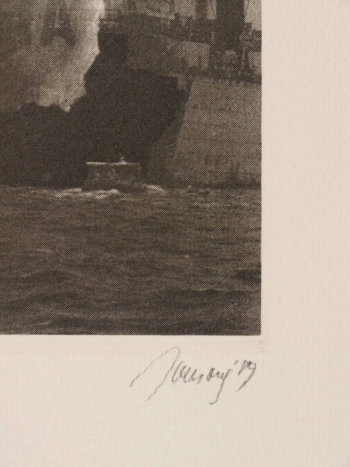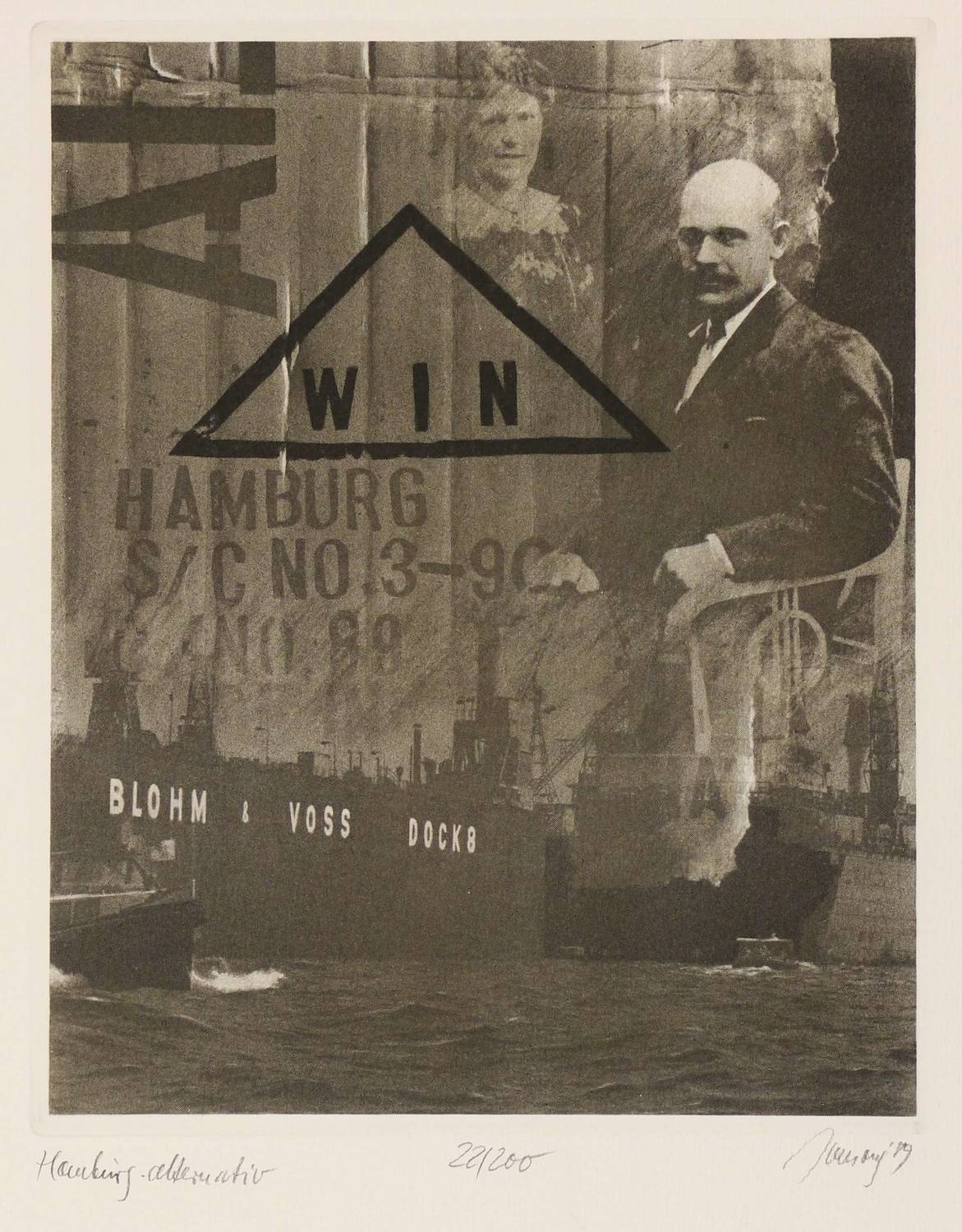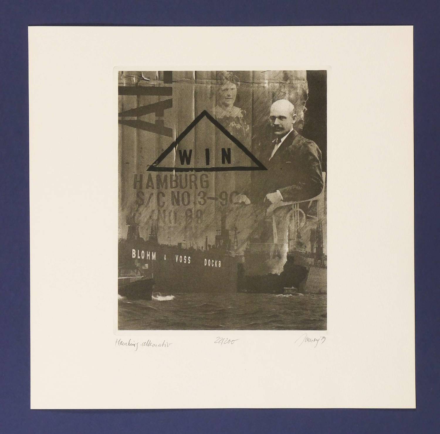 Rechts unter der Platte in Bleistift signiert und datiert, links betitelt und mittig mit eigenhändiger Auflagenbezeichnung versehen. – Montage fotografischer Aufnahmen eines Paares, des Hamburger Hafens mit Schiffen und typografischen Kompositionen. – Papier leicht gebräunt. Sonst sehr schön erhalten.