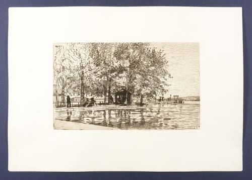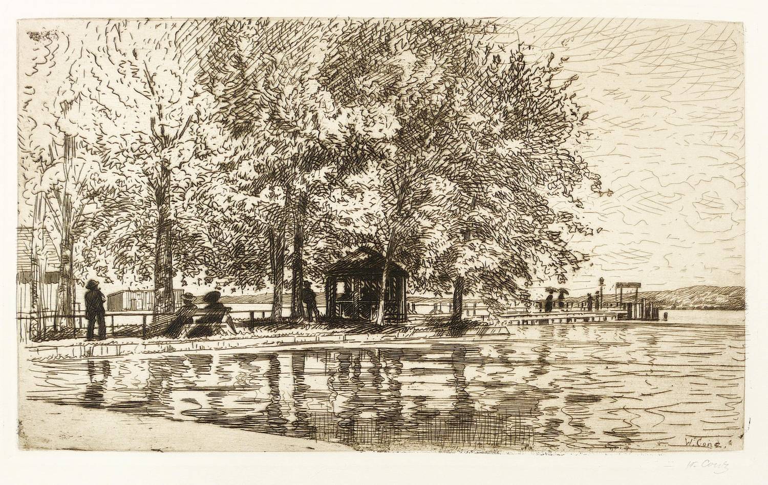 Um 1915. Radierung / Strichätzung, mit Plattenton, in Schwarzbraun, auf Kupferdruckkarton. – Originale Künstlergrafik, von Walter Conz. – 20,7 x 34,6 cm (Darstellung), 22,1 x 35,9 cm (Platte), 39 x 55 cm (Blatt).