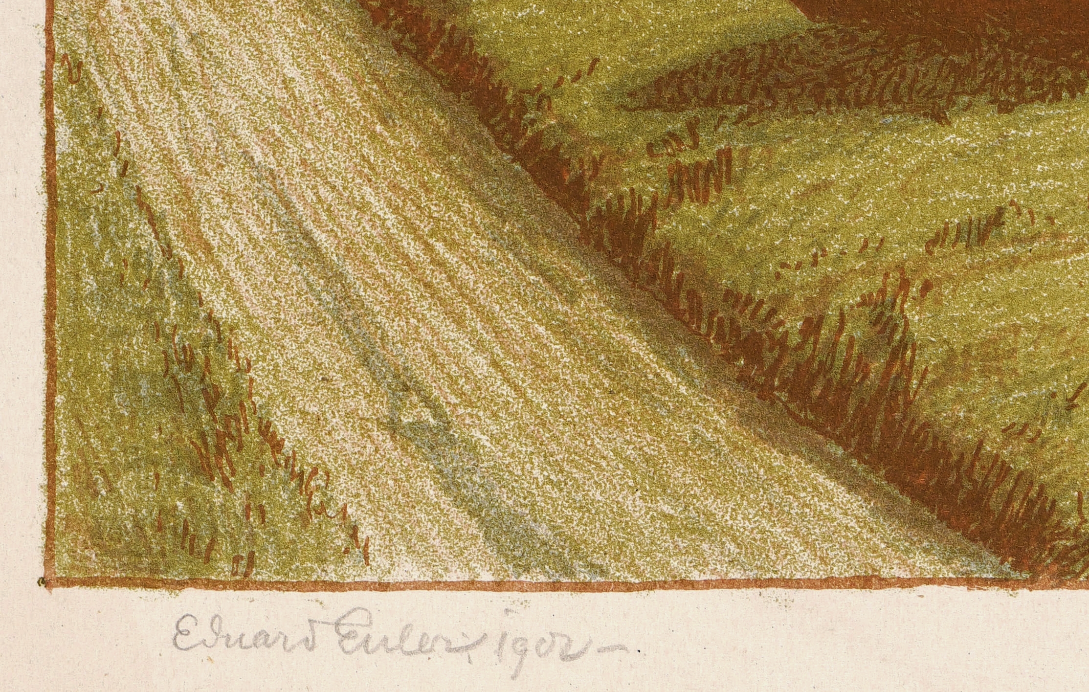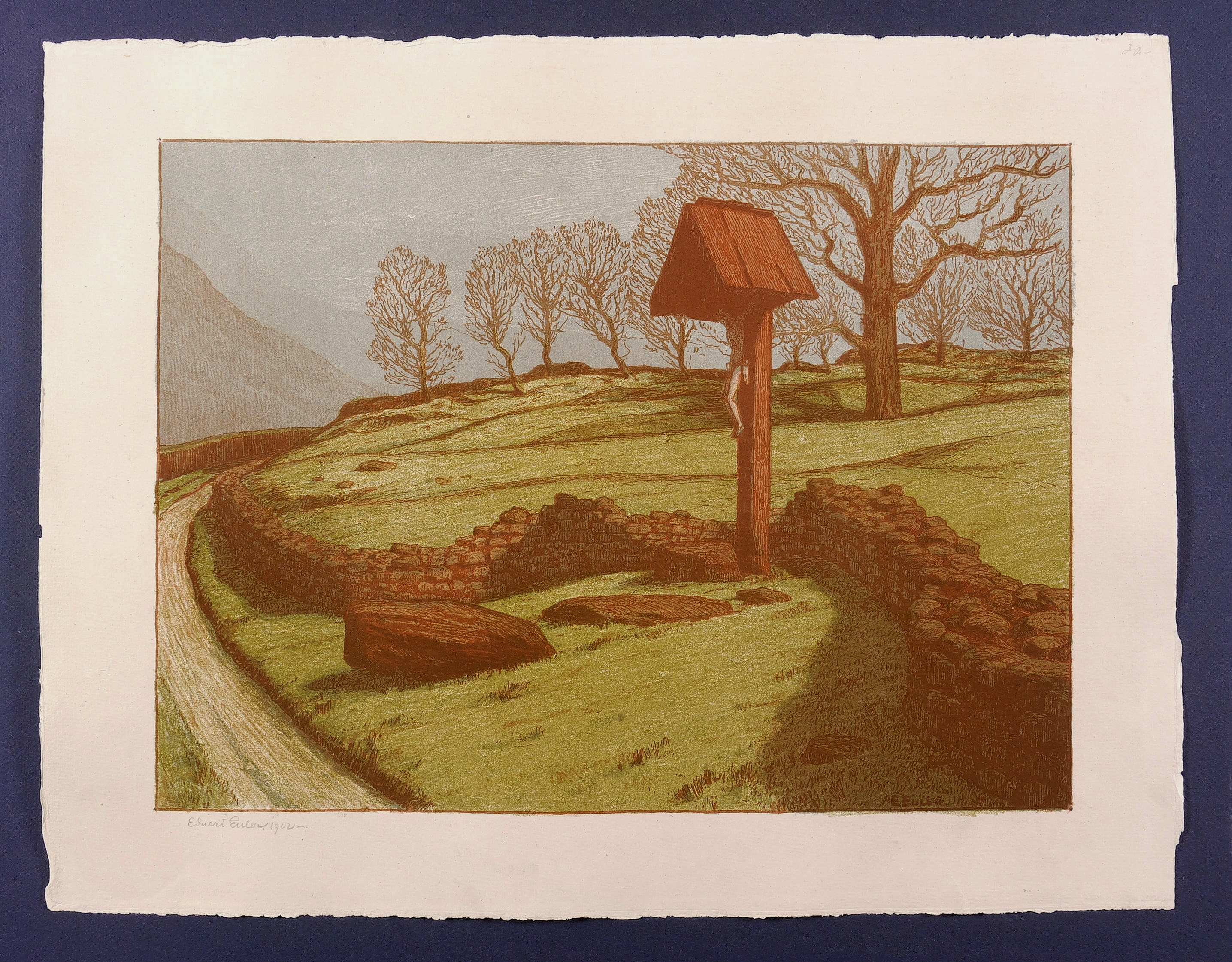 In Bleistift links unten signiert und datiert: ″Eduard Euler - 1902 -.″ Im Stein rechts unten zusätzlich signiert. Verso verblasster Stempel der Kunstdruckerei Künstlerbund Karlsruhe (KKK) mit handschriftlicher Katalognummer ″D. 13″. – Originalrandiges Blatt. Sehr gut erhalten.