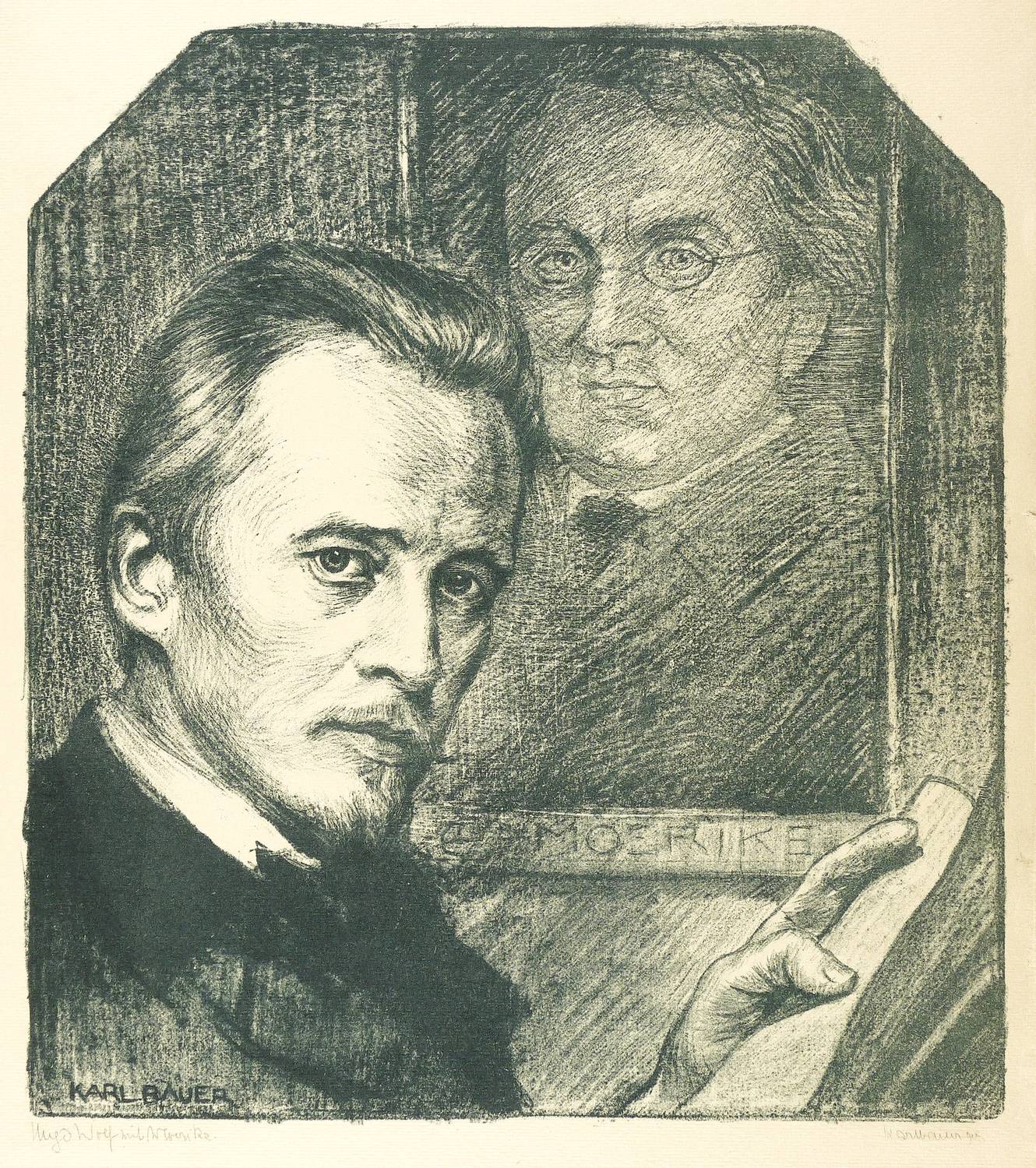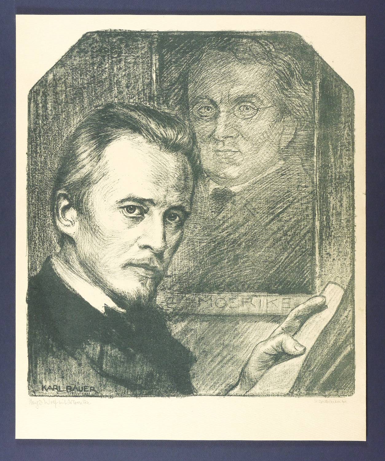 Karl Bauer (1868 Stuttgart - 1942 München). Deutscher Grafiker, Maler und Schriftsteller. Ab 1888 an der Kunstakademie Stuttgart und an der Akademie der Bildenden Künste München u.a. bei Wilhelm von Lindenschmit. Studienreisen nach Italien und Frankreich. 1891 Bekanntschaft mit Stefan George in Venedig und Fertigung des berühmten Porträts desselben. 1893 in Paris. Nach 1896 in München als Illustrator. Ab 1903 verstärkt Hinwendung zur Bildniskunst, ausgehend von seiner vertieften Beschäftigung mit Goethe und dessen Physiognomie. 1908 erscheint im Mittler-Verlag in Berlin seine illustrierte Abhandlung "Goethes Kopf und Gestalt". 1927 Teilnahme an der Münchener Kunstausstellung im Glaspalast. Neben seinen Gedichten verfasste Bauer zahlreiche Abhandlungen über Geschichte, Literatur und Religion. Als Maler spezialisierte er sich auf Lutherporträts, so für die Kirchen in Görlitz, Oppenweiler und Helsinki. Neben Porträts berühmter Zeitgenossen, wie George und Vollmoeller, fertigte Bauer zahlreiche Porträts historischer Persönlichkeiten, die immer auch den Anspruch bildlicher Charakterstudien von Person und Werk haben. 1930 zog er von München zurück nach Stuttgart, wo er oberhalb der Stadt in Sillenbuch lebte und arbeitete. 1932 beteiligte er sich einmalig an der 7. Stuttgarter Sezession mit dem Bildnis seiner Schwester. Teilnahme an der Ausstellung Juryfreie Künstlervereinigung Stuttgart.