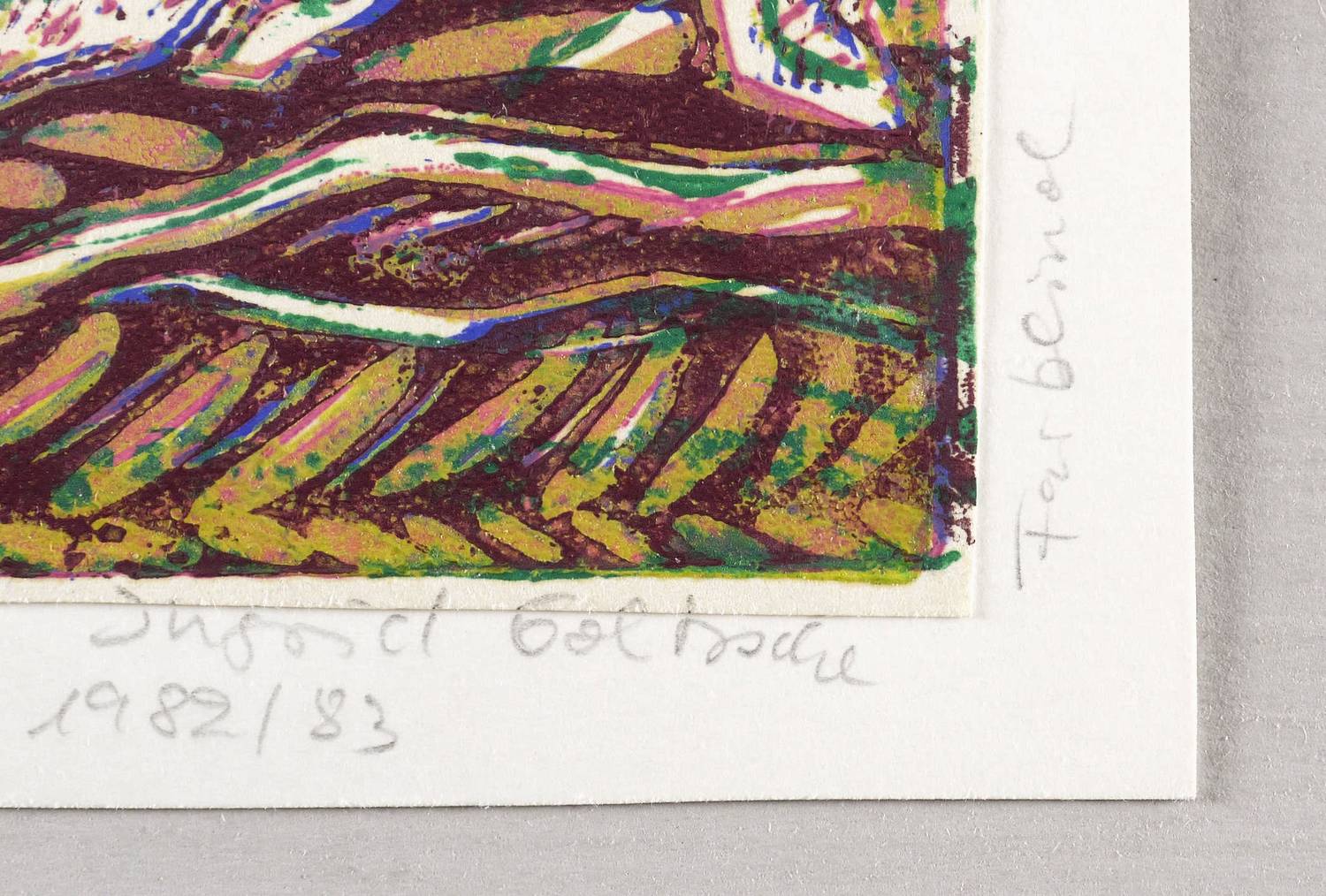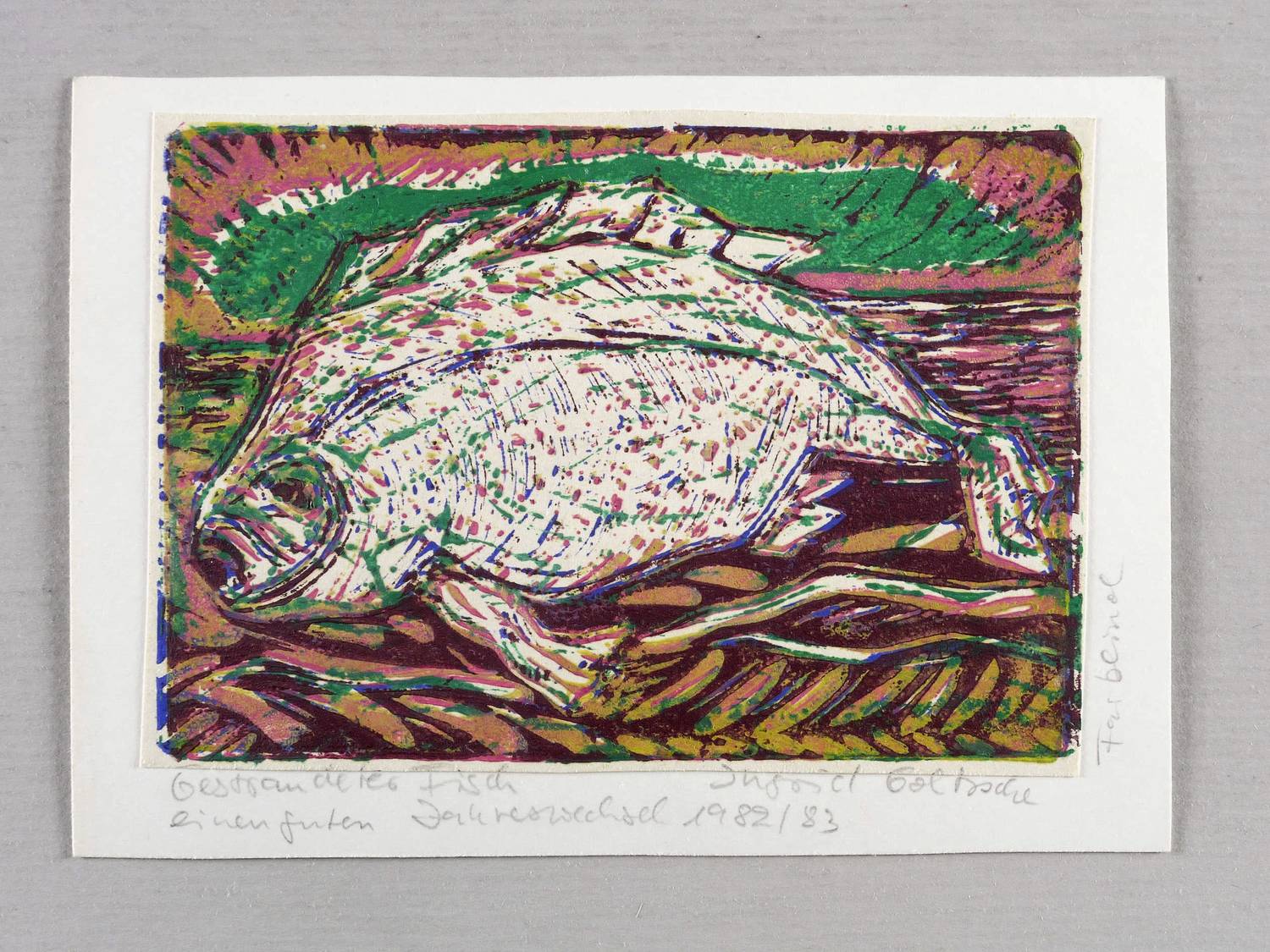 1982. Farblinolschnitt, in 4 Farben, auf hellchamois Velin. – Originale Künstlergrafik, von Ingrid Goltzsche. – 8,9 x 12,7 cm (Darstellung / Blatt), 11,7 x 14,9 cm (Trägerkarton).