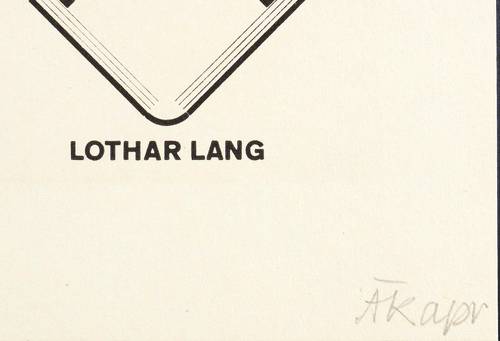 Lothar Lang (1928 Werdau - 2013 Grünheide). Deutscher Kunstwissenschaftler. Nach 1945 Lehrer in Altenburg. Studium Kunstgeschichte, Geschichte und Pädagogik in Berlin. Anschließend als Dozent an der Pädagogischen Hochschule Potsdam und im Kunstkabinett am Institut für Lehrerweiterbildung in Berlin-Weißensee (Studienrat). 1957-91 als Kunstkritiker für die Zeitschrift "Bildende Kunst" tätig. 1964-98 Herausgeber und Redakteur der "Marginalien", der Zeitschrift für Buchkunst und Bibliophilie. Wesentliche Bedeutung für die Geschichte der Druckgrafik in der DDR erlangte er als Herausgeber der originalgrafischen Mappenwerke der "Kabinett-Presse" (1965-73) sowie der "Grafik-Edition" des Reclamverlages (1975-89). 1970-90 Direktor im Museum Schloss Burgk, Aufbau der Exlibris-Sammlung. 1977 Verantwortlicher für die Beiträge der DDR-Künstler auf der documenta 6 in Kassel. 1956-81 Gründungsmitglied und Vorsitzender der Pirckheimer-Gesellschaft. Internationalen Erfolg hatte sein Buch "Malerei und Graphik in der DDR" (Leipzig 1978).