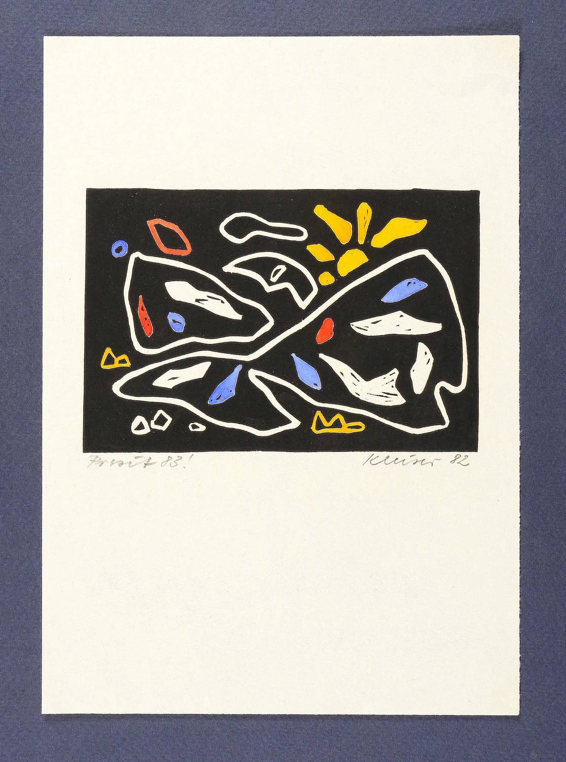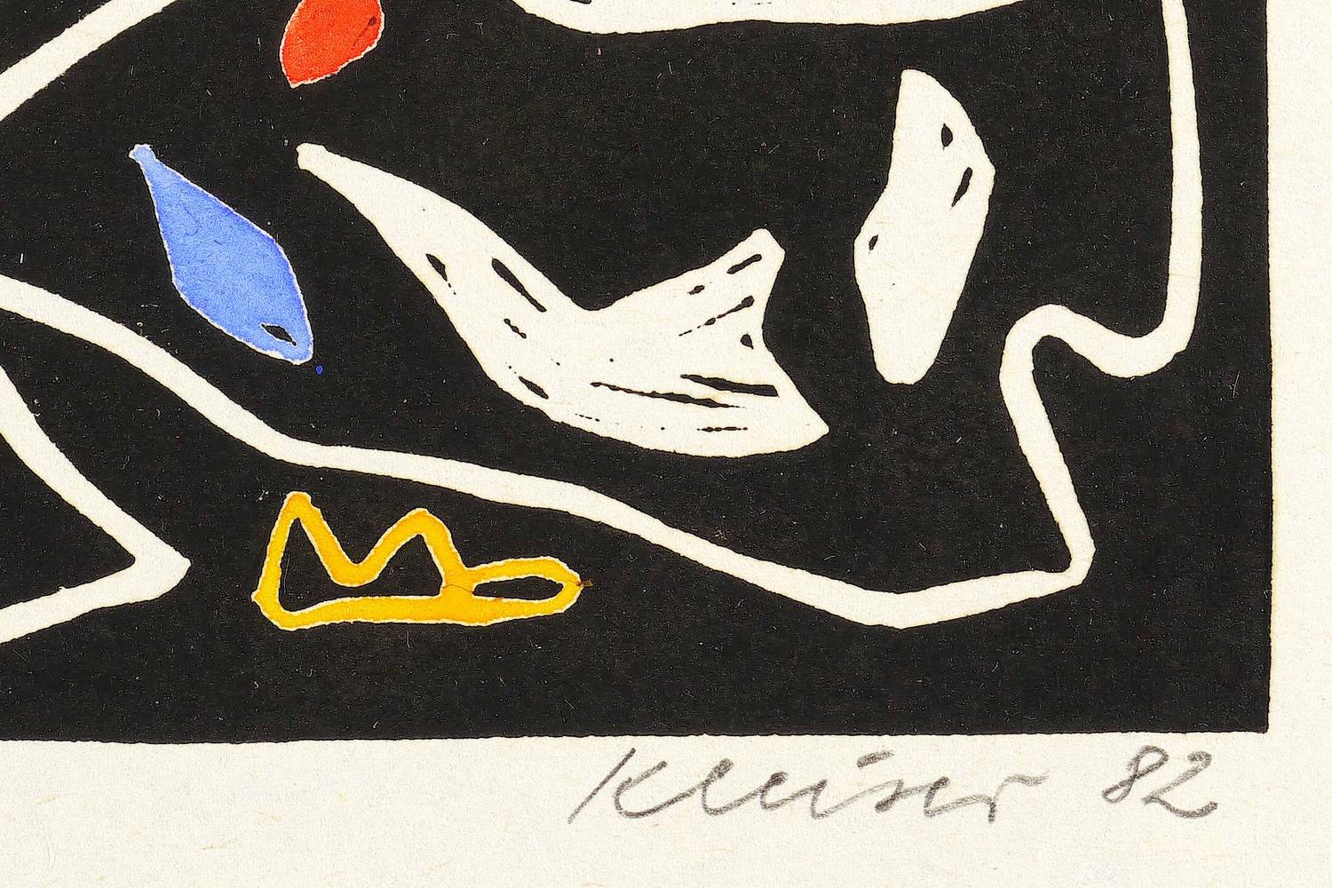 1982. Linolschnitt / Weißlinienschnitt, in Schwarz, aquarelliert, auf weißem Papier. – Originale Künstlergrafik, von Helmut Kleiser. – 8,2 x 12,3 cm (Darstellung / Druckbild), 21 x 15 cm (Blatt).