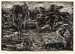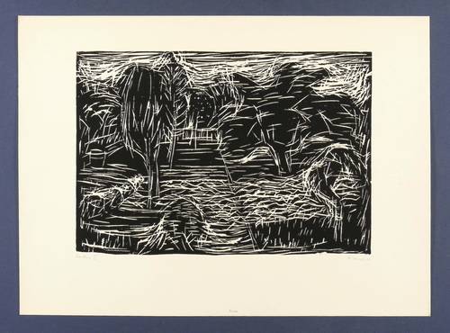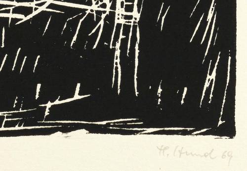 1969. Holzschnitt, in Schwarz, auf hartem Büttenkarton. – Originale Künstlergrafik, von Hans-Peter Hund. – Auflage Exemplar Nr. 32/50. – 23,6 x 34,2 cm (Darstellung / Druckstock), 35 x 48 cm (Blatt).