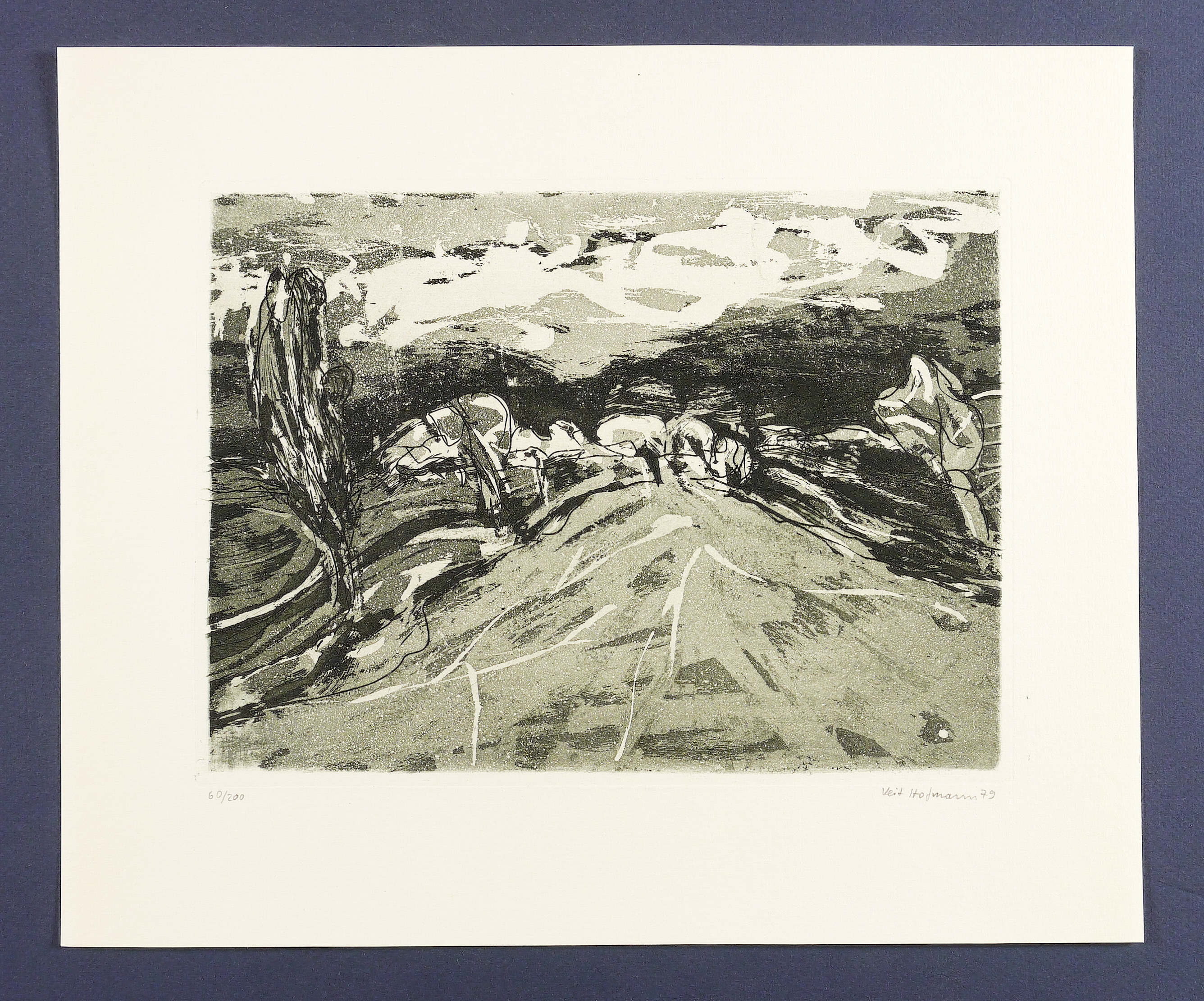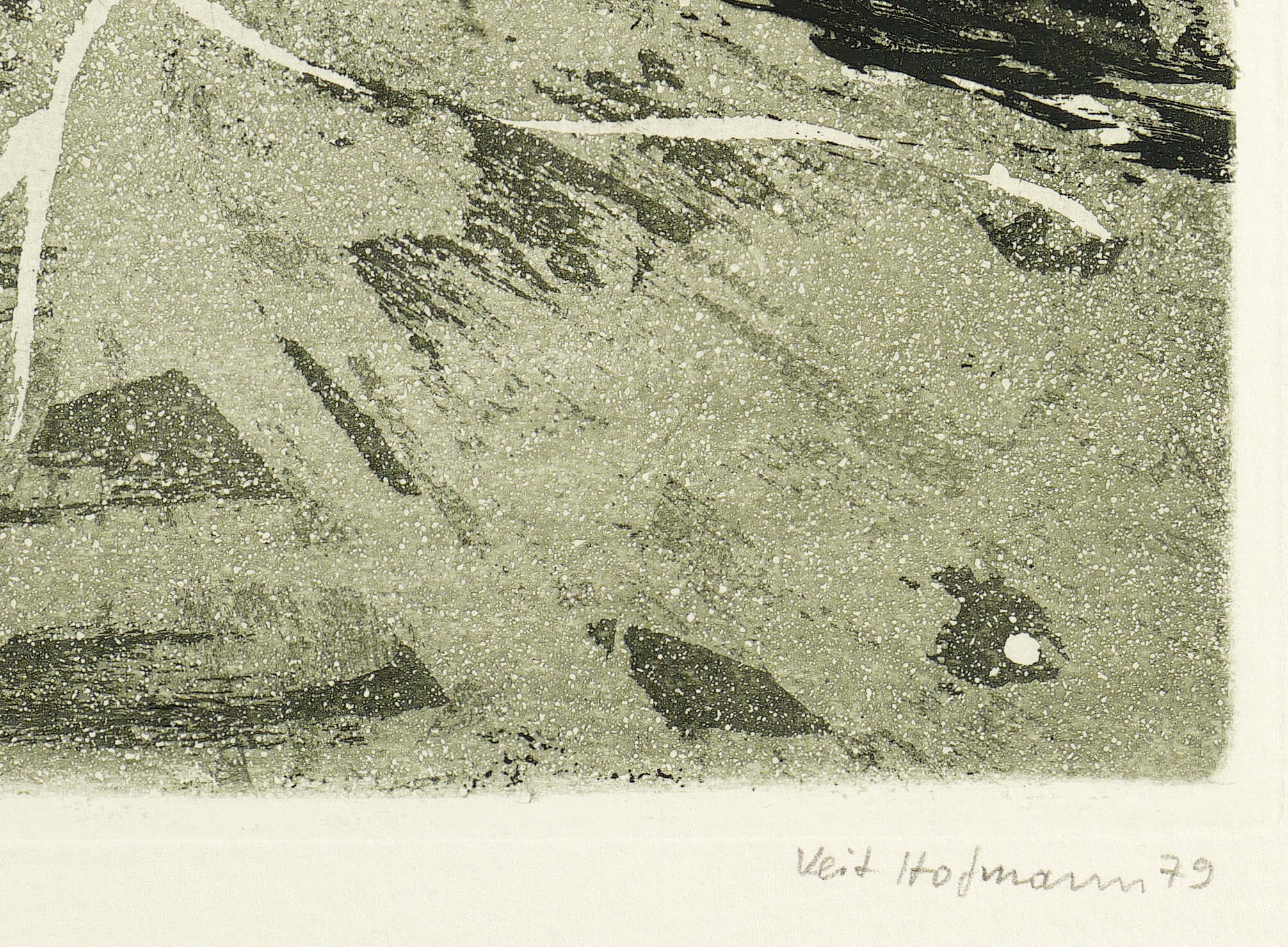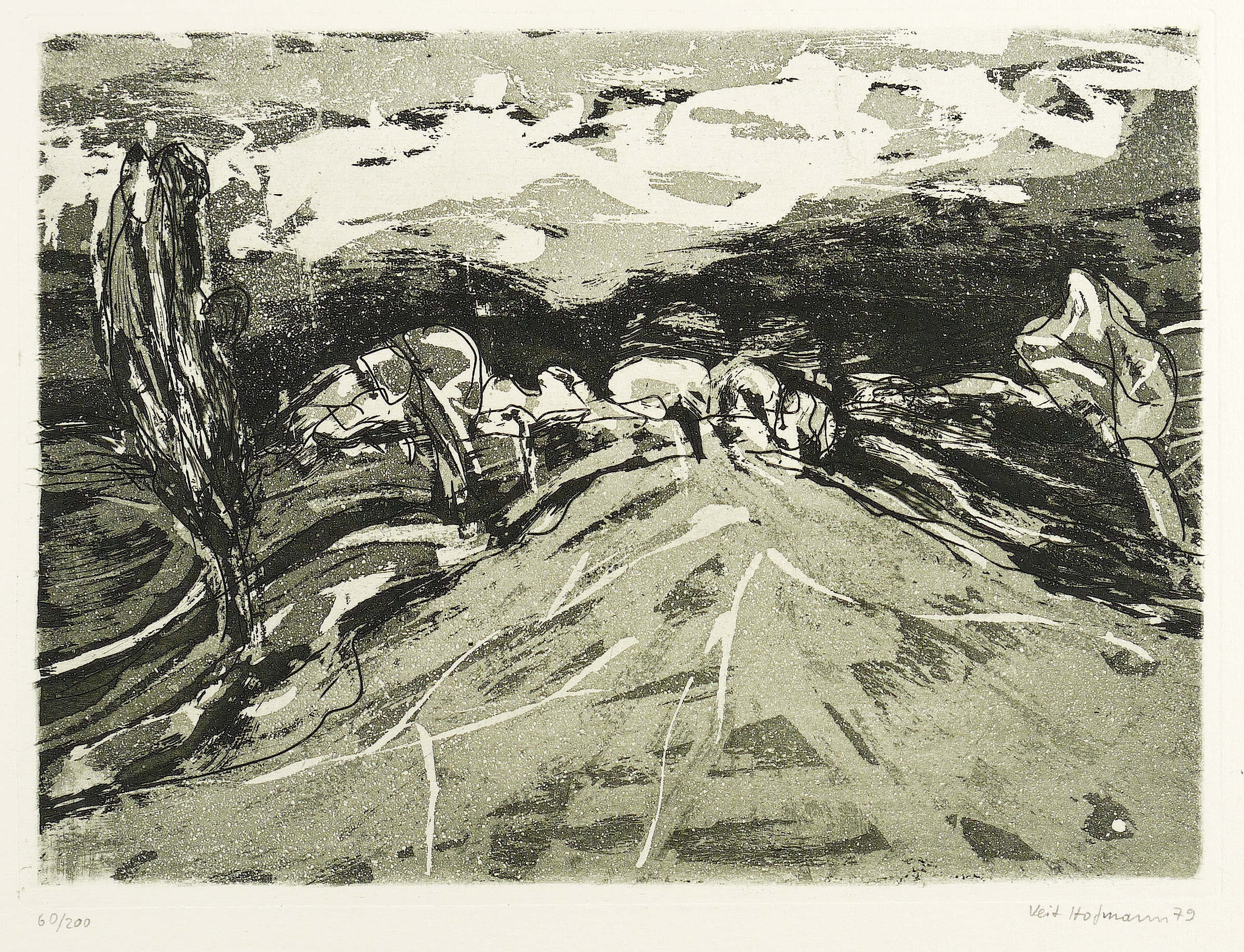 1979. Radierung / Aquatinta & Reservage, in Schwarzgrün, auf Weißenborn-Bütten. – Originale Künstlergrafik, von Veit Hofmann. – Auflage Exemplar Nr. 60/200. – 19,2 x 25,7 cm (Darstellung), 19,9 x 26,5 cm (Platte), 30 x 35 cm (Blatt).