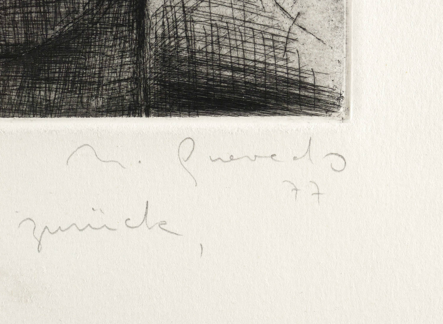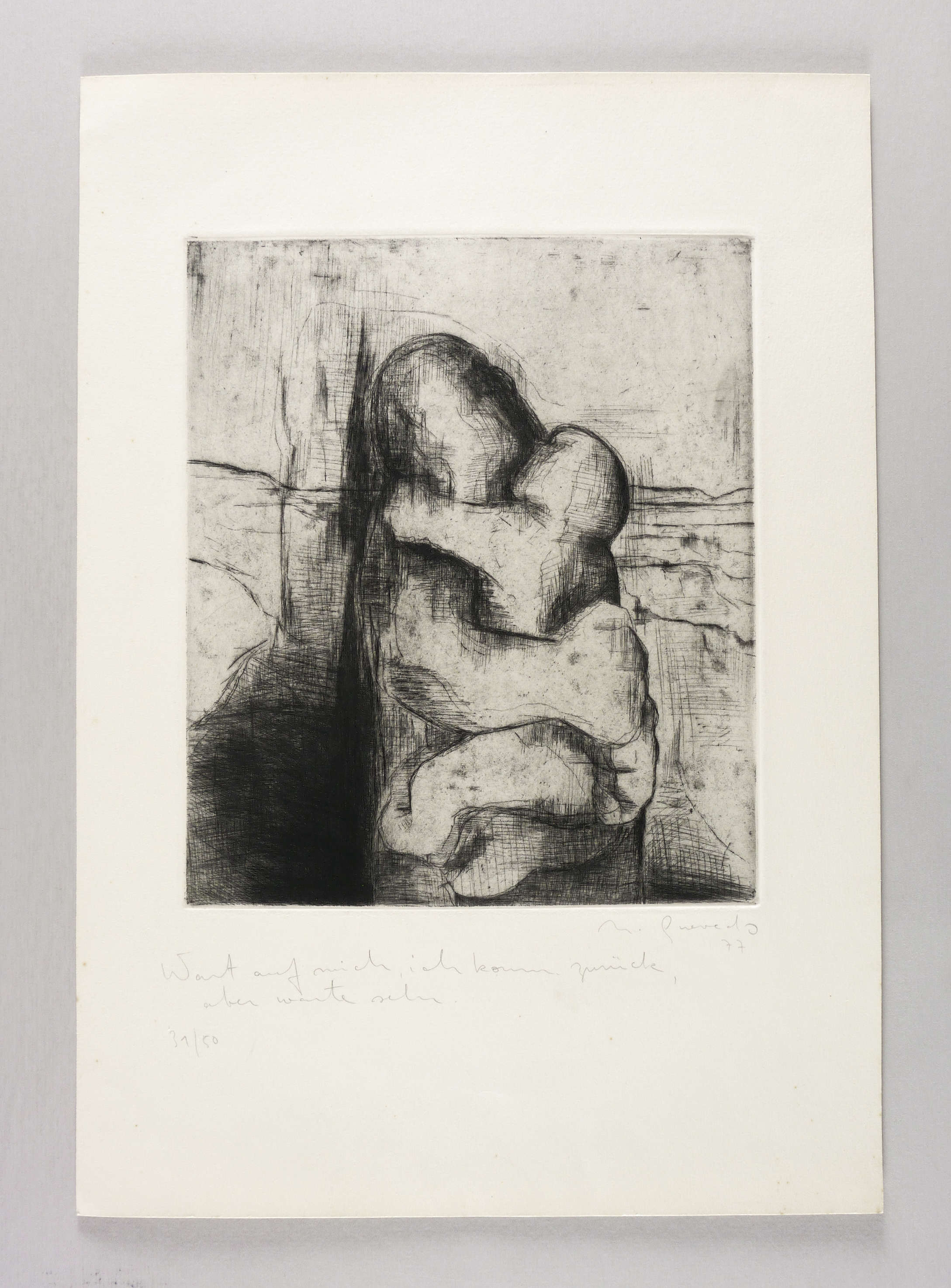 Wetterney 244. – Rechts unten in Bleistift signiert und datiert: ″N. Quevedo 77″. Links Titel und Auflagenbezeichnung: ″Wart auf mich, ich komm zurück, aber warte sehr. // 31/50″. – Leichte Altersspuren. Guter Zustand.