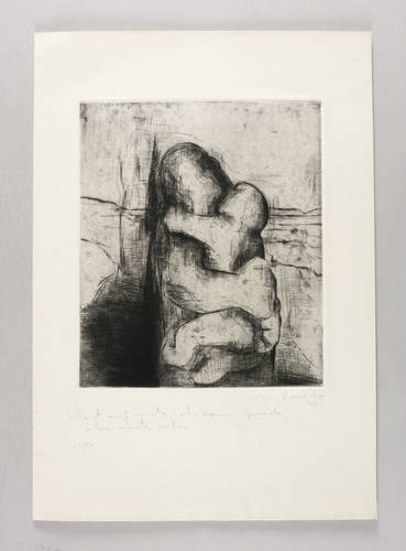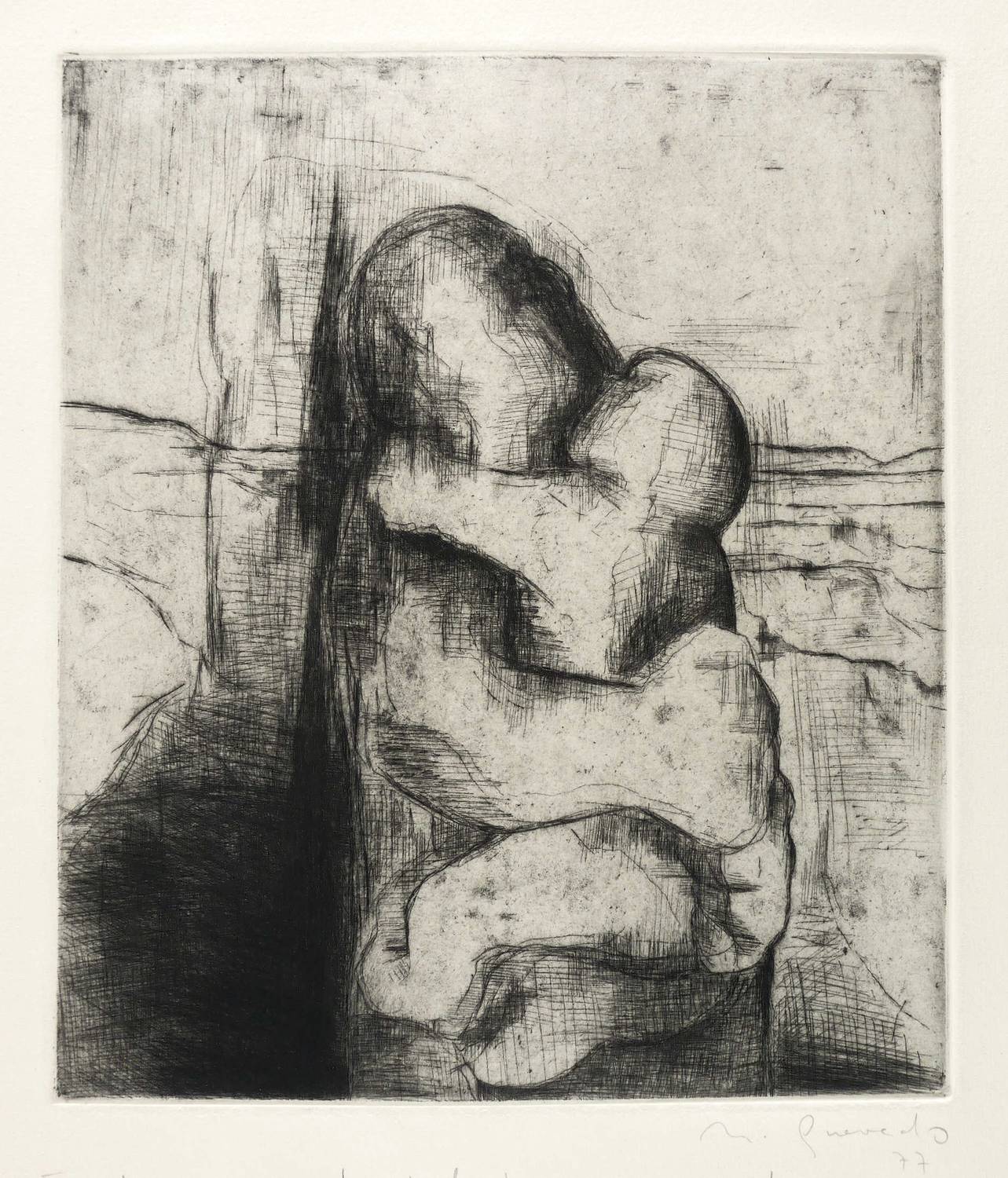 1977. Radierung / Kaltnadel, mit Plattenton, in Schwarz, auf hellgelbem Velinkarton. – Originale Künstlergrafik, von Nuria Quevedo. – Auflage Exemplar Nr. 31/50. – 28,4 x 24,2 cm (Darstellung / Platte), 48 x 34 cm (Blatt).