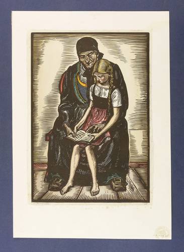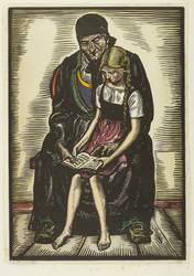 1944. Holzschnitt, in Schwarz, aquarelliert, auf gelblichem Karton. – Originale Künstlergrafik, von Andreas Paul Weber. – 28,2 x 19,6 cm (Darstellung / Druckstock), 38 x 27 cm (Blatt).