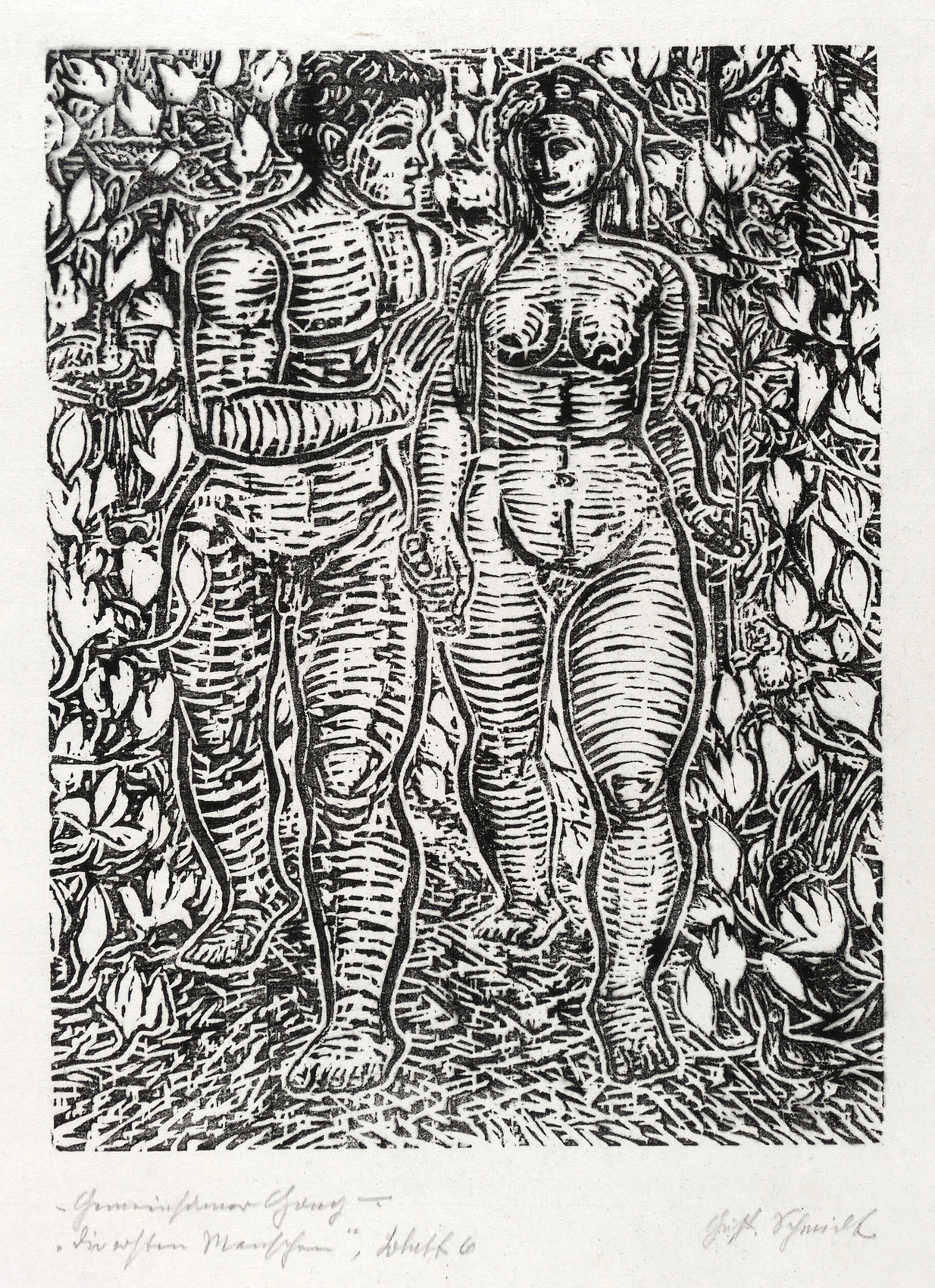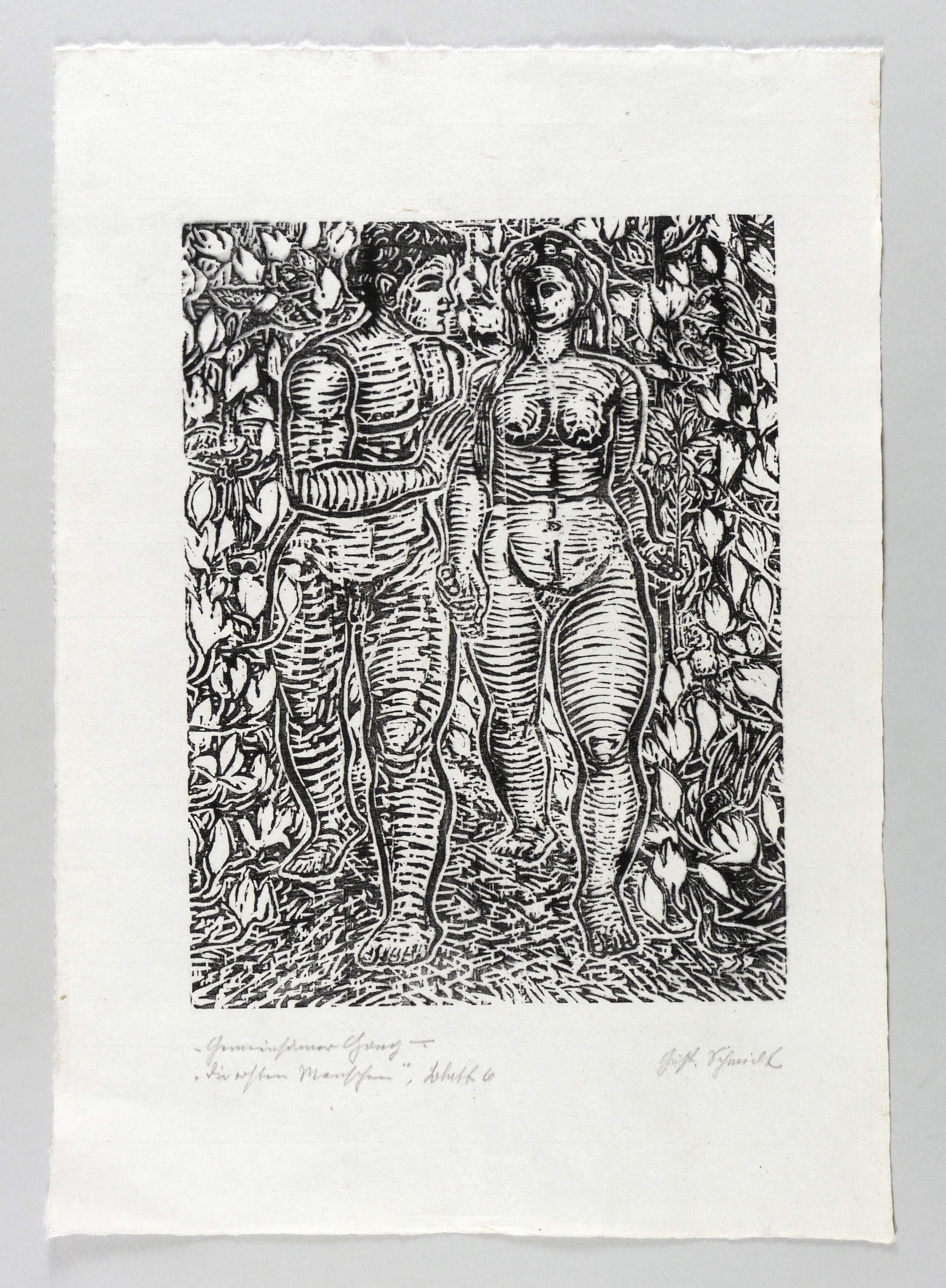 Rechts unten in Bleistift signiert. Links eigenhändig bezeichnet: ″Gemeinsamer Gang. 'Die ersten Menschen', Blatt 6″. – Tadelloser Zustand.