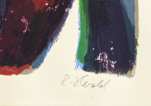 1970. Farbsiebdruck / Farbserigrafie, in 7 Farben, auf glattem hellgelbem Karton. – Originale Künstlergrafik, von Rainer Herold. – 27,0 x 43,0 cm (Darstellung / Druckbild), 31 x 47 cm (Blatt).