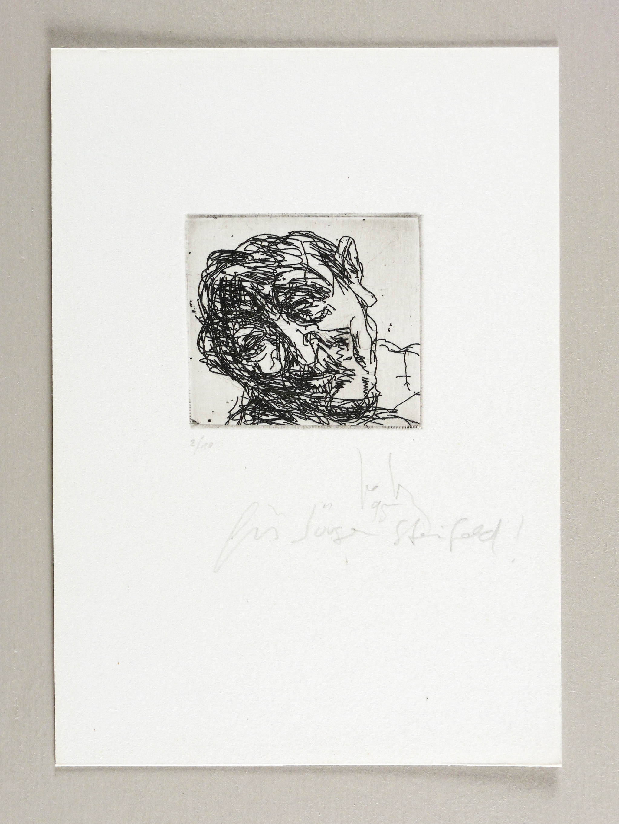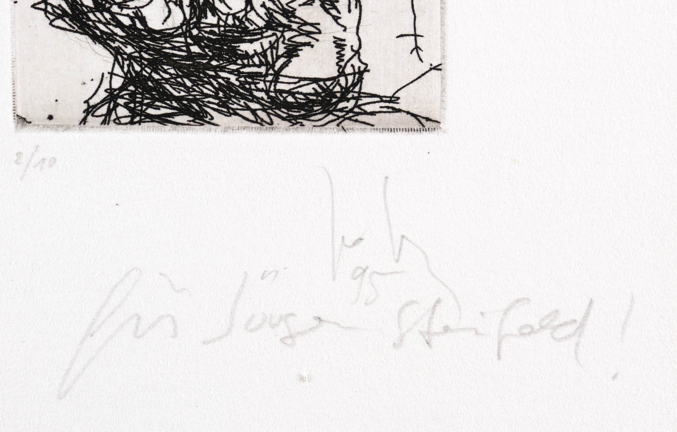 Rechts unten in Bleistift signiert und datiert. Links Auflagenbezeichnung. Dazu Widmung an Jürgen Steinfeld, Oldenburg. – Sehr gut erhalten.