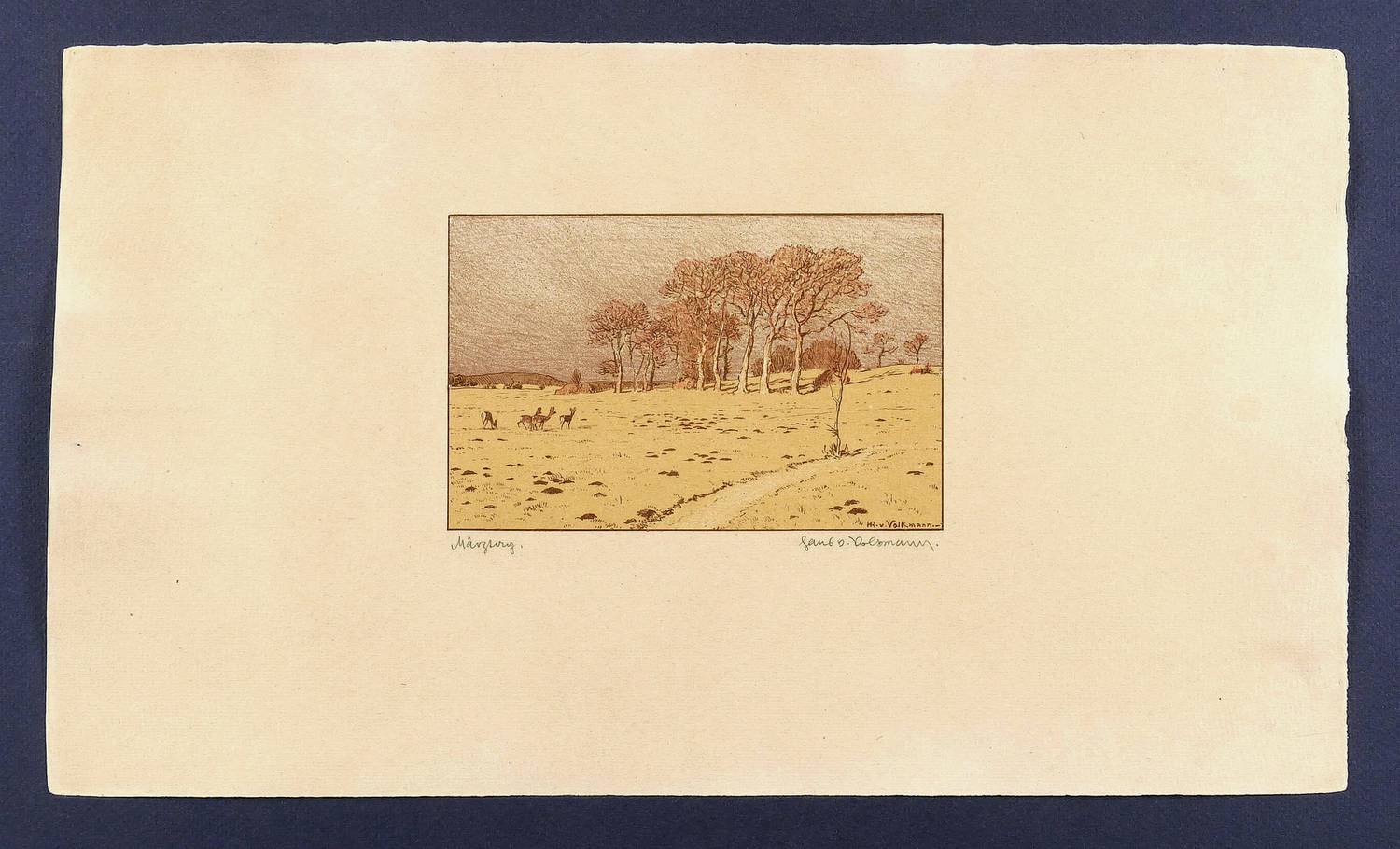 Um 1912. Farblithografie / Kreidelithografie, in 3 Farben, auf sandfarbenem Karton. – Originale Künstlergrafik, von Hans Richard von Volkmann. – 10,0 x 15,6 cm (Darstellung), 24 x 41 cm (Blatt).