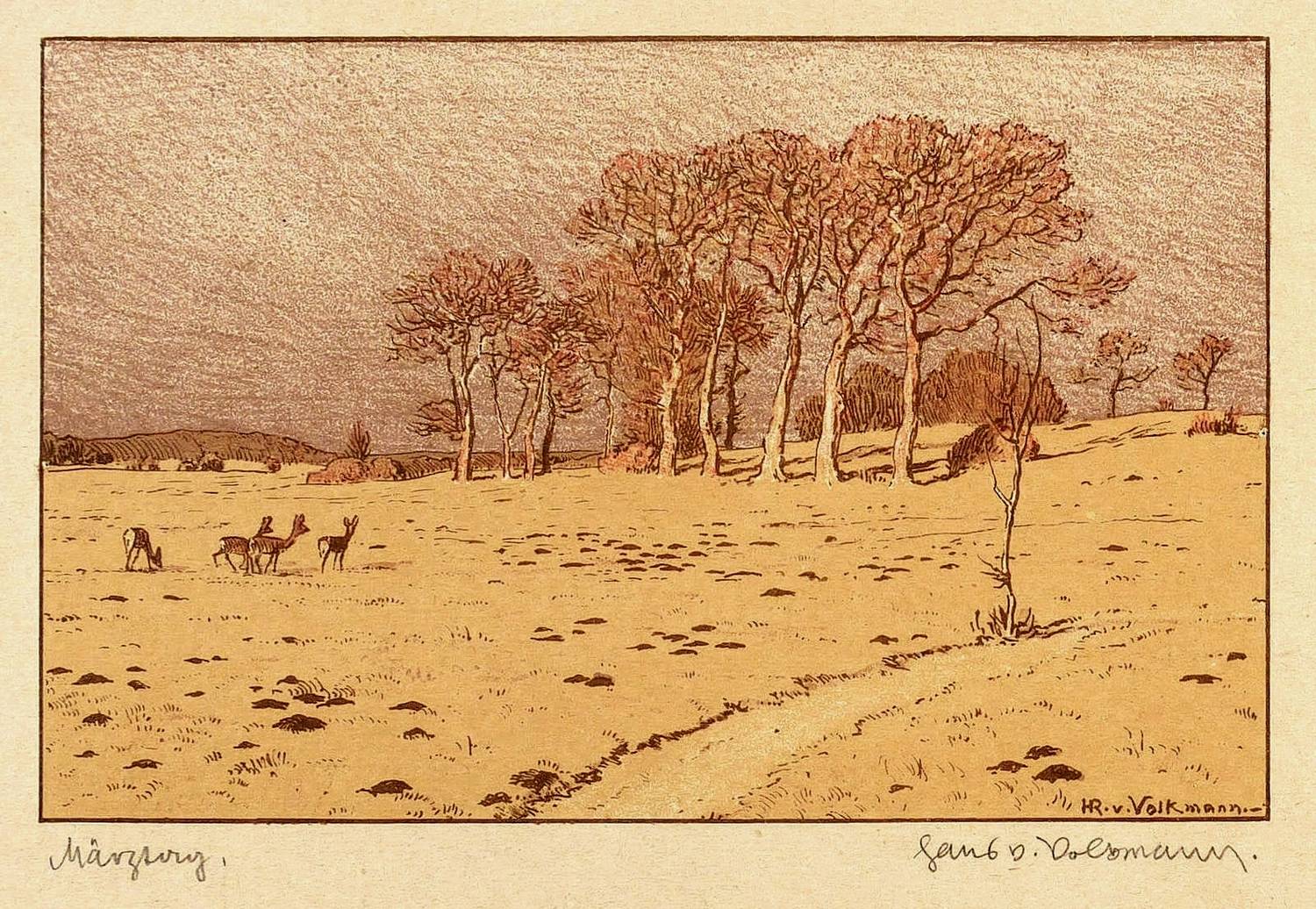 Hans Richard von Volkmann (1860 Halle/Saale - 1927 Halle/Saale). Deutscher Landschaftsmaler und Grafiker. Mitglied der Schwälmer Willingshäuser Malerkolonie. 1880-88 Studium an der Akademie in Düsseldorf. 1892 als Meisterschüler von Gustav Schönleber dem Älteren 1892 an der Kunstschule in Karlsruhe. Entwickelte sich dort zum bedeutendsten Vertreter der sogenannten Karlsruher Landschaftsschule. Seine Farblithografien und Radierungen gehören neben denen von Hans Thoma zum Besten, was diese Schule hervorbrachte.