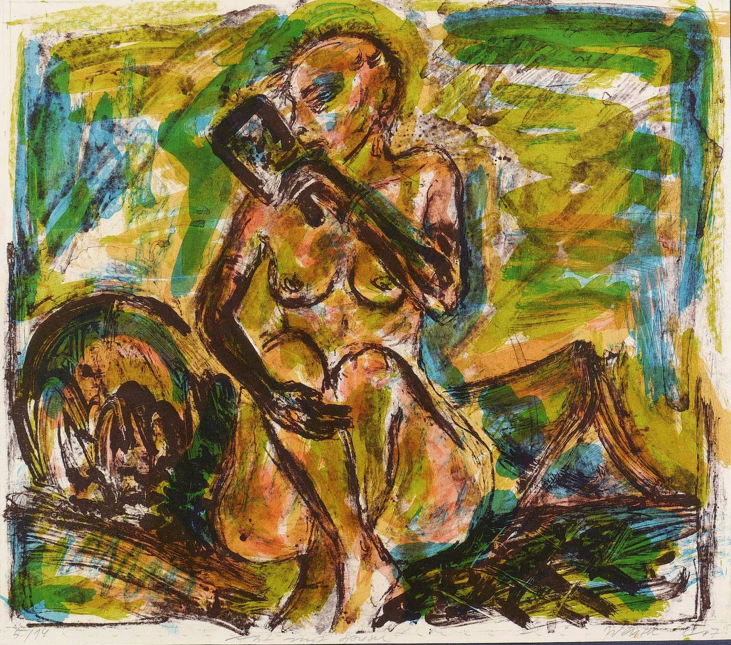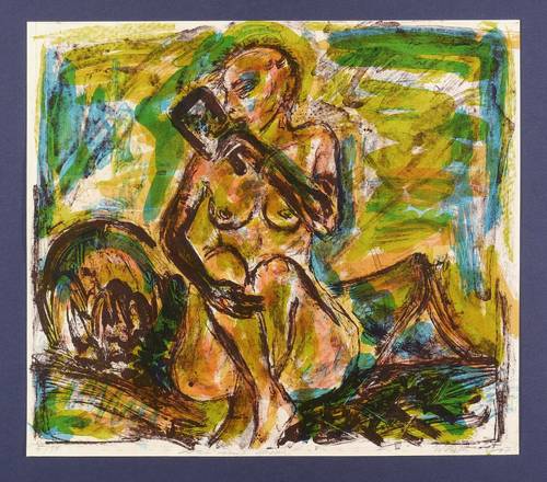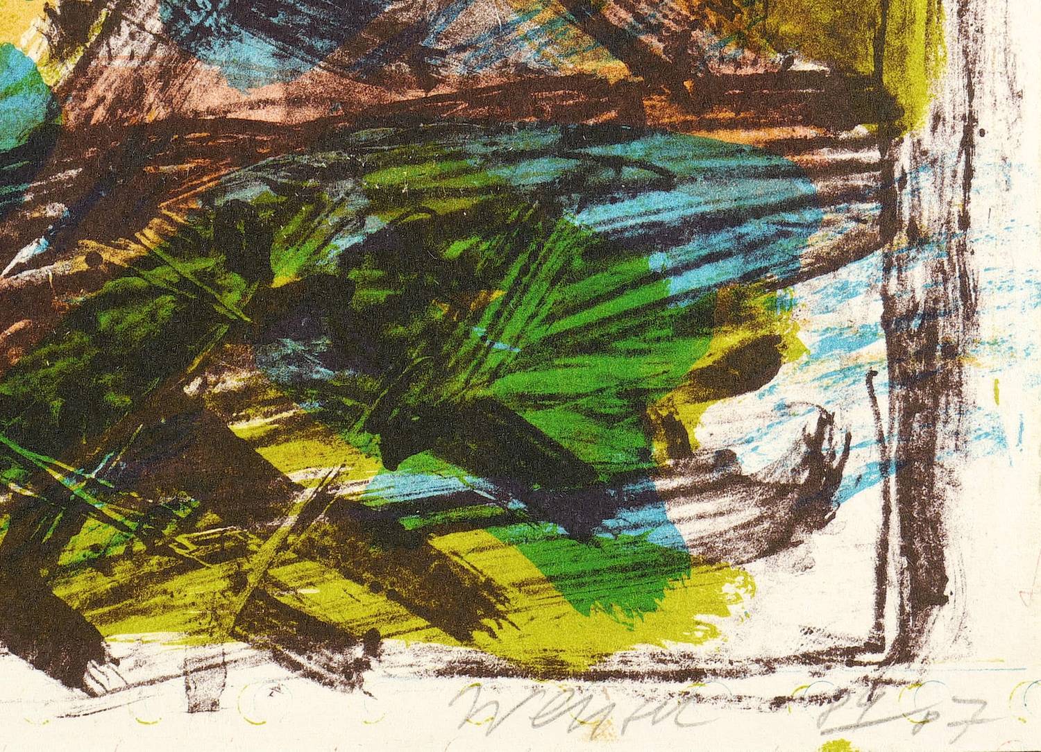 1987. Farbalgrafie / Pinselalgrafie, in 5 Farben, auf hellgelbem Karton. – Originale Künstlergrafik, von Jürgen Wenzel. – Auflage Exemplar Nr. 5/14. – 33,8 x 38,5 cm (Darstellung / Druckbild), 34,4 x 39,0 cm (Blatt).