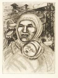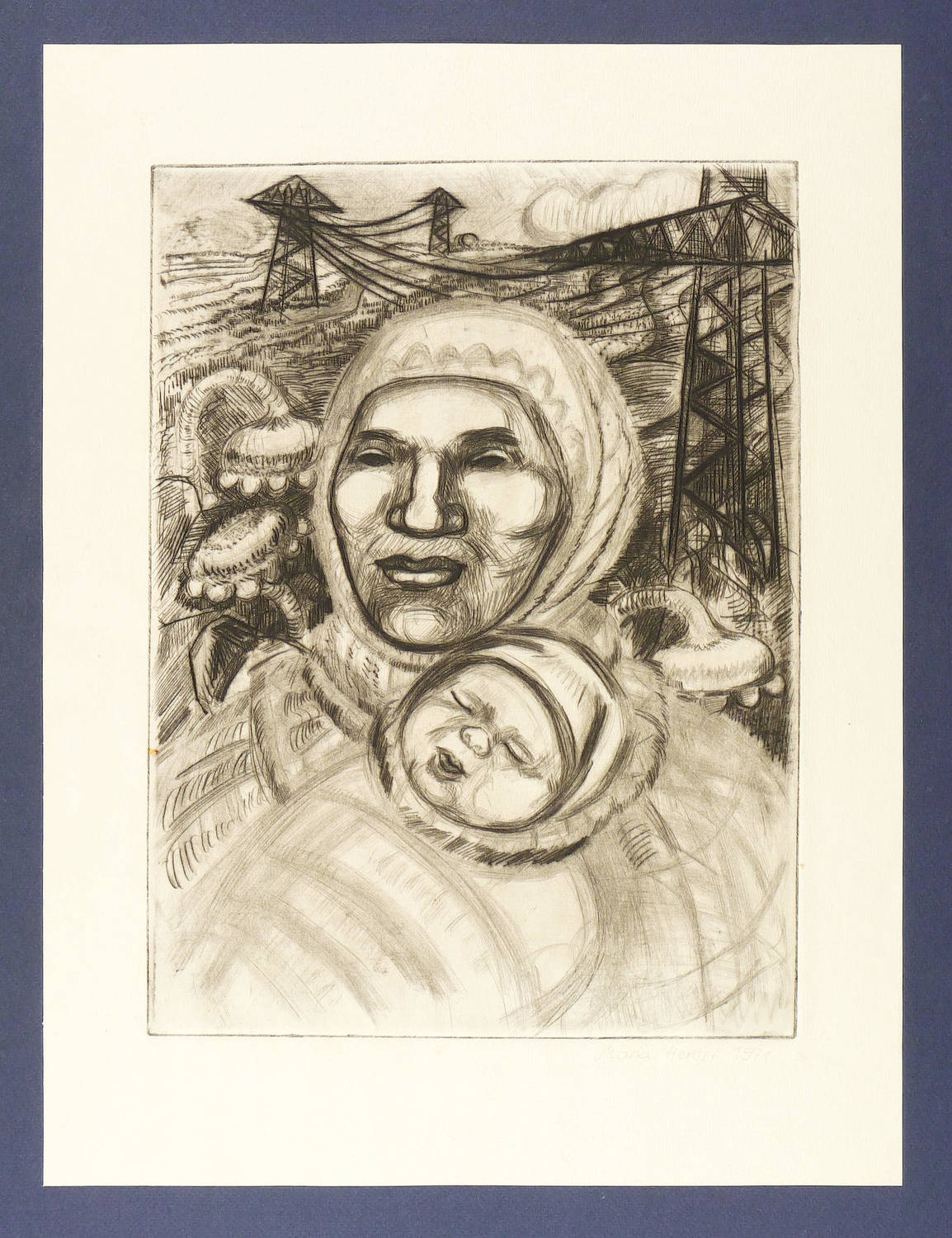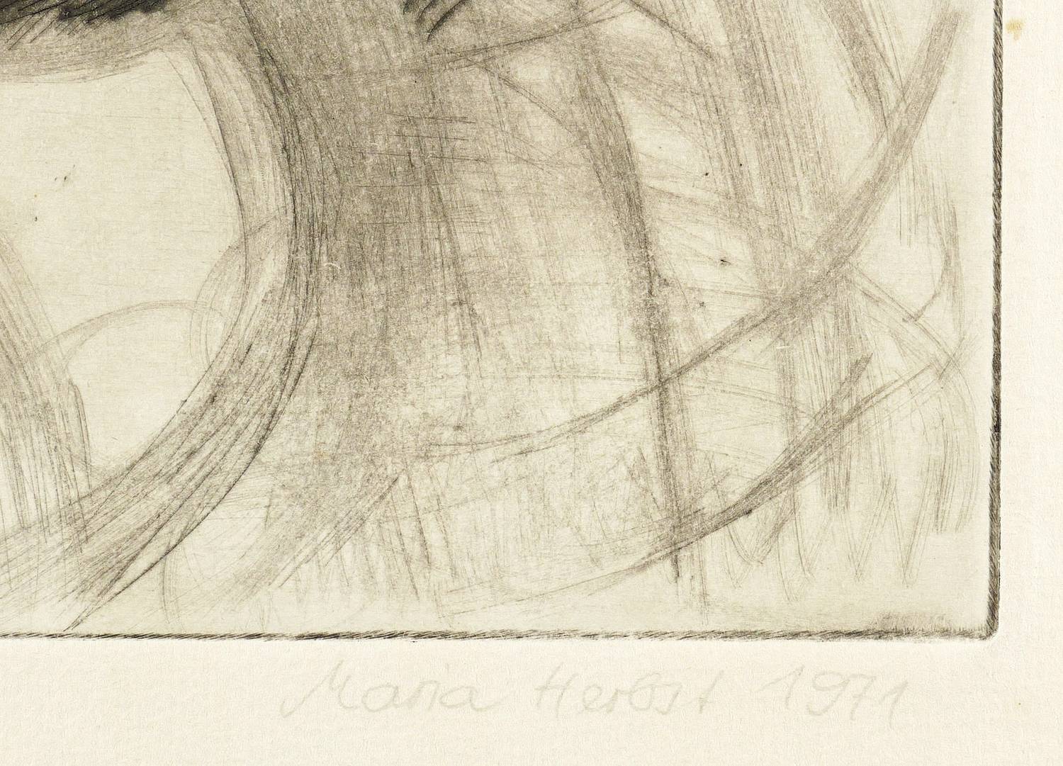 1971. Radierung / Kaltnadel, in Schwarz, auf chamois Weißenborn-Bütten. – Originale Künstlergrafik, von Maria Laufer-Herbst. – 35,2 x 26,1 cm (Darstellung / Platte), 46 x 35 cm (Blatt).