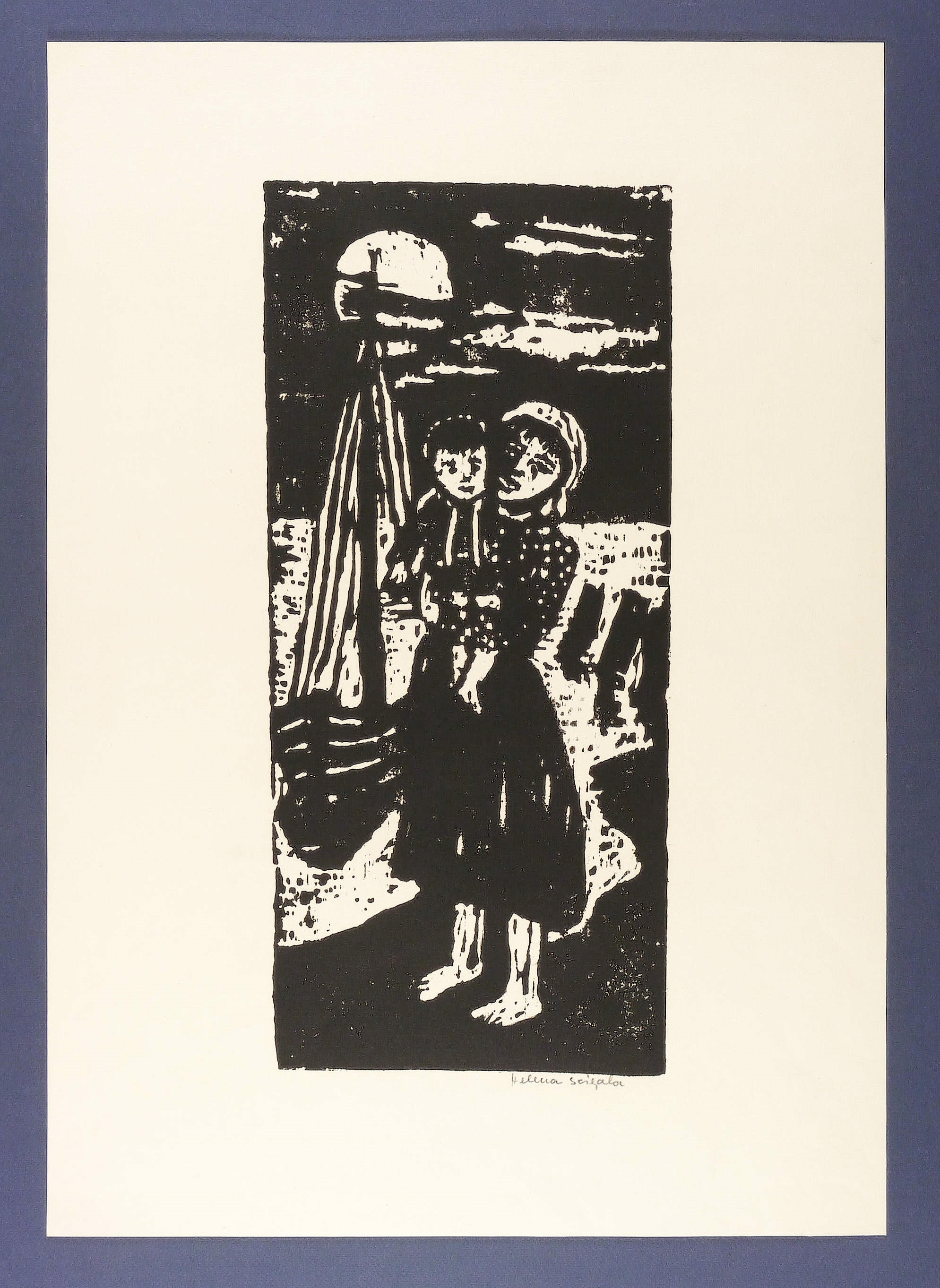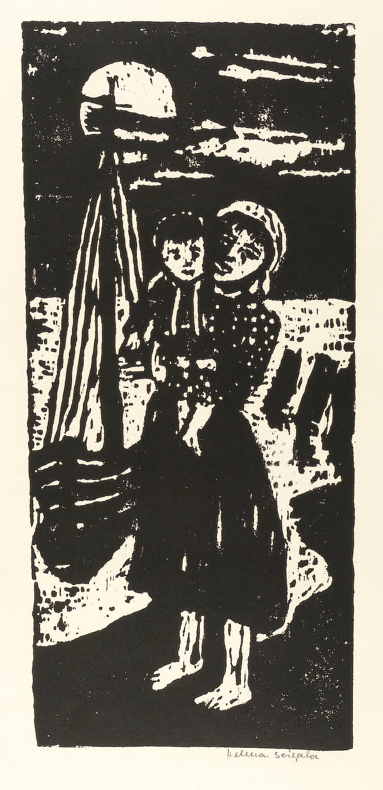 Um 1960. Holzschnitt, in Schwarz, auf rauem gelblichem Karton. – Originale Künstlergrafik, von Helena Scigala. – 49,1 x 22,0 cm (Darstellung / Druckstock), 66 x 46 cm (Blatt).