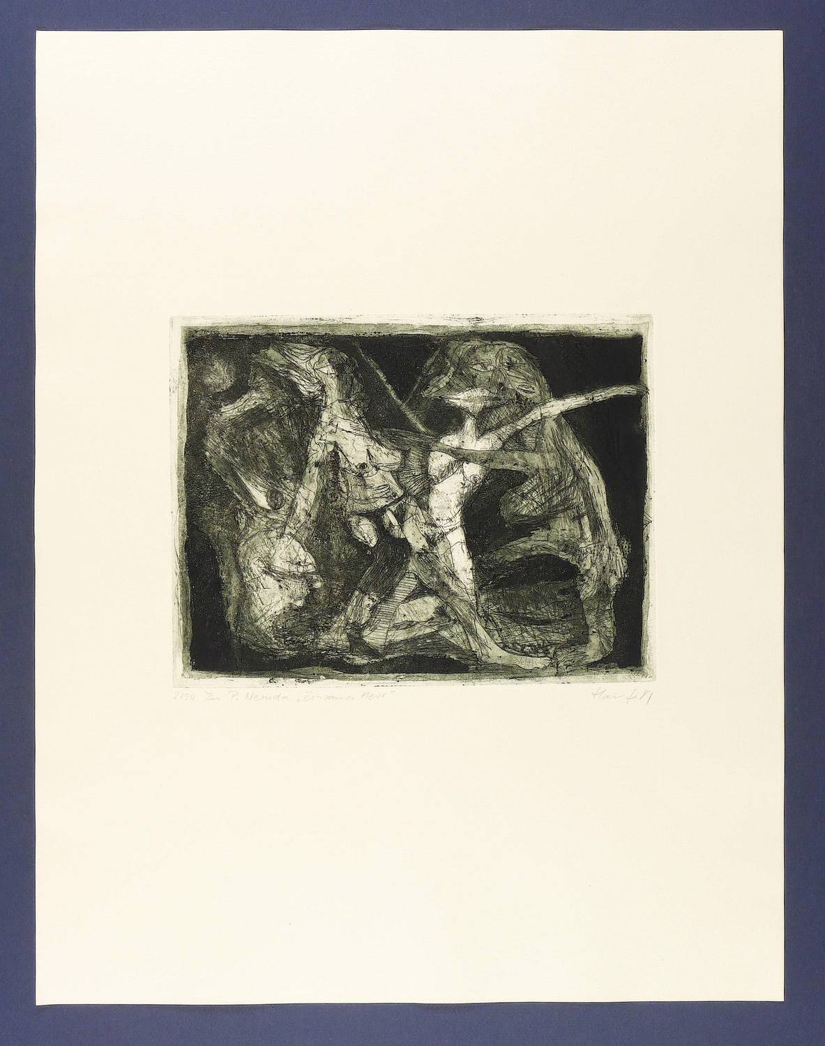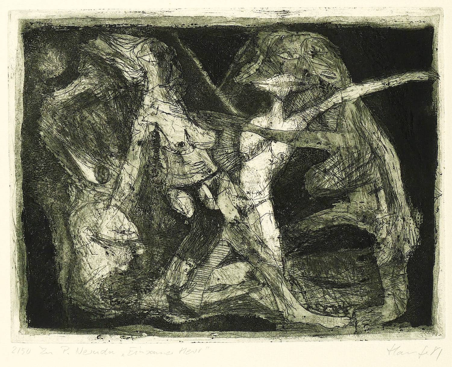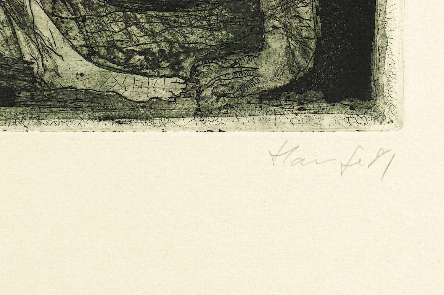 1981. Radierung / Aquatinta & Strichätzung, in Grünschwarz, auf hellchamois Weißenborn-Bütten. – Originale Künstlergrafik, von Jürgen Haufe. – Auflage Exemplar Nr. 2/50. – 24,6 x 32,2 cm (Darstellung / Platte), 65 x 50 cm (Blatt).