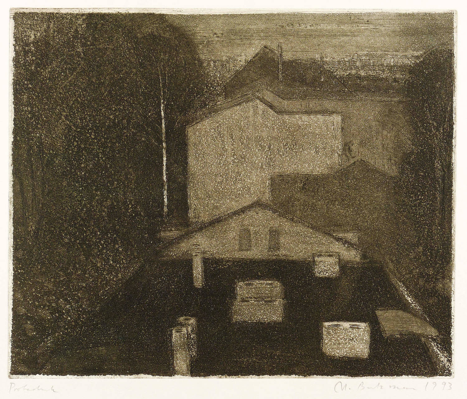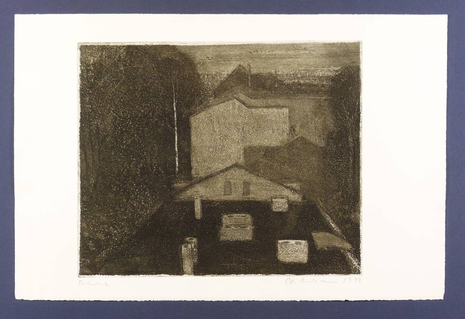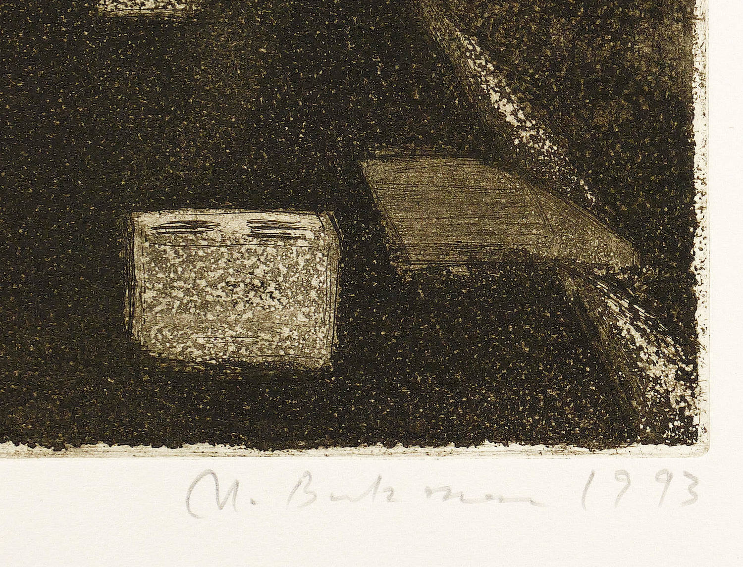 1993. Radierung / Aquatinta, in Schwarzbraun, auf hellgelbem Büttenkarton. – Originale Künstlergrafik, von Manfred Butzmann. – Probedruck. – 32,7 x 39,7 cm (Darstellung / Platte), 40 x 60 cm (Blatt).