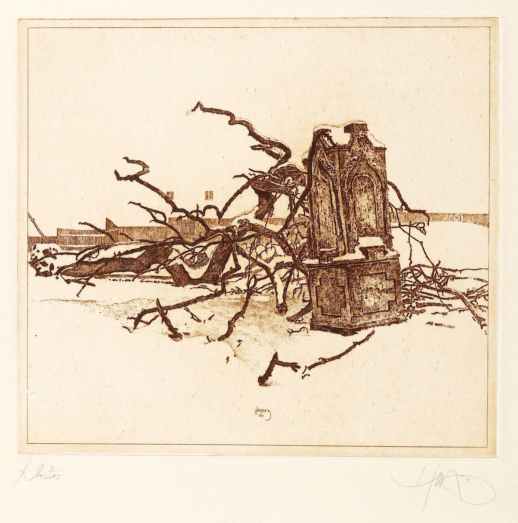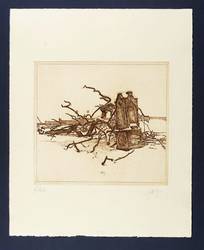1984. Radierung / Strichätzung, in Rotbraun, mit Plattenton, auf Büttenpapier. – Originale Künstlergrafik, von Walter Herzog. – Künstlerexemplar (e.a.). – 26,7 x 29,2 cm (Darstellung / Platte), 49 x 39,5 cm (Blatt).
