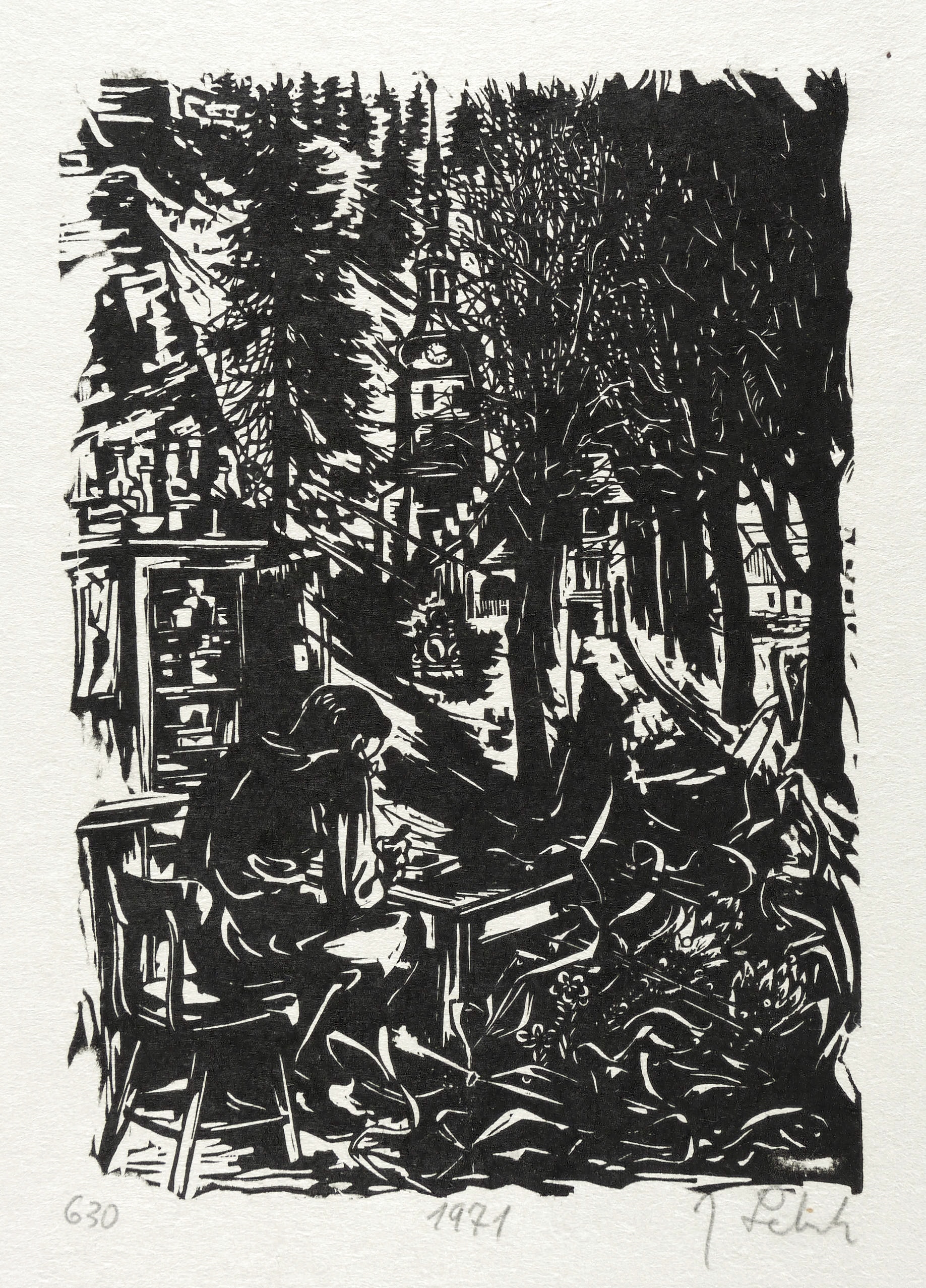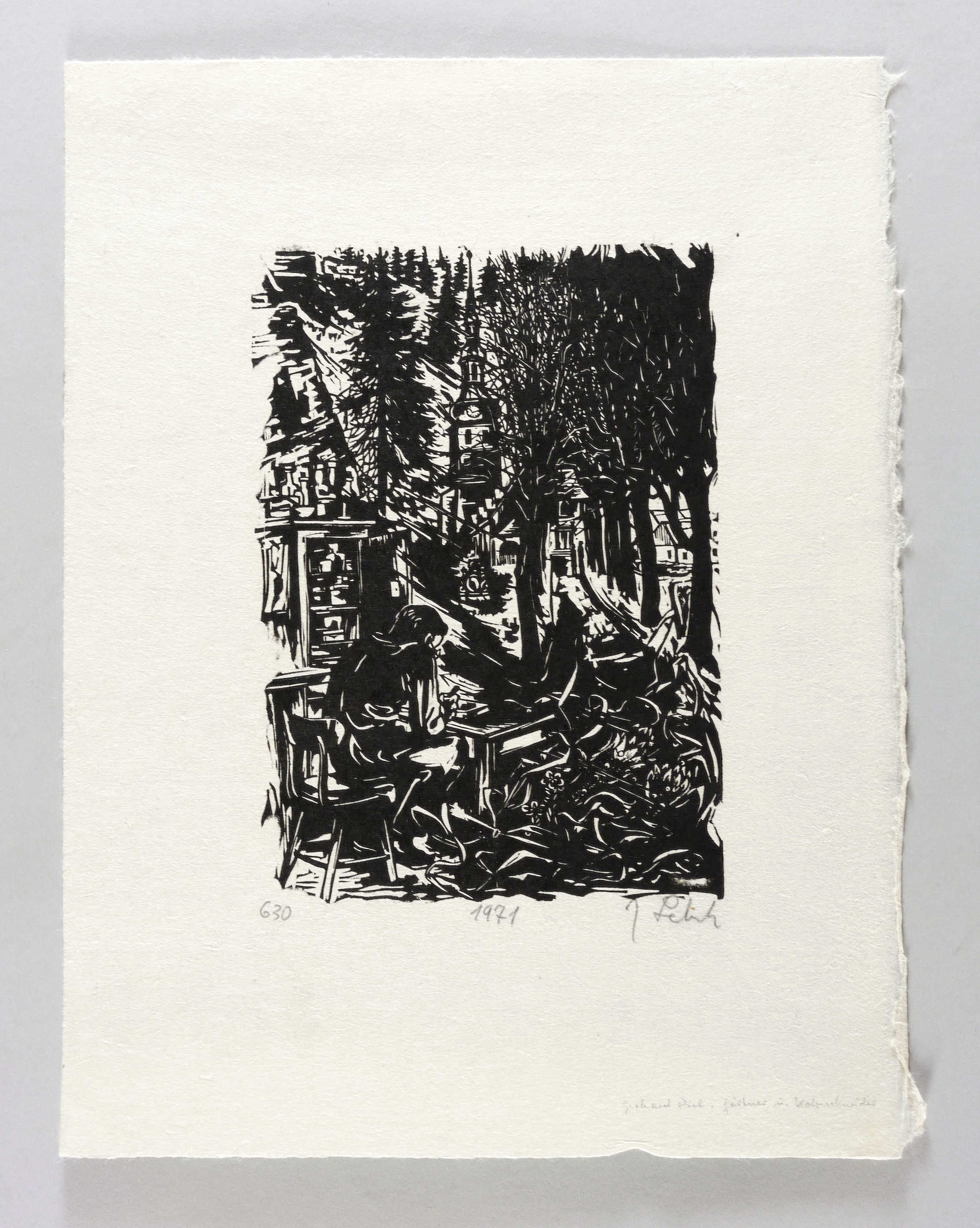 1971. Holzschnitt, in Schwarz, auf rauem weißlichem Japanbütten. – Originale Künstlergrafik, von Johannes Lebek. – 24,3 x 17,2 cm (Darstellung / Druckstock), 40 x 31 cm (Blatt).