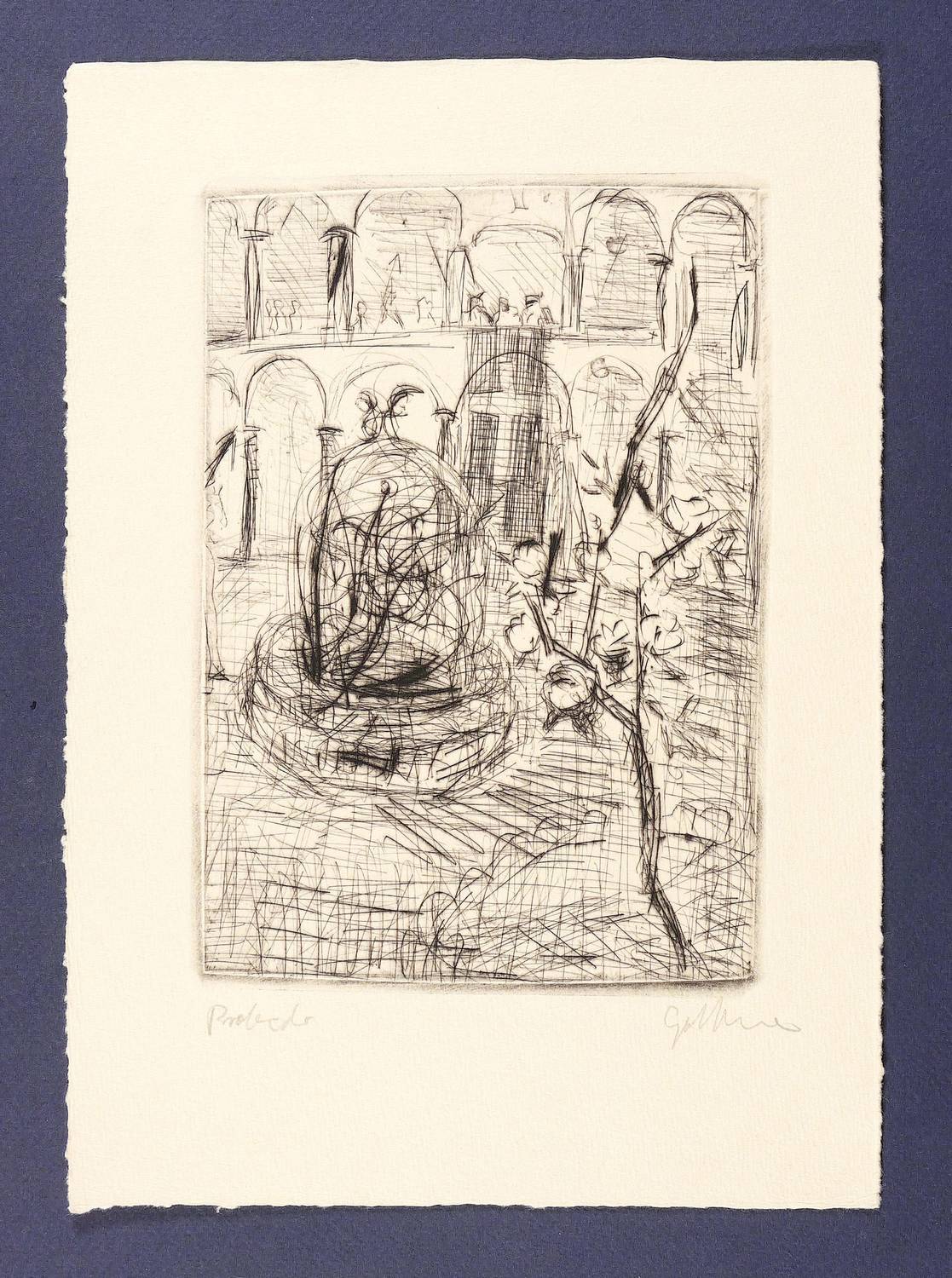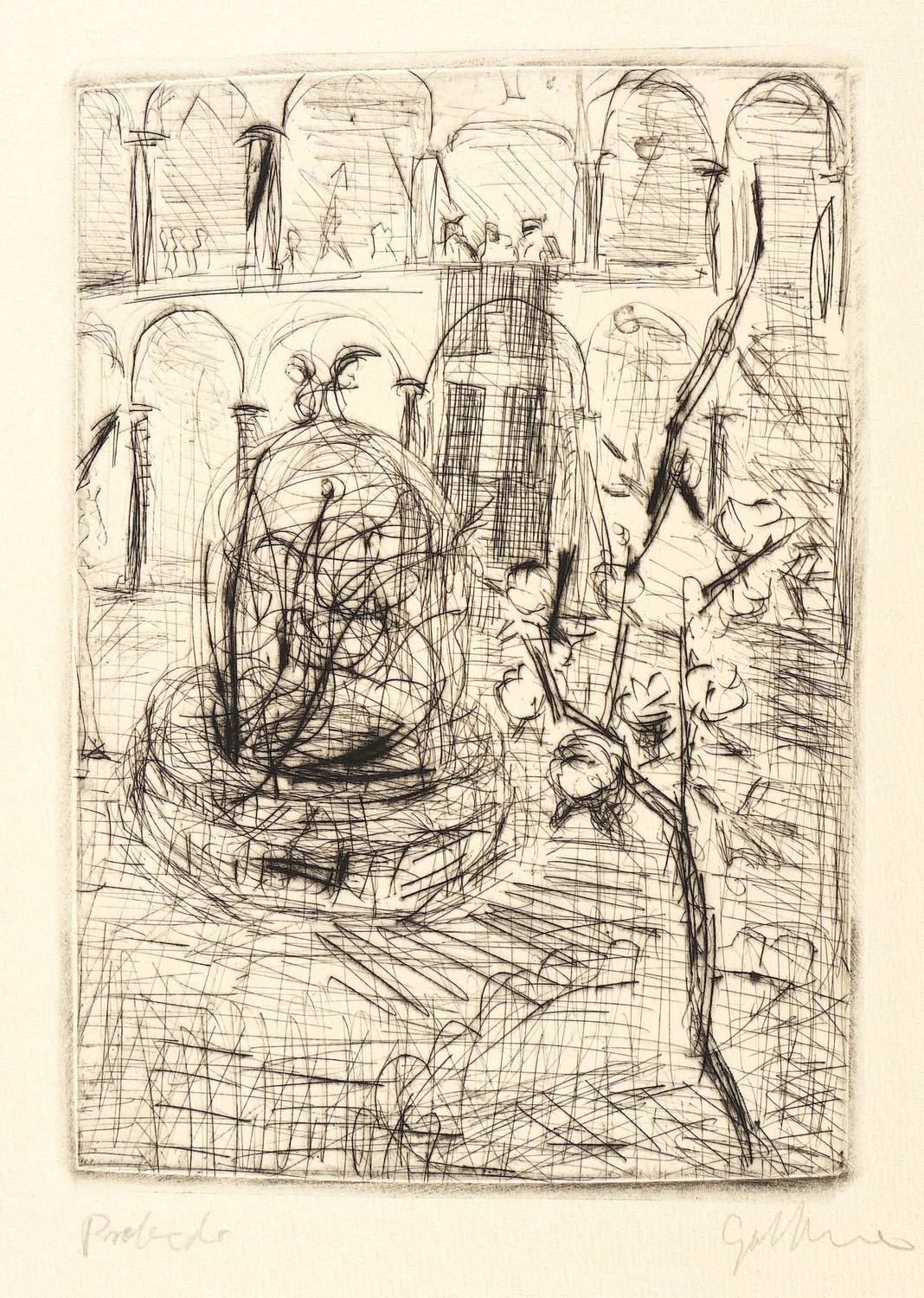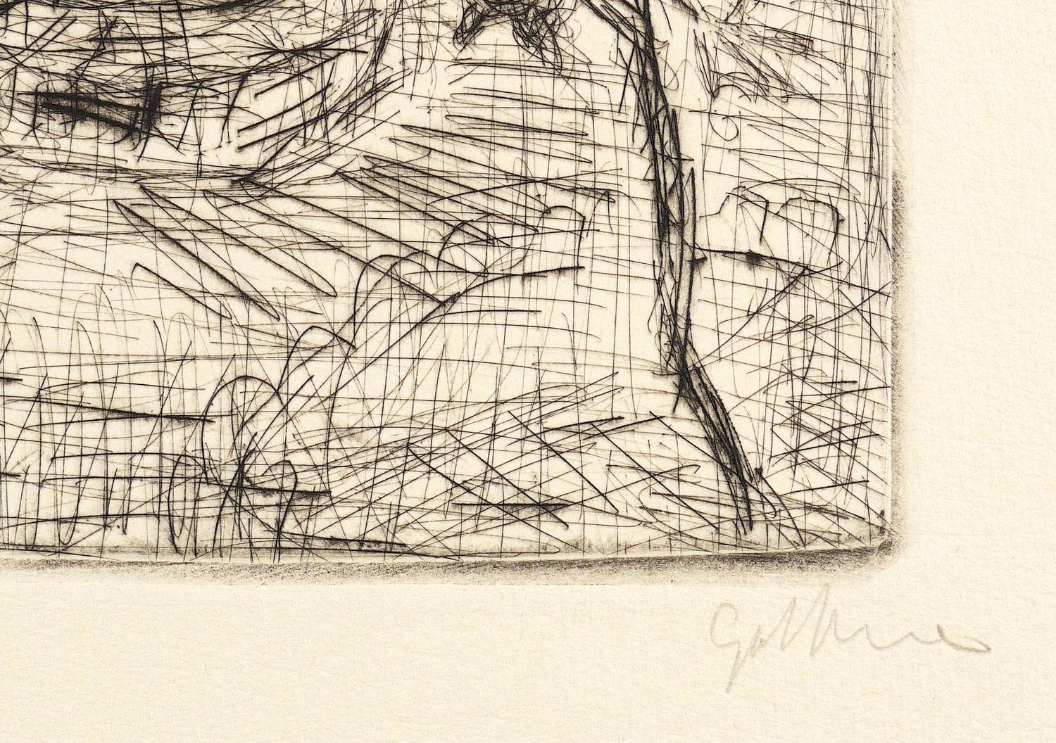 Um 1990. Radierung / Kaltnadel, in Schwarz, auf gelblichem Büttenkarton. – Originale Künstlergrafik, von Dieter Goltzsche. – Probedruck. – 20,0 x 14,0 cm (Darstellung / Platte), 28 x 20 cm (Blatt).