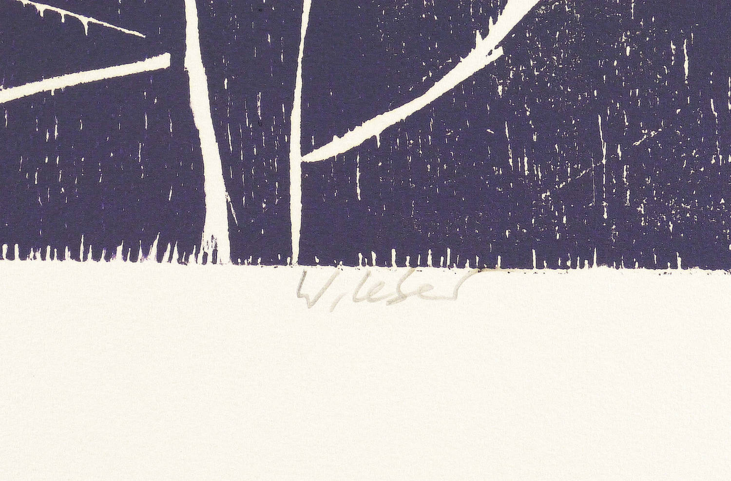 1994. Holzschnitt, in Anthrazit, auf hellgelbem Büttenkarton. – Originale Künstlergrafik, von Wolfgang Leber. – 21,4 x 27,6 cm (Darstellung / Druckstock), 54 x 37 cm (Blatt).